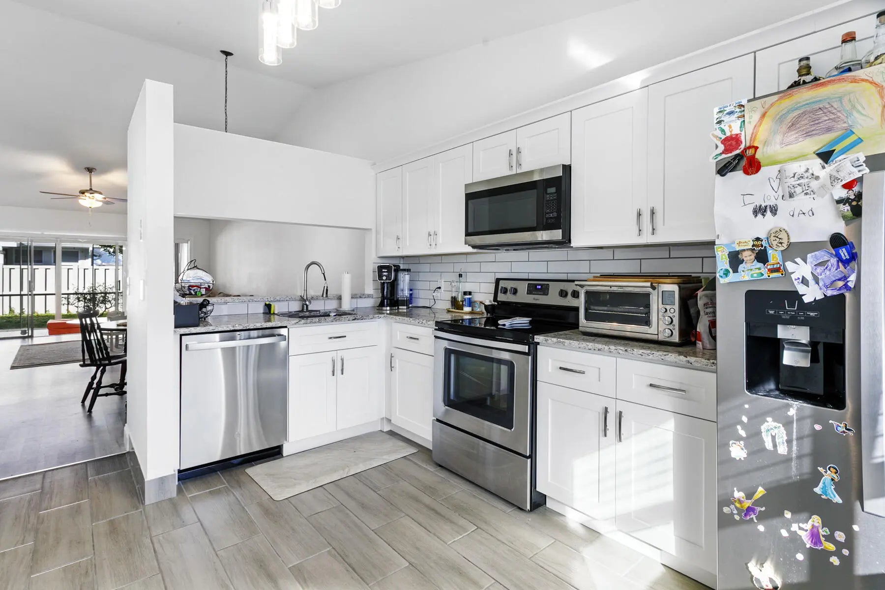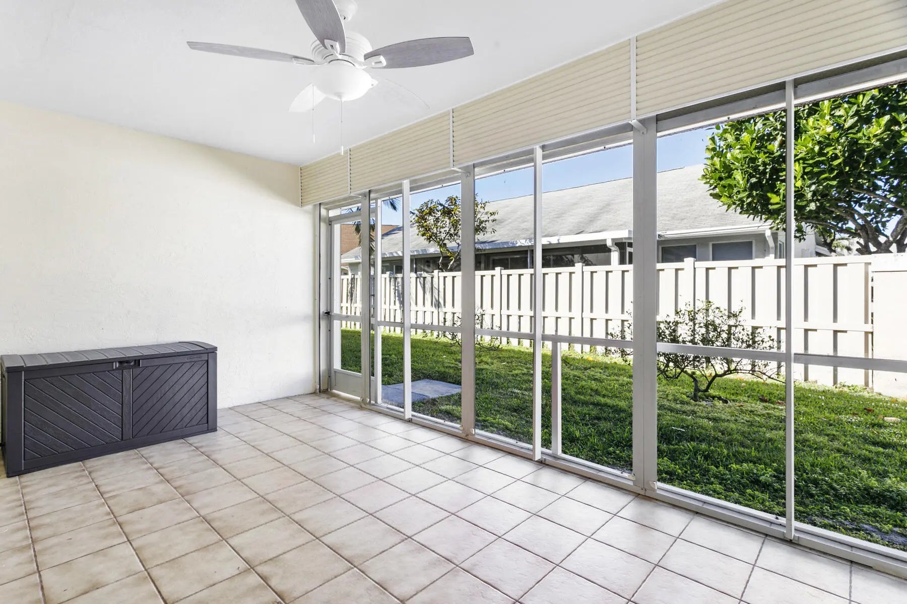 Nestled on a quiet street, this turnkey CBS townhouse has been thoughtfully updated with everyday comfort in mind. The open-concept layout features vaulted ceilings and clear sightlines from the kitchen, creating an airy sense of space throughout. The screened-in entryway and covered patio invite the gentle cross-breeze, while extending the home's usable square footage for entertaining and everyday enjoyment. New impact windows provide added comfort, and protection for peace of mind. Extra added-value: split floor plan, spacious primary suite with walk-in closet, new water heater and washer, and new kitchen appliances. Located in the dog-friendly Indian Creek community, residents enjoy low HOA dues (lawn care, cable & common areas) and a prime location - close to everything including Golf Club of Jupiter public course, Indian Creek Swim & Tennis Club, dining, shopping, sports & entertainment, and, of course, the beautiful beaches.