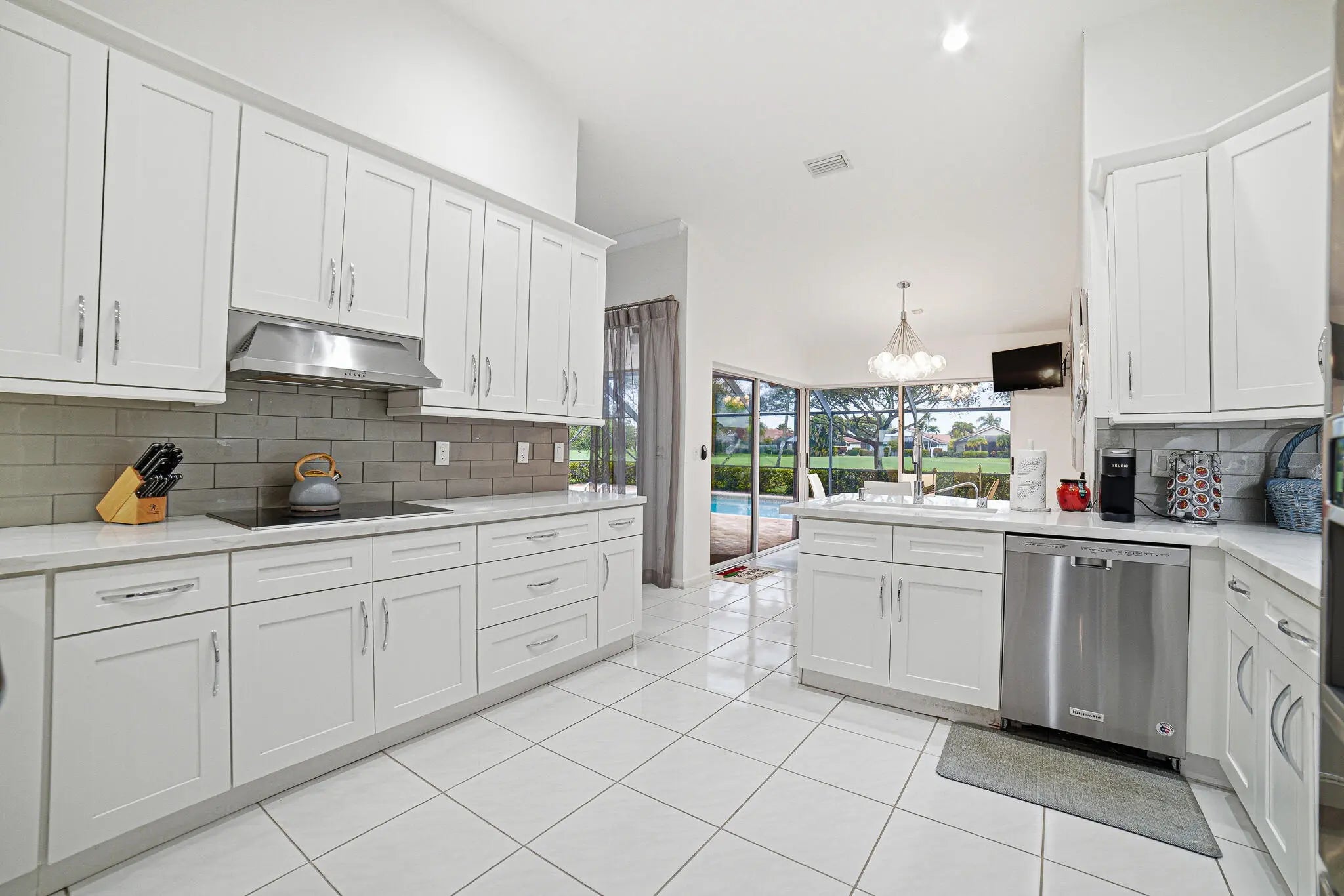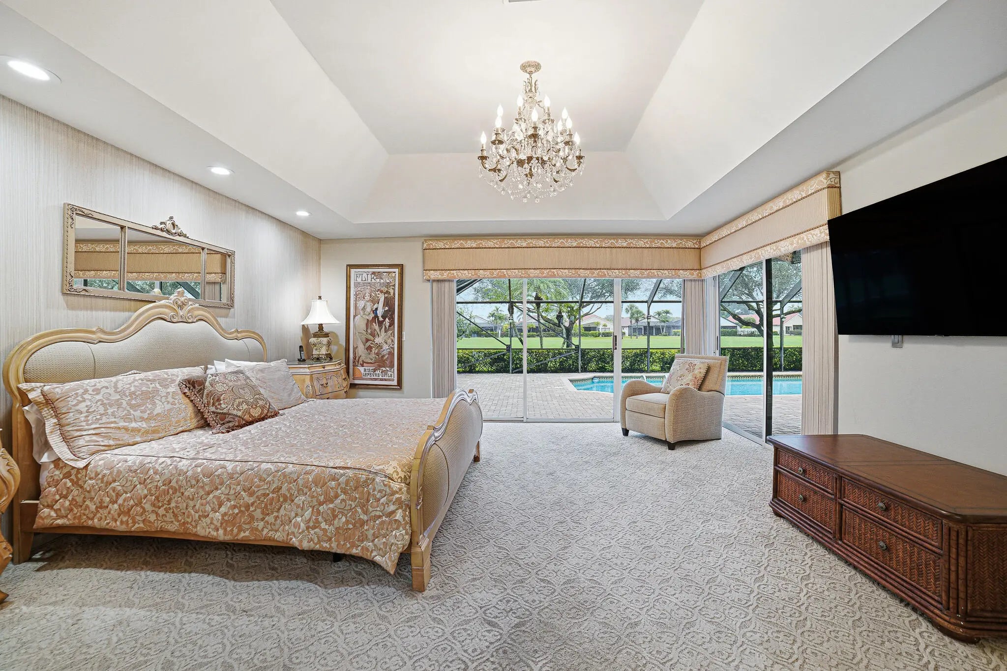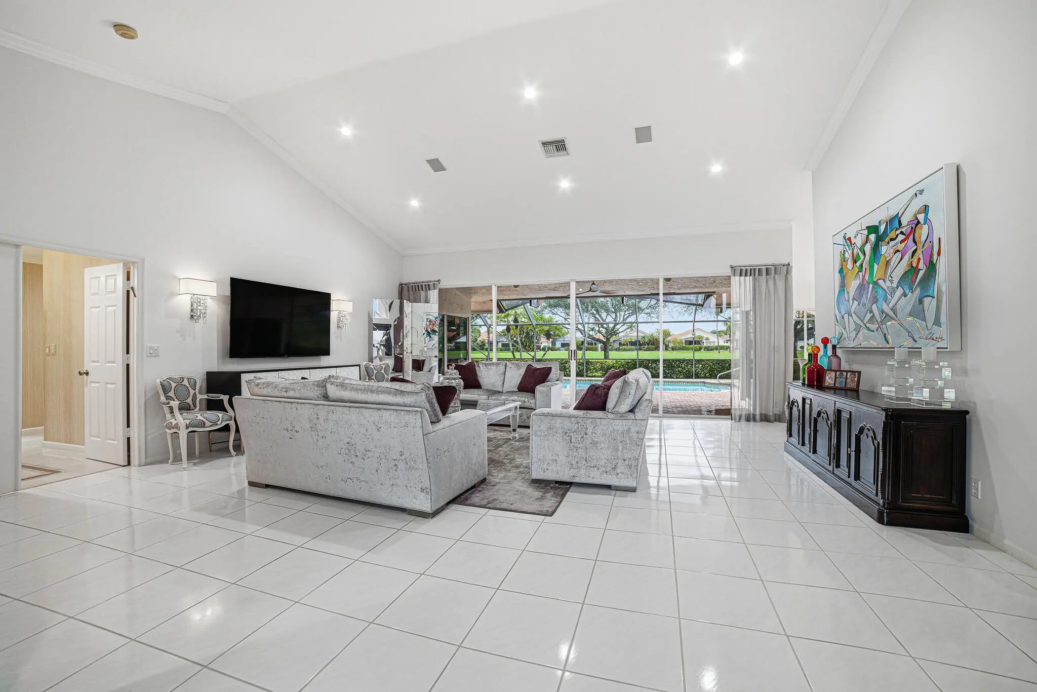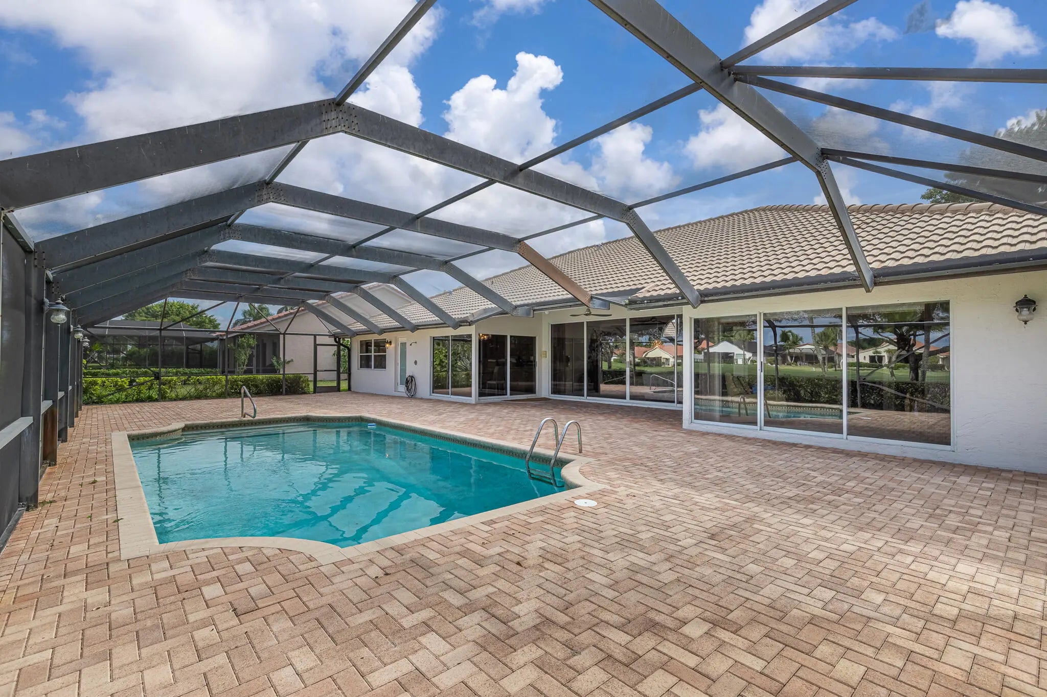 This stunning single-family home is located in the heart of Boca Woods Country Club (mandatory membership of $120,000). Situated in a peaceful cul-de-sac with south exposure, this property offers breathtaking views and a huge screened pool area. The home features an extended Brittany floor plan, which is ideal for those looking for a very private master bedroom. The master suite includes a luxurious bathroom with a freestanding tub and marble floors, as well as a private office. The second bathroom is also a convenient cabana bath.Additional highlights include:- Living Space: A large open floor plan with a great dining area and an inviting media room.- Gourmet Kitchen: An immaculate chef's kitchen featuring a double wall oven and a breakfast area with fantastic views. An in-door laundry room and a two-car garage with a separate golf cart garage. Exceptions: Sconces in living room, dining room fixture, master bedroom fixture and kitchen fixture