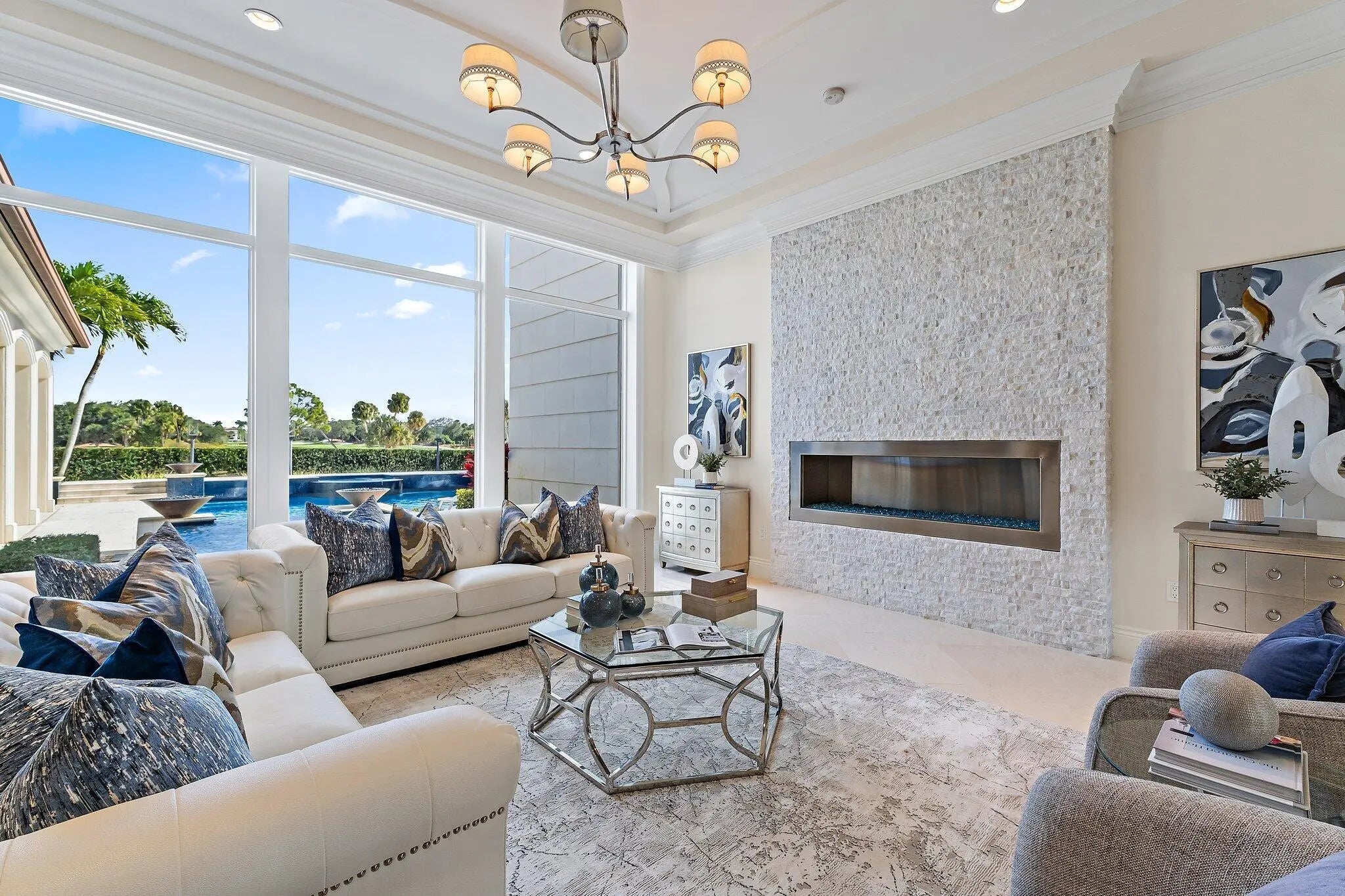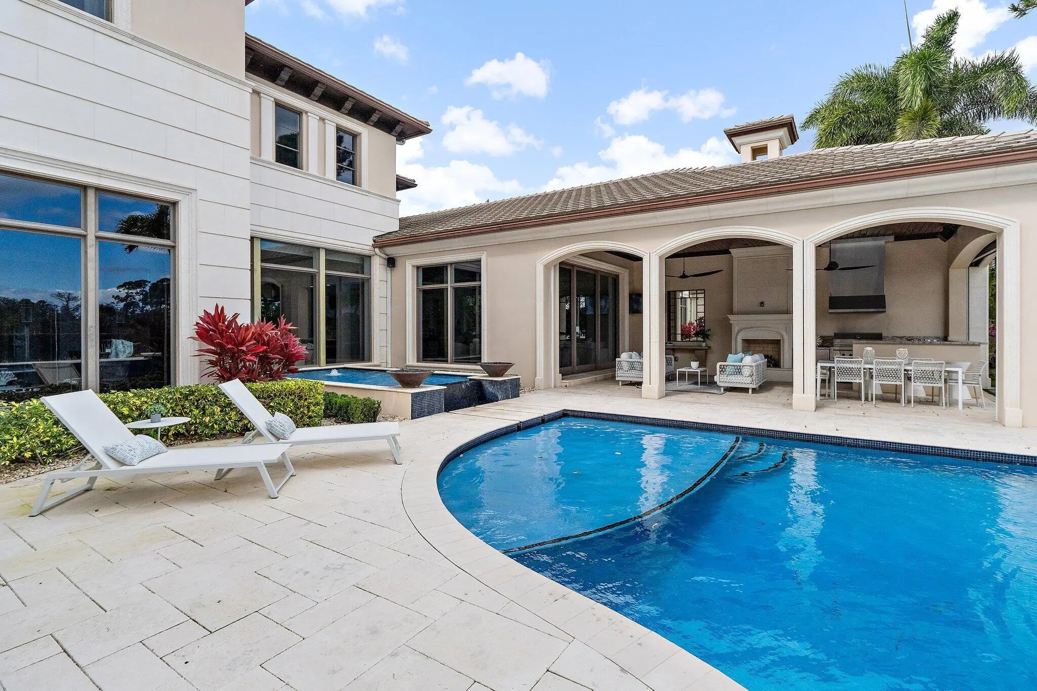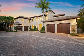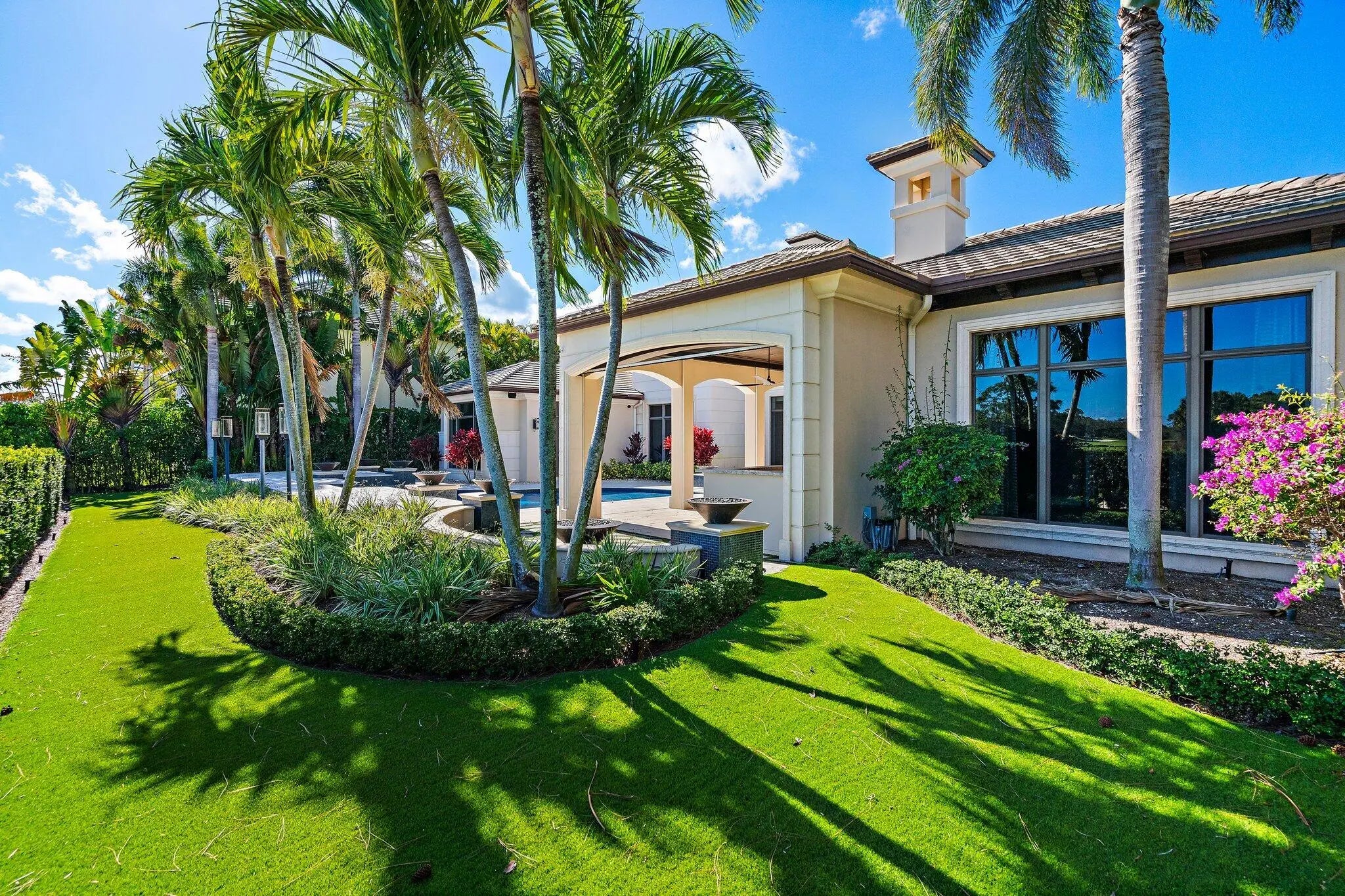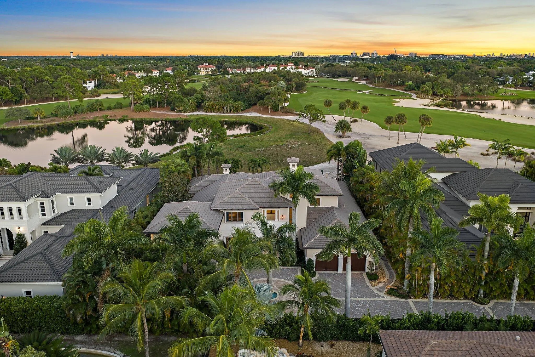 Exquisite two-story estate located in the prestigious Old Palm Golf Club. This exceptional residence offers nearly 7,400 sf of refined, modern living space, set on a half-acre lot with breathtaking golf course views. The home features five bedrooms plus an expansive office, spacious media room, and a total of 6 full and 2 half bathrooms. Upon entry, dramatic exterior water features and sweeping golf course vistas are revealed through an entire wall of floor-to-ceiling windows, complemented by soaring ceilings that enhance the home's grandeur. The elegant interior showcases arched doorways, a family room with a sleek modern fireplace, formal dining room, and a temperature-controlled wine room, all accented by stunning marble and luxurious wood flooring throughout, creating a sophisticated yet welcoming ambiance. The chef's kitchen opens effortlessly to the main entertaining areas, offering a seamless indoor-outdoor living experience. It is beautifully appointed with quartz countertops, double islands, rich wood-beam ceiling accents, a six-burner gas range, premium Thermador appliances, and a built-in Miele coffee maker. The first-floor primary suite is a private retreat, featuring custom wood built-in, a tray ceiling, and floor-to-ceiling windows overlooking the beautiful grounds. The luxurious spa-inspired his and her primary bathrooms offer dual custom walk-in closets, spacious glass-enclosed shower, and a soaking tub framed by picturesque garden views. The first level includes the primary suite, main living spaces, a private office, and a media/club room. The second floor hosts three ensuite bedrooms with a loft or office space along with a separate guest suite with separate access providing ultimate privacy. Outdoor living is equally impressive, featuring serene golf and lake views, a saltwater pool, summer kitchen, phantom screens, gas fire pit, and striking poolside torches and cascading water elements perfect for year-round enjoyment. Other notable highlights include a private elevator, 4.5-car garage with lifts, and thoughtfully designed spaces ideal for both everyday living and grand entertaining. This home with complete impact windows & modern conveniences seamlessly blends luxury, comfort, and sophistication in one of Palm Beach Gardens' most coveted communities.