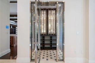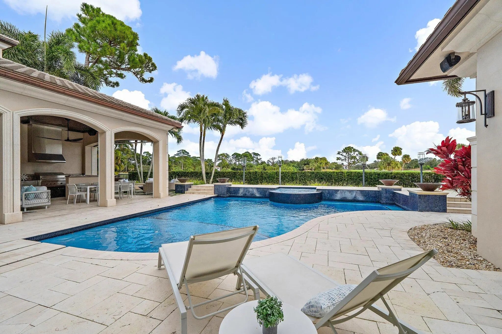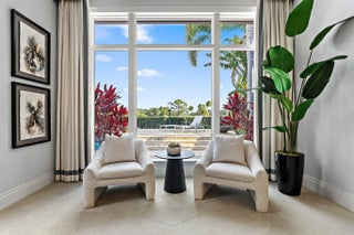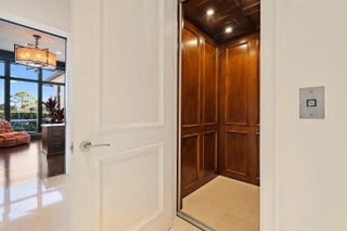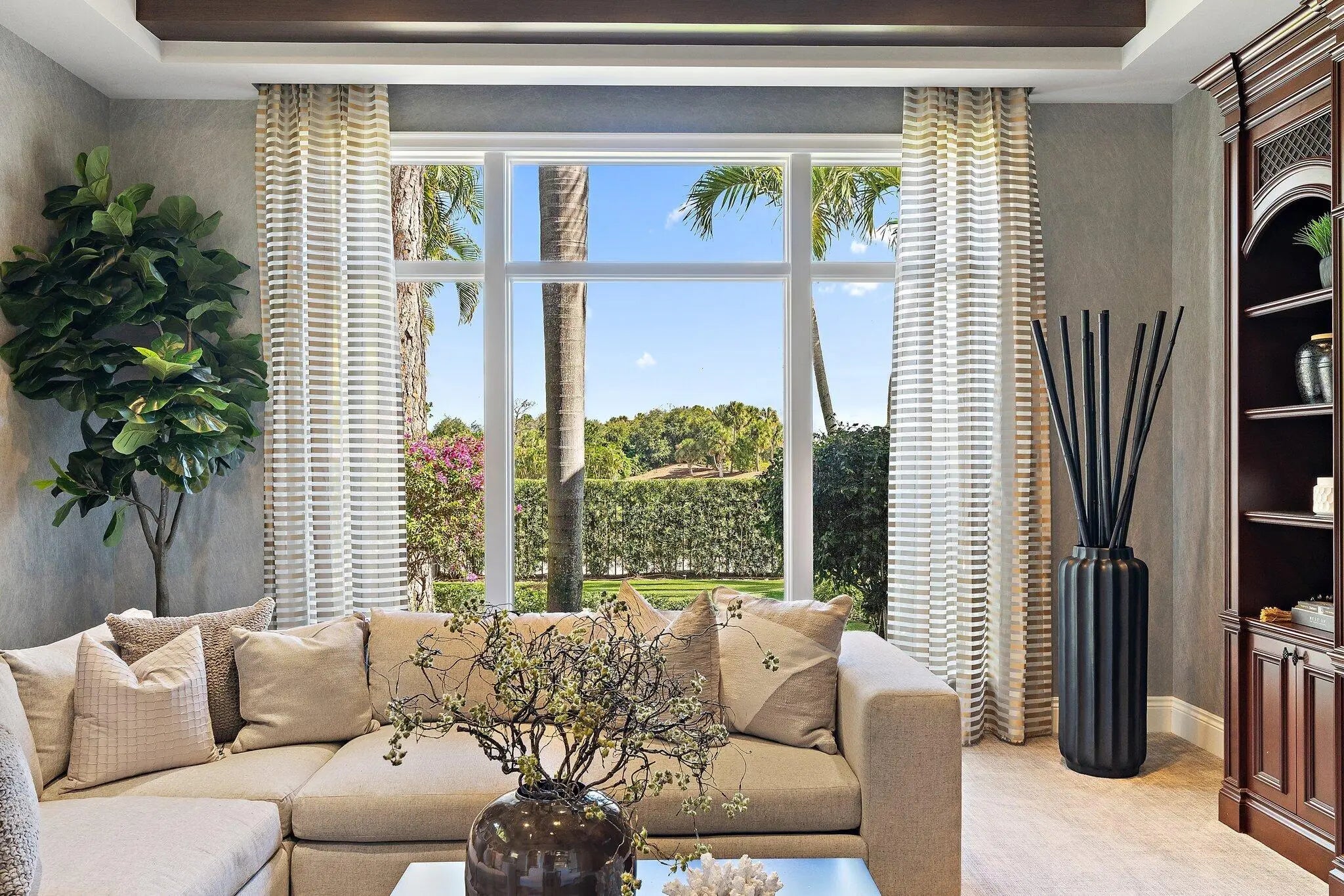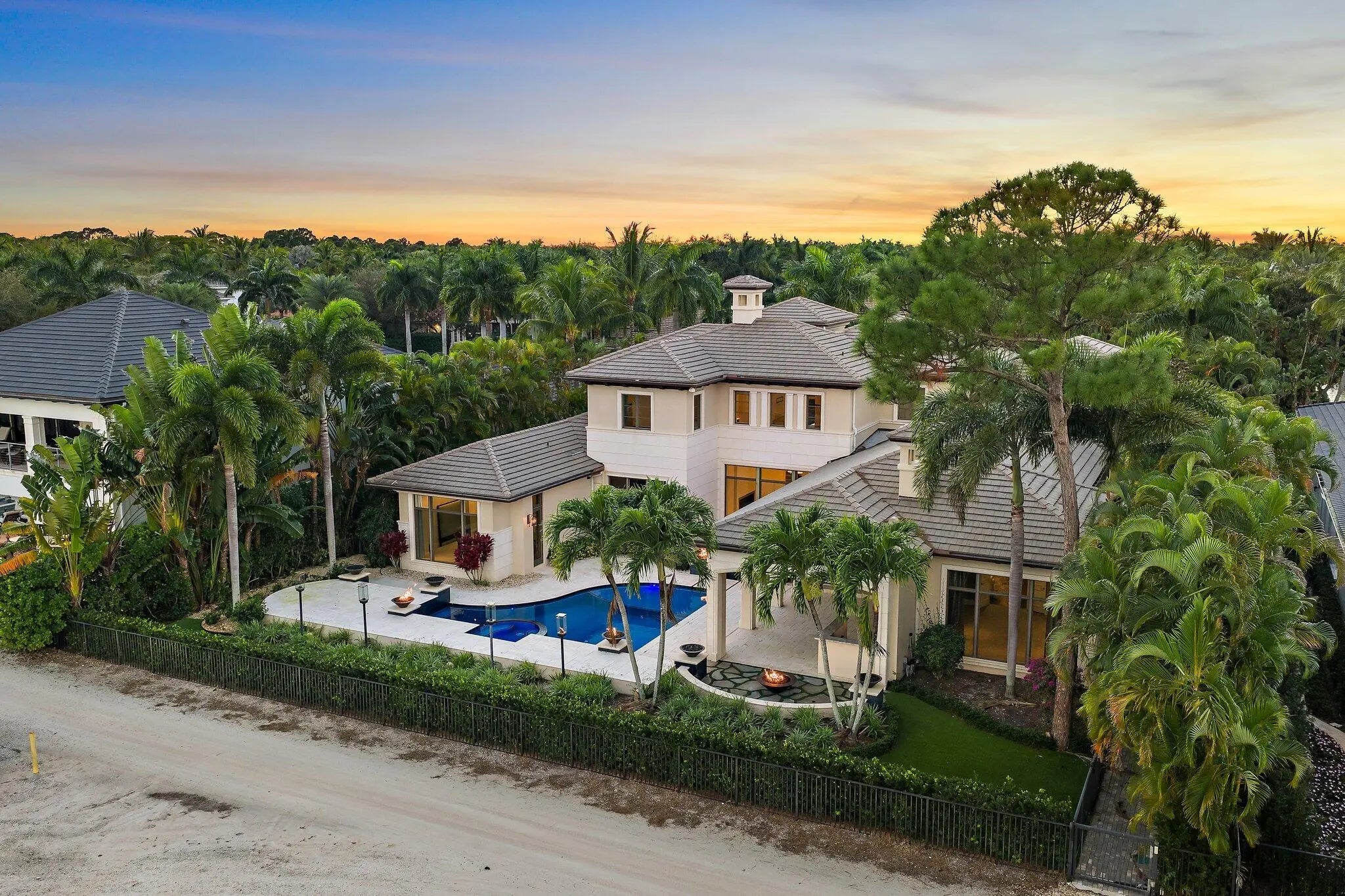 Exquisite two-story estate located in the prestigious Old Palm Golf Club. This exceptional residence offers nearly 7,400 sf of refined, modern living space, set on a half-acre lot with breathtaking golf course views. The home features five bedrooms plus an expansive office, spacious media room, and a total of 6 full and 2 half bathrooms. Upon entry, dramatic exterior water features and sweeping golf course vistas are revealed through an entire wall of floor-to-ceiling windows, complemented by soaring ceilings that enhance the home's grandeur. The elegant interior showcases arched doorways, a family room with a sleek modern fireplace, formal dining room, and a temperature-controlled wine room, all accented by stunning marble and luxurious wood flooring throughout, creating a sophisticated yet welcoming ambiance. The chef's kitchen opens effortlessly to the main entertaining areas, offering a seamless indoor-outdoor living experience. It is beautifully appointed with quartz countertops, double islands, rich wood-beam ceiling accents, a six-burner gas range, premium Thermador appliances, and a built-in Miele coffee maker. The first-floor primary suite is a private retreat, featuring custom wood built-in, a tray ceiling, and floor-to-ceiling windows overlooking the beautiful grounds. The luxurious spa-inspired his and her primary bathrooms offer dual custom walk-in closets, spacious glass-enclosed shower, and a soaking tub framed by picturesque garden views. The first level includes the primary suite, main living spaces, a private office, and a media/club room. The second floor hosts three ensuite bedrooms with a loft or office space along with a separate guest suite with separate access providing ultimate privacy. Outdoor living is equally impressive, featuring serene golf and lake views, a saltwater pool, summer kitchen, phantom screens, gas fire pit, and striking poolside torches and cascading water elements perfect for year-round enjoyment. Other notable highlights include a private elevator, 4.5-car garage with lifts, and thoughtfully designed spaces ideal for both everyday living and grand entertaining. This home with complete impact windows & modern conveniences seamlessly blends luxury, comfort, and sophistication in one of Palm Beach Gardens' most coveted communities.