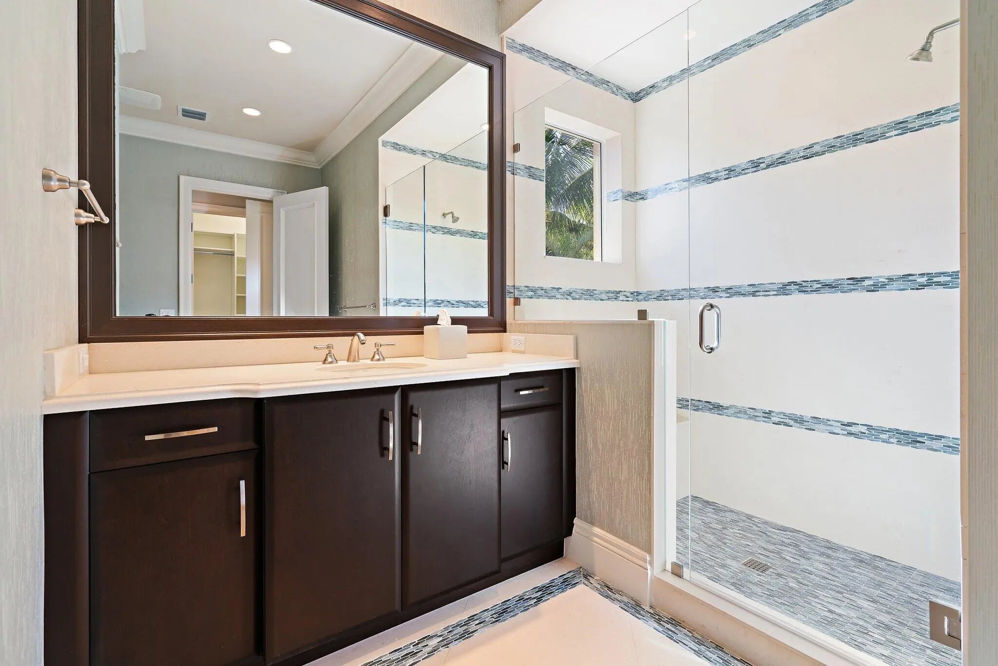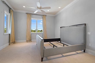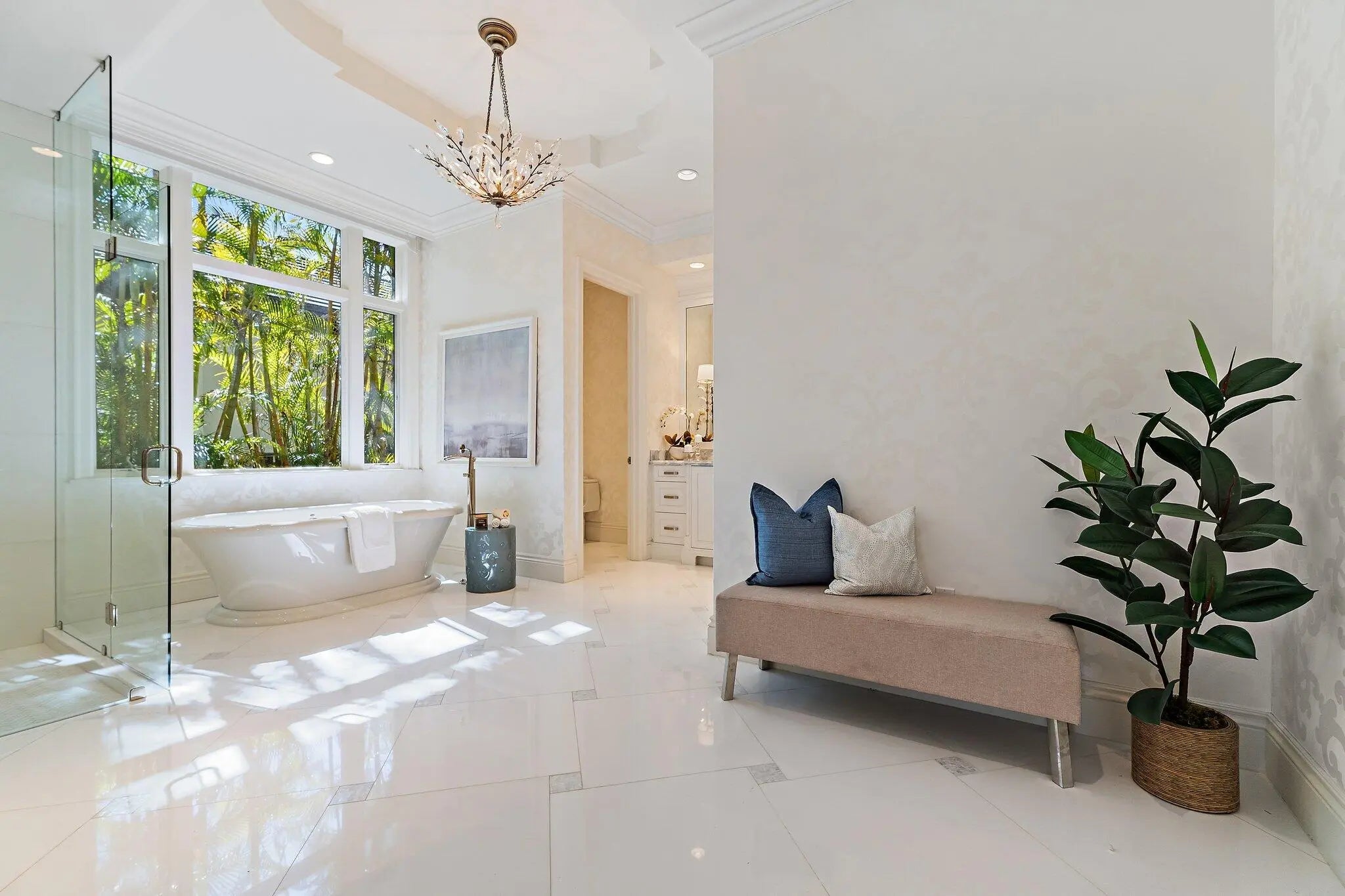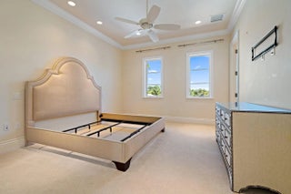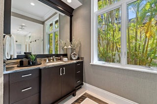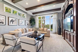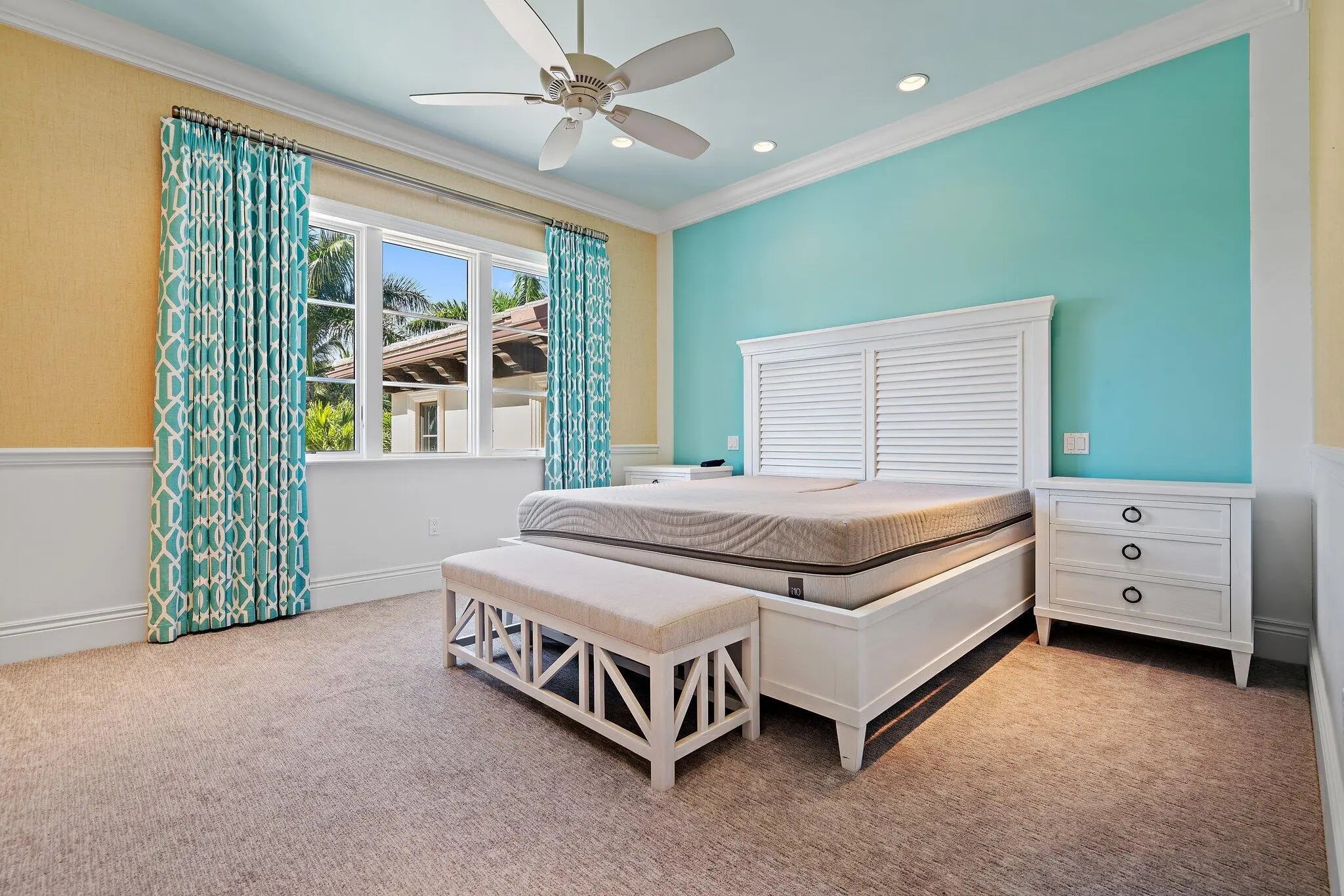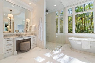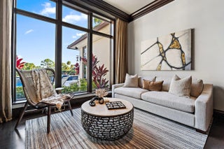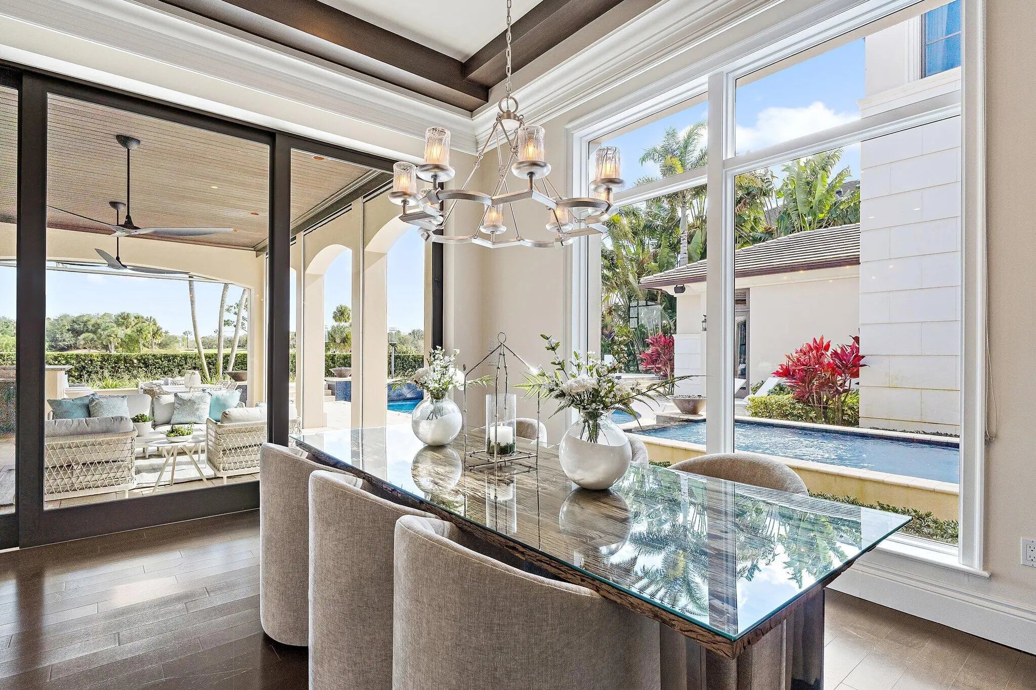 Exquisite two-story estate located in the prestigious Old Palm Golf Club. This exceptional residence offers nearly 7,400 sf of refined, modern living space, set on a half-acre lot with breathtaking golf course views. The home features five bedrooms plus an expansive office, spacious media room, and a total of 6 full and 2 half bathrooms. Upon entry, dramatic exterior water features and sweeping golf course vistas are revealed through an entire wall of floor-to-ceiling windows, complemented by soaring ceilings that enhance the home's grandeur. The elegant interior showcases arched doorways, a family room with a sleek modern fireplace, formal dining room, and a temperature-controlled wine room, all accented by stunning marble and luxurious wood flooring throughout, creating a sophisticated yet welcoming ambiance. The chef's kitchen opens effortlessly to the main entertaining areas, offering a seamless indoor-outdoor living experience. It is beautifully appointed with quartz countertops, double islands, rich wood-beam ceiling accents, a six-burner gas range, premium Thermador appliances, and a built-in Miele coffee maker. The first-floor primary suite is a private retreat, featuring custom wood built-in, a tray ceiling, and floor-to-ceiling windows overlooking the beautiful grounds. The luxurious spa-inspired his and her primary bathrooms offer dual custom walk-in closets, spacious glass-enclosed shower, and a soaking tub framed by picturesque garden views. The first level includes the primary suite, main living spaces, a private office, and a media/club room. The second floor hosts three ensuite bedrooms with a loft or office space along with a separate guest suite with separate access providing ultimate privacy. Outdoor living is equally impressive, featuring serene golf and lake views, a saltwater pool, summer kitchen, phantom screens, gas fire pit, and striking poolside torches and cascading water elements perfect for year-round enjoyment. Other notable highlights include a private elevator, 4.5-car garage with lifts, and thoughtfully designed spaces ideal for both everyday living and grand entertaining. This home with complete impact windows & modern conveniences seamlessly blends luxury, comfort, and sophistication in one of Palm Beach Gardens' most coveted communities.