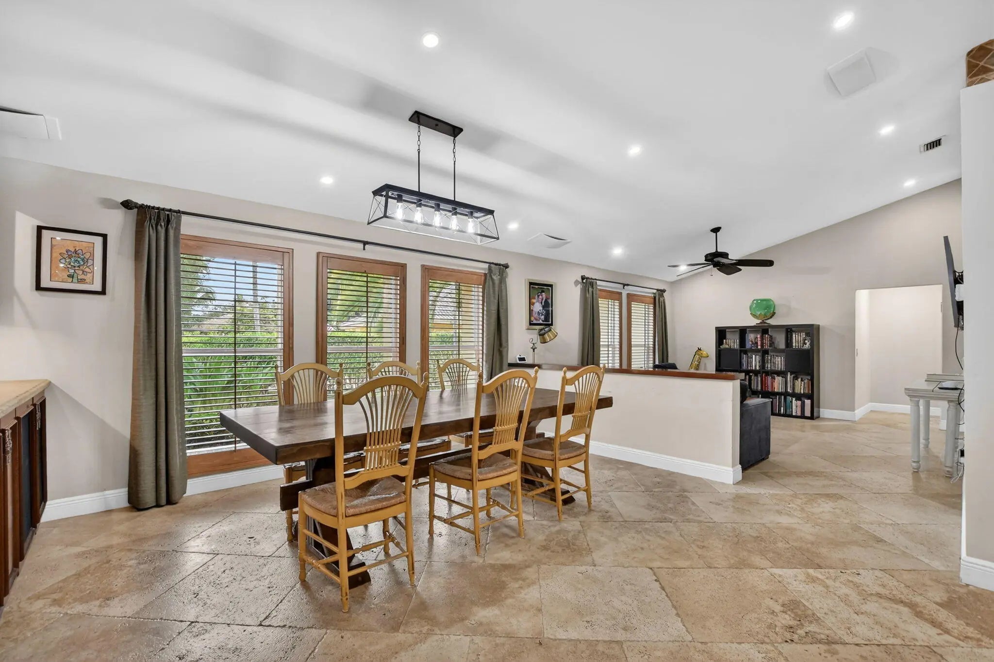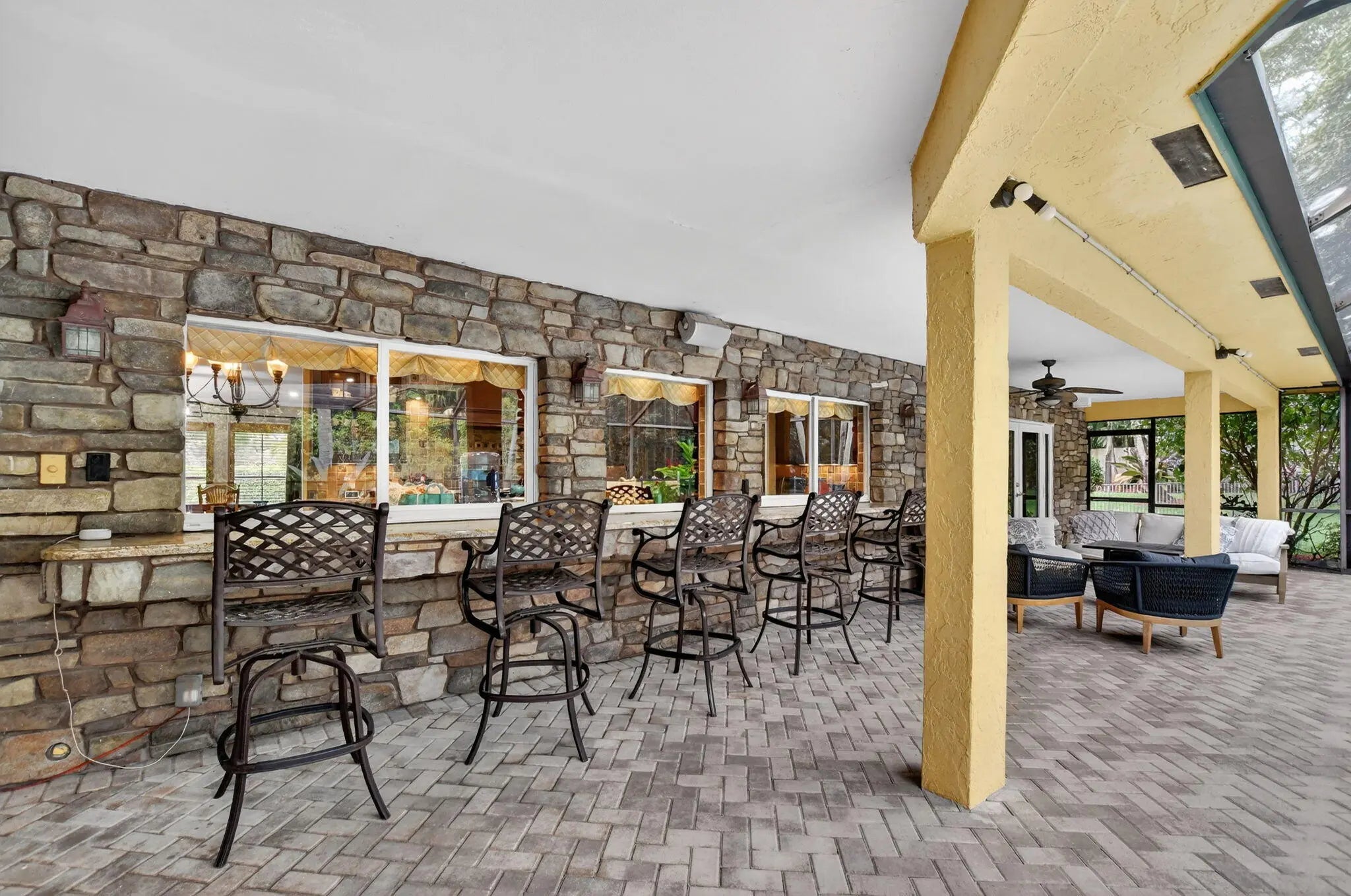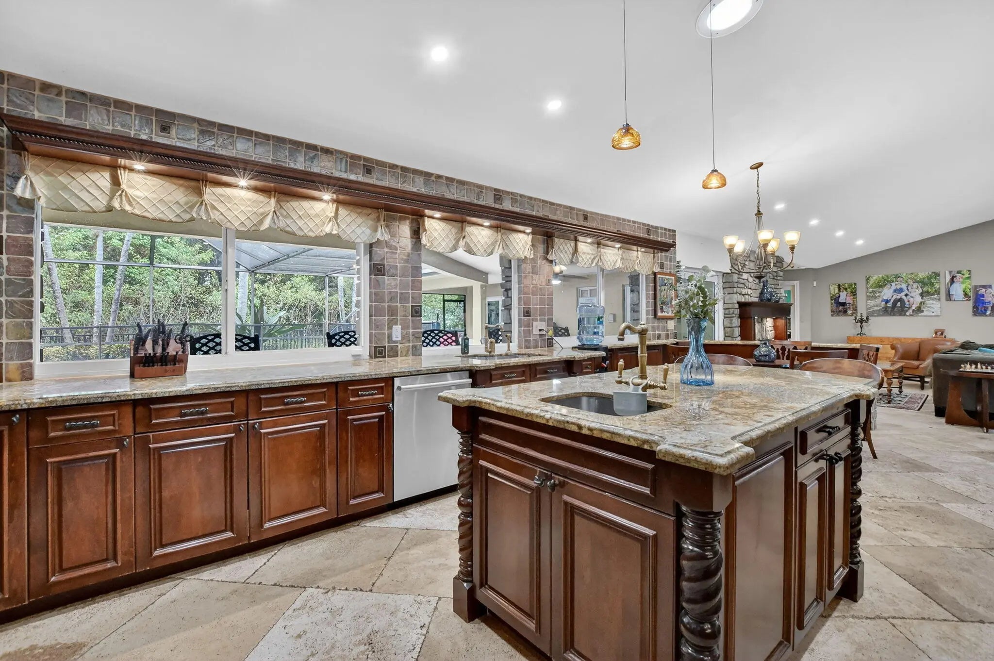 Welcome to this spacious 4-bedroom, 3-bath residence located in the highly sought-after Estancia West community, situated on one of the largest lots in all of the Estancias—a rare ½-acre property offering exceptional privacy and space. This home features an open floor plan, soaring high ceilings, and abundant natural light throughout. A true highlight of the home is the massive chef's kosher kitchen, equipped with a Thermador professional gas range, Miele built-in coffee maker, KitchenAid refrigerator, two dishwashers, two sinks, warming drawer, and a large center island, making it perfect for both everyday living and entertaining large meals. The main living area features a working fireplace, ideal for cozy winter evenings, while the full wet bar with U-Line wine fridge and ample storage makes entertaining effortless. The thoughtfully designed split floor plan offers privacy and flexibility. The large primary suite is tucked away on one side of the home and includes a spacious bedroom and bathroom ready for renovation, presenting an excellent opportunity to customize to your taste. The opposite wing features three generously sized bedrooms and two full bathrooms. Step outside to your private backyard oasis, complete with an oversized solar-heated pool with water feature, offering the perfect setting for relaxing or entertaining in complete privacy. Spacious covered deck for outdoor dining, entertaining, or unwinding in the shade. Enjoy peace of mind with full impact glass windows and doors, a newer roof, a new water heater, 2021 AC, new electrical panel, and LED lighting throughout. Close to house of worship.