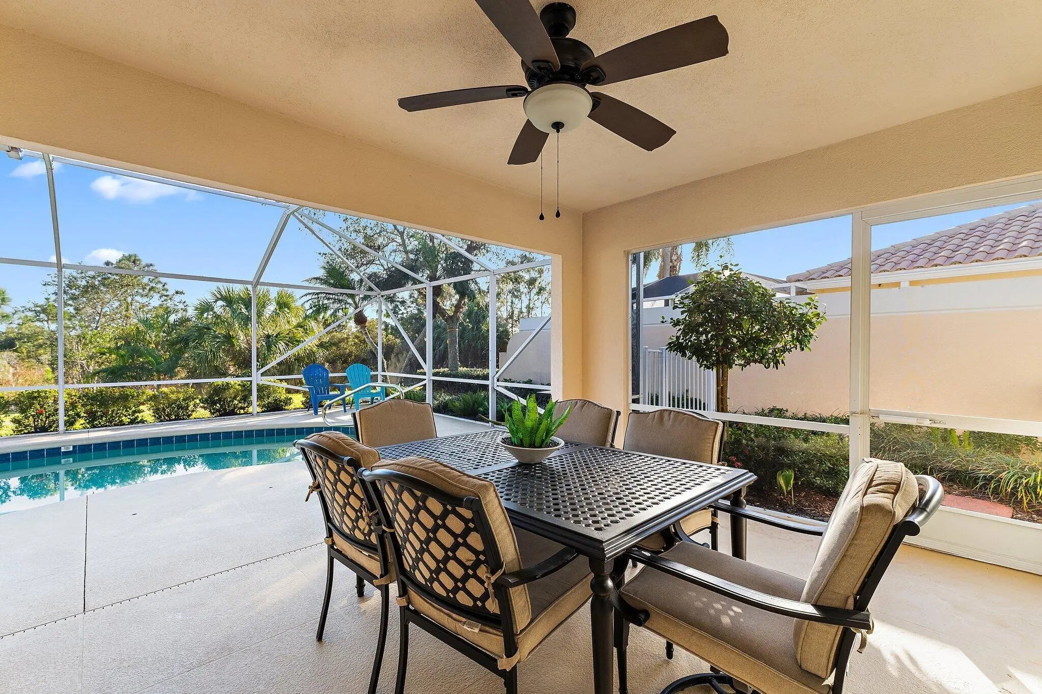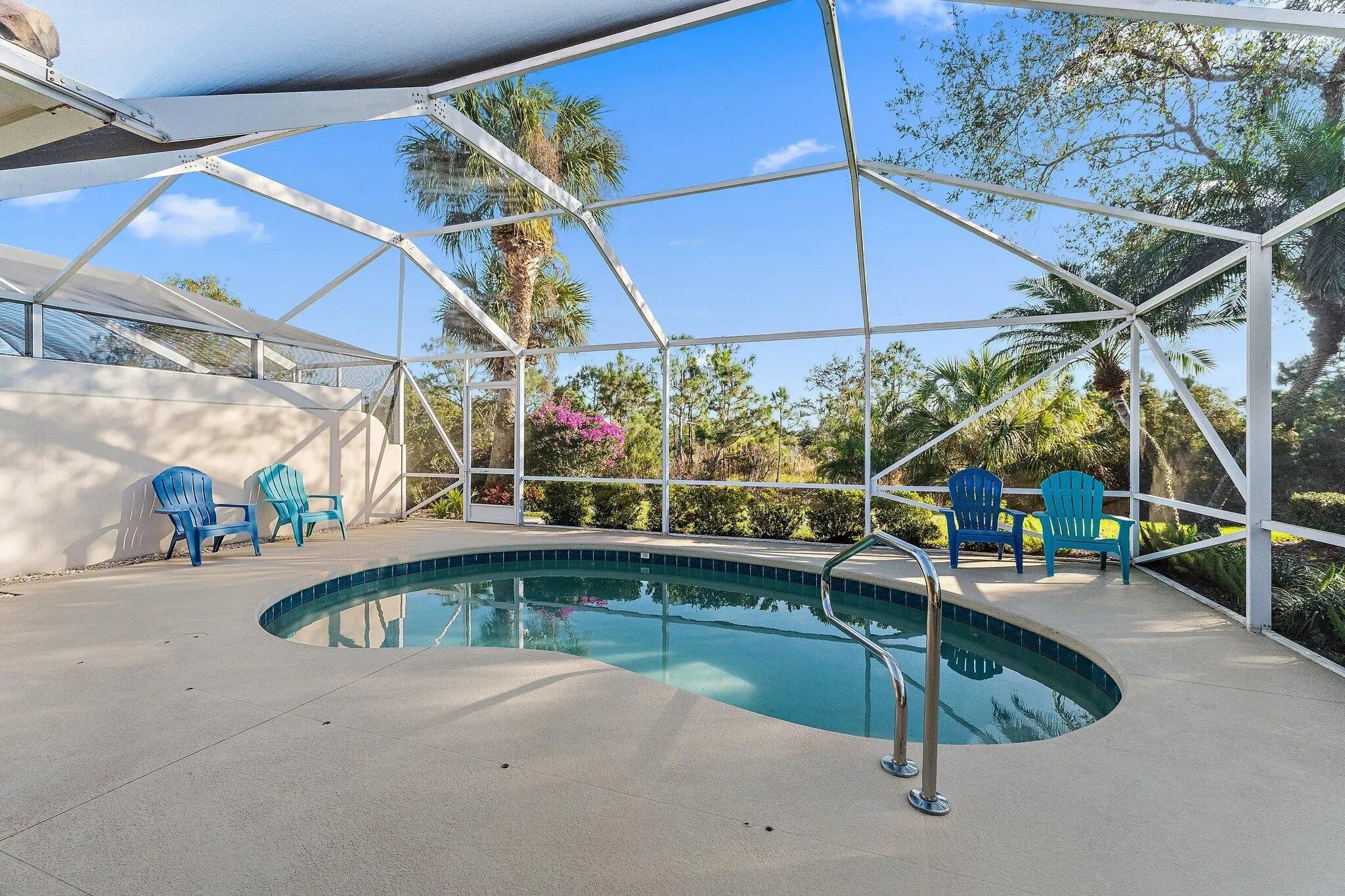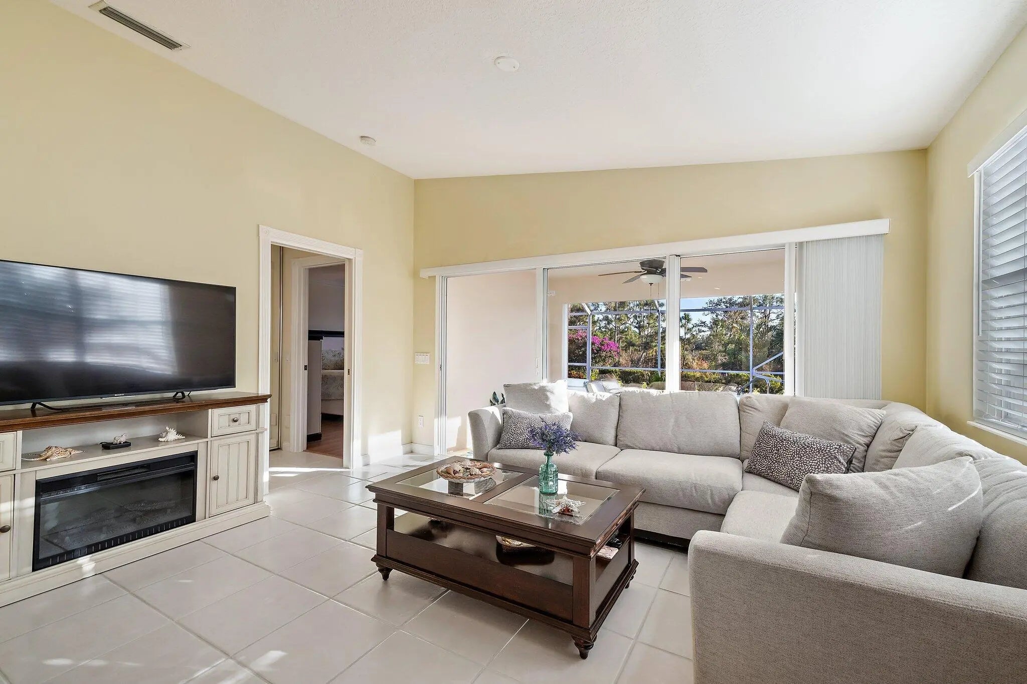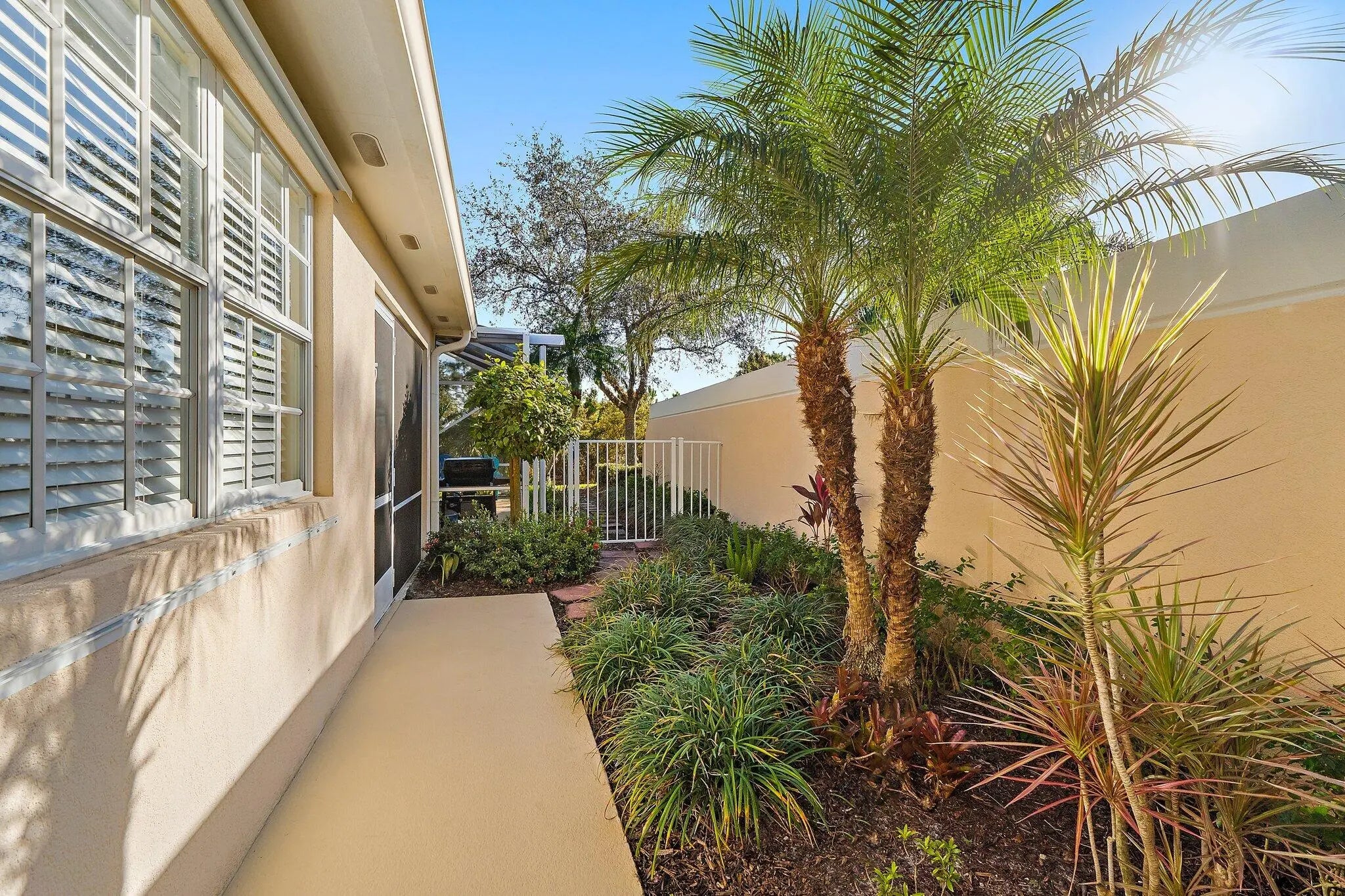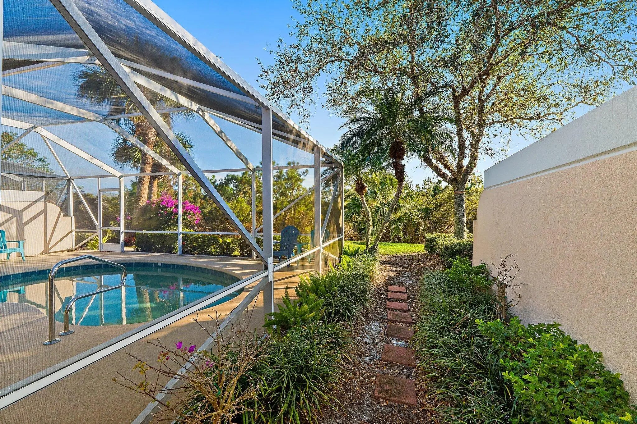 Overlooking a peaceful nature preserve, this 2-bedroom, 2-bath CBS villa in The Retreat at Seabranch offers a private screened pool, low-maintenance living, and a layout designed for comfort. The single-story floor plan features over 1,500 sq ft with a true split-bedroom design, tile and laminate flooring throughout, and a spacious great room that flows to the outdoor patio. The primary suite includes dual vanities, and partial impact windows pair with full panel shutters for added storm protection. Out back, a screened-in pool provides a quiet retreat surrounded by tropical landscaping. The 2-car garage adds convenience, and the HOA covers exterior maintenance and lawn care. With access to a clubhouse, tennis, pickleball, fitness center, and more, plus close proximity to Hobe Sound beaches, Seabranch Preserve, and A-rated schools, this home blends lifestyle, value, and location.