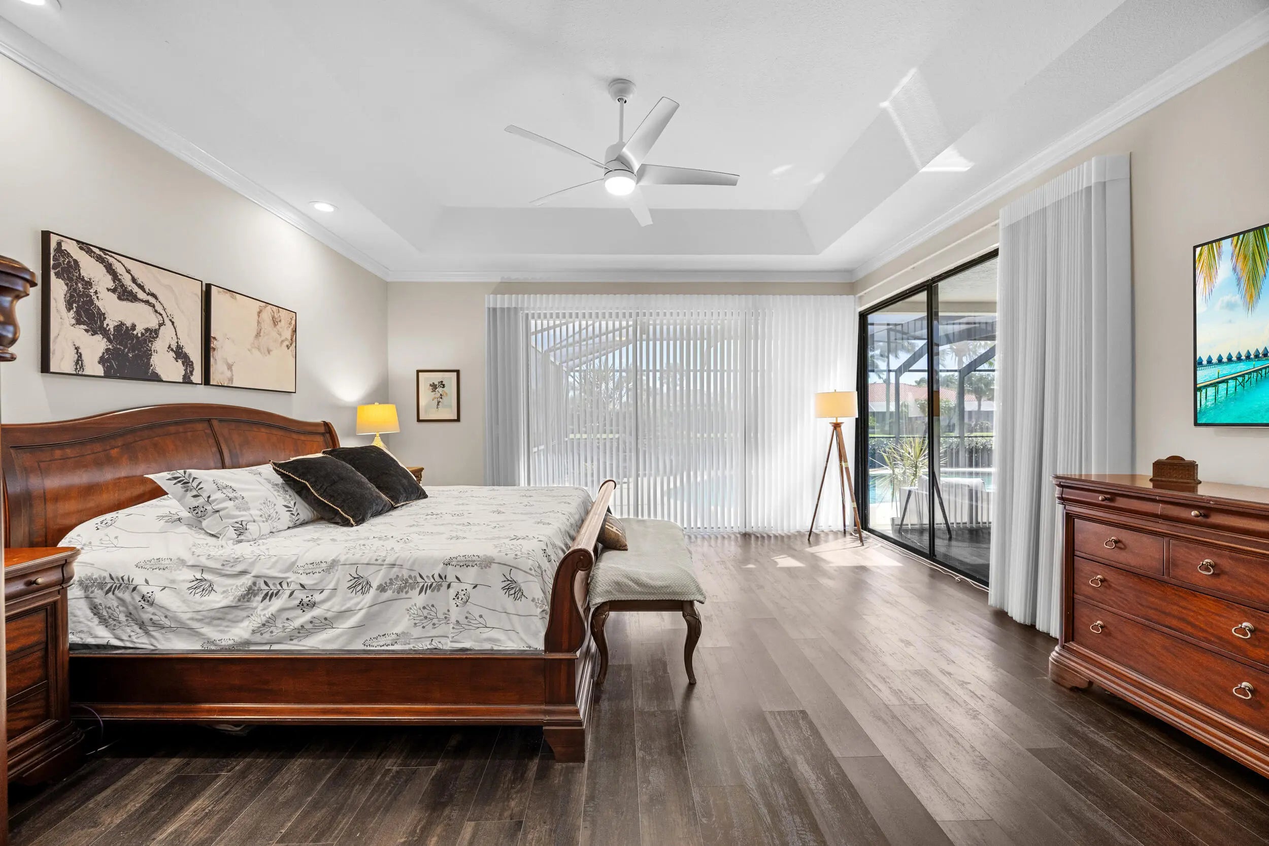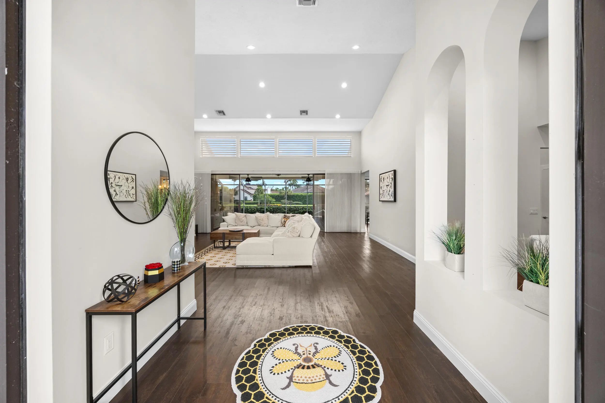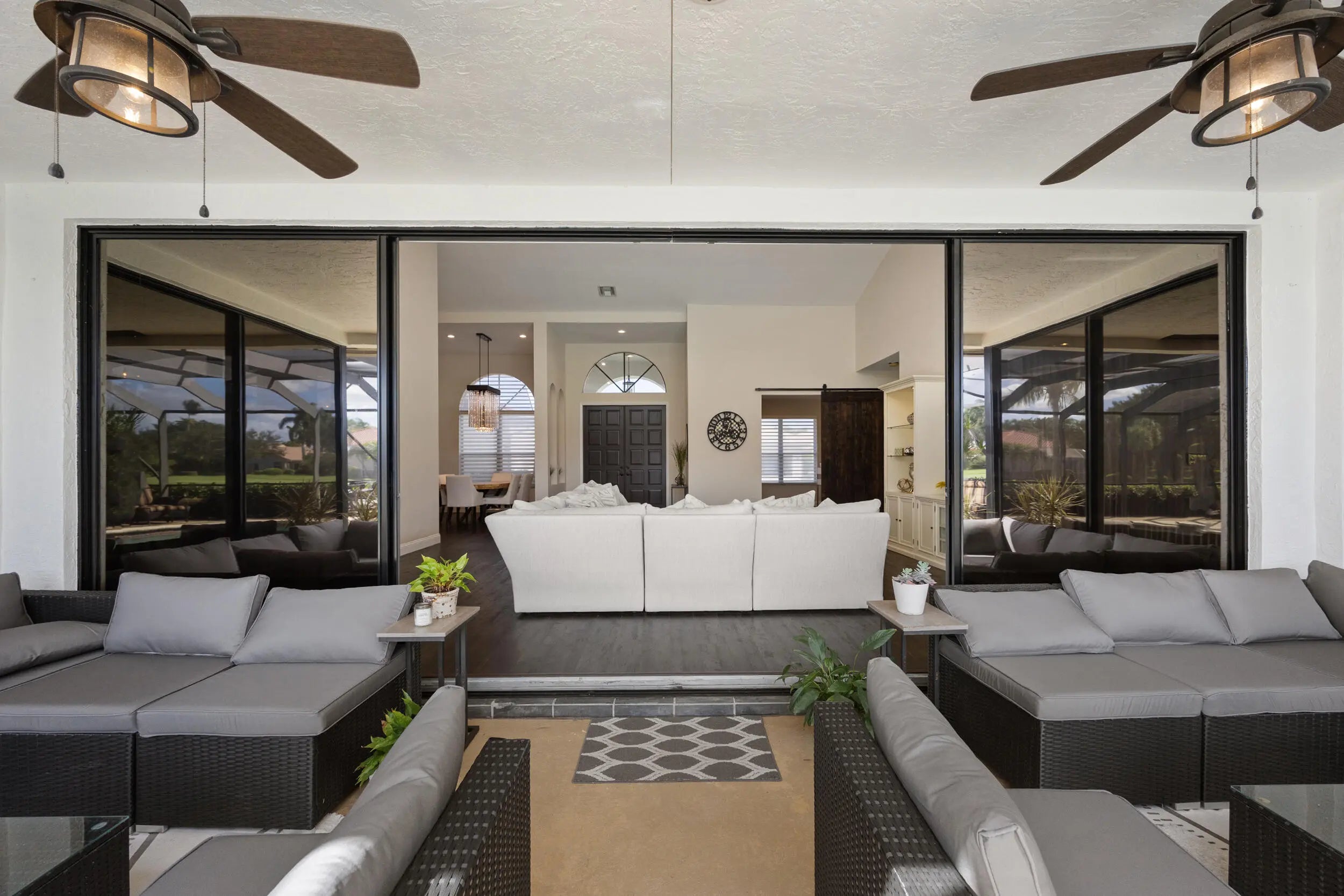Situated within the prestigious Stonebridge Country Club, this beautifully updated residence offers sweeping golf course views overlooking the17th hole, combining refined interiors w/serene outdoor living. The home has been refreshed inside and out, beginning with newly re-landscaped grounds and a freshly painted exterior. Inside, the residence features three bedrooms, two full bathrooms, and a renovated half bath, all enhanced by fresh interior paint and new flooring throughout. Thoughtful upgrades include a fully renovated powder room with new sink, toilet, and lighting, updated ceiling light fixtures throughout, and new fans in every room, including the outdoor living area. A newly built-in bonus room offers versatility as a home office, flex space, or an addt'l bedroom. more.. The primary suite is elevated with custom closet systems and new lighting, creating a refined and functional retreat. Two AC units replaced in 2023 provide peace of mind and energy efficiency. Step outside to a beautifully screened-in lanai featuring a built-in pool, ideal for relaxing or entertaining, complemented by a new pool pump installed this year. This move-in-ready home delivers modern upgrades, flexible living space, and a prime golf course setting in one of Boca Raton's most sought-after country club communities.