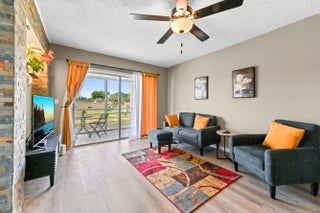 Prepare to be captivated by this gorgeously updated 2-bedroom, 2-bath condo, offering one of the most spectacular waterviews in Golden Lakes Community! This move-in ready residence has been meticulously renovated with an eye for modern design. The kitchen gleams with new cabinets, elegant quartz countertops, and sleek appliances, all complemented by updated fixtures. Throughout the living areas, new laminate floors and designer touches create a sophisticated ambiance. The master suite boasts a private dressing area with a new vanity and fixtures, ensuring a luxurious daily routine. New blinds and numerous other upgrades complete this home. Step out onto your private patio and unwind as you soak in the tranquil water views - a perfect backdrop for morning coffee or evening relaxation. Golden Lakes is a premier 55+ manned gated community, renowned for its extensive resort-style amenities designed for active adults. Beyond the community gates, you're just minutes from fine dining, abundant shopping, the vibrant CityPlace, and all the cultural attractions and entertainment that beautiful Palm Beach has to offer. This beautiful condo is a must-see and promises an exceptional 55+ lifestyle!
