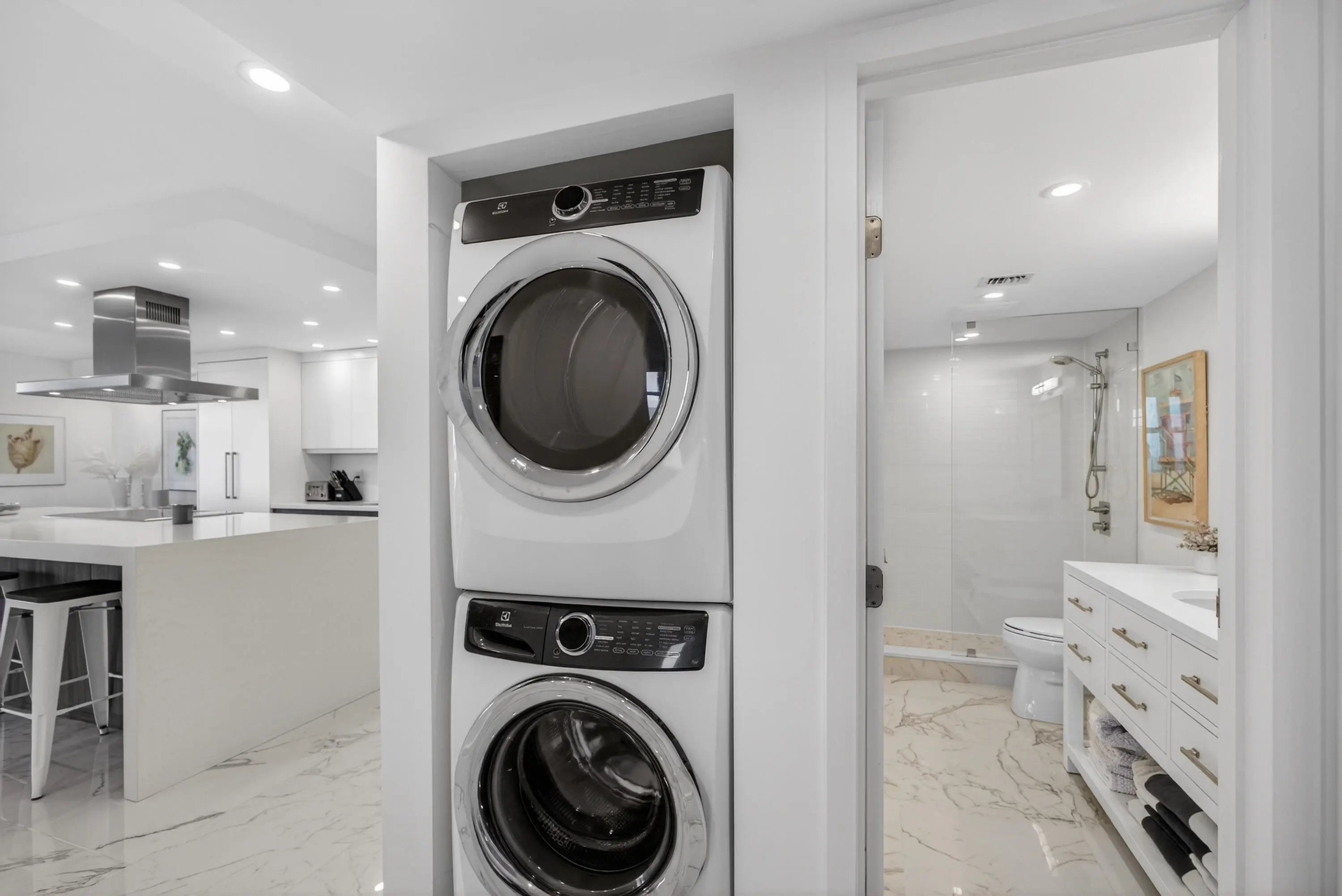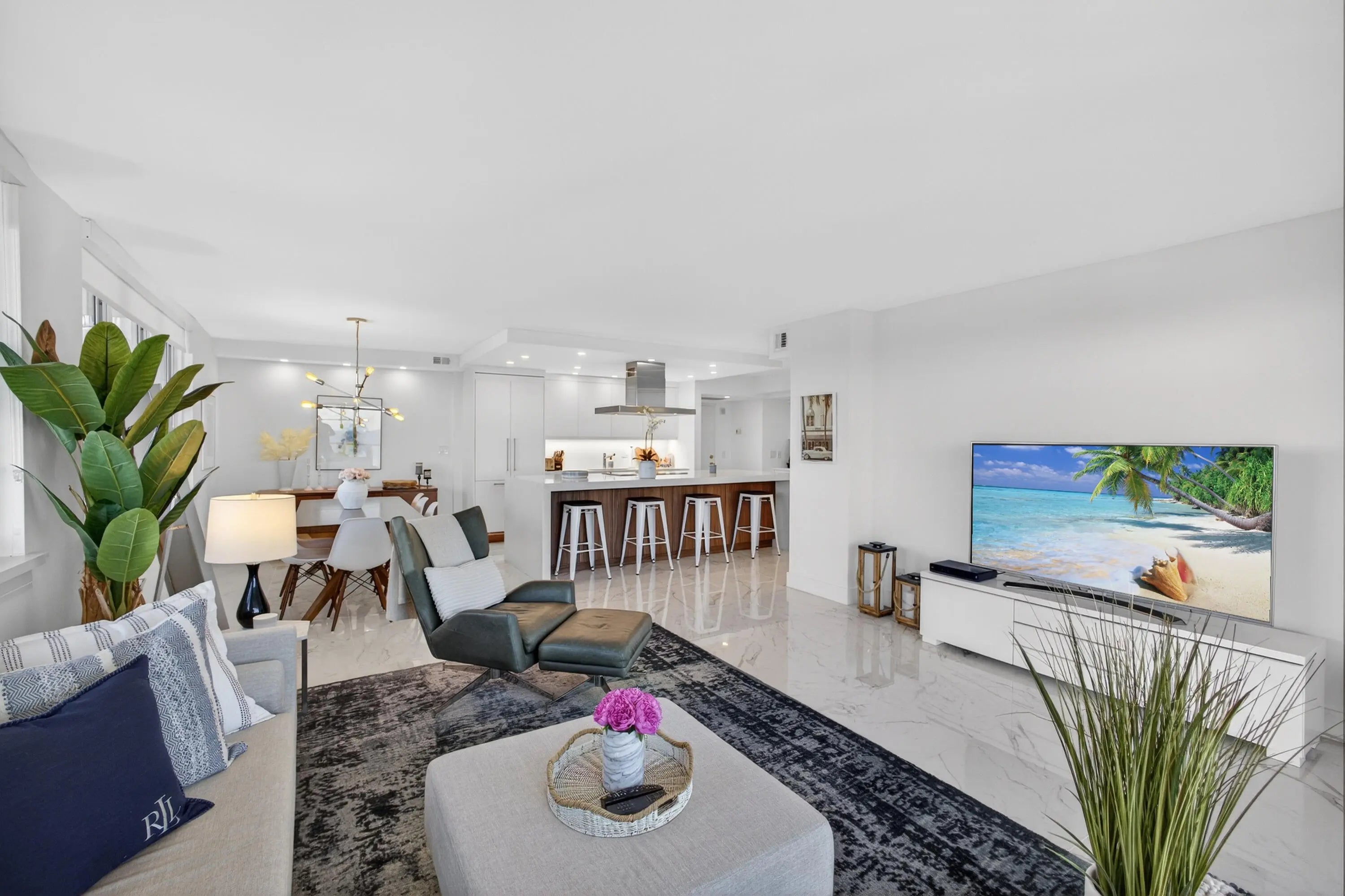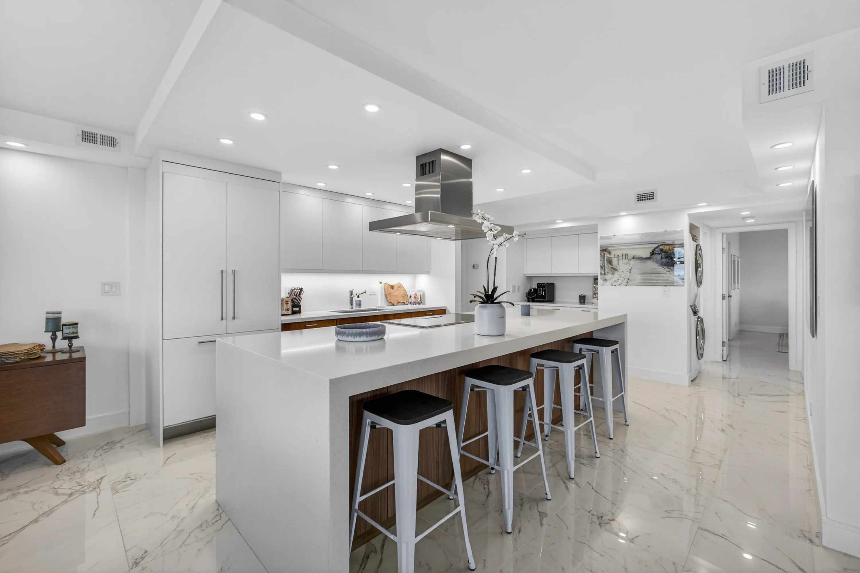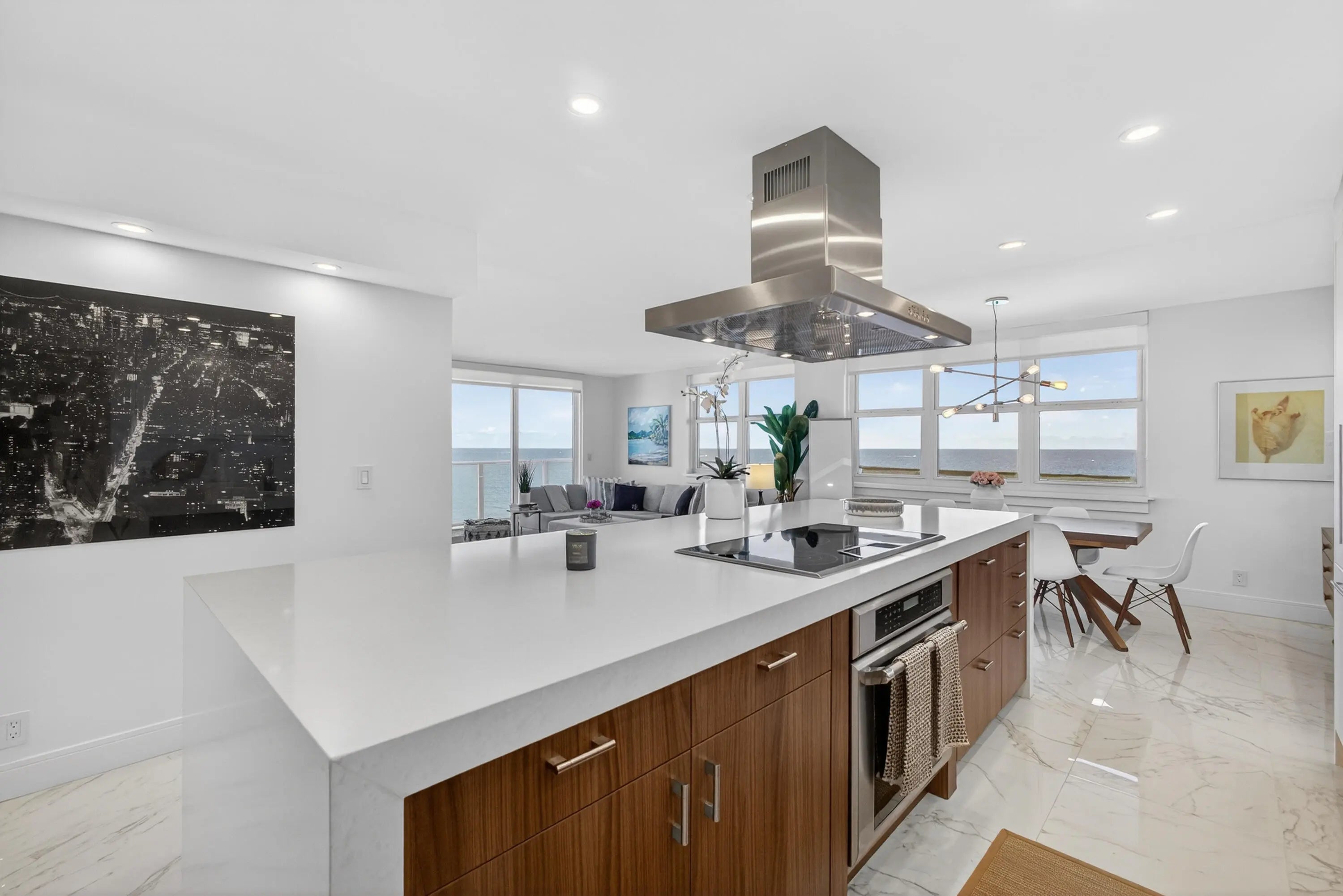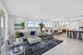 Spectacular Penthouse Living on Singer Island. Enjoy breathtaking panoramic views from this exceptional penthouse featuring a 37-foot wraparound balcony overlooking the turquoise Atlantic Ocean by day and the glittering night lights of the Intracoastal Waterway by night. This residence has been fully upgraded and showcases impact windows and sliders throughout, smooth ceilings, and elegant porcelain tile flooring. The open-concept kitchen is designed for both beauty and function, offering custom cabinetry, a striking quartz center island with seating for four, and seamless flow for entertaining. A washer and dryer are conveniently located in-unit, and spacious walk-in closets provide excellent storage.And most important miles of sandy beach at your footsteps. Building amenities include a fitness center, clubroom with full kitchen ideal for gatherings, resort-style pool, and covered parking. Ideally located just 15 minutes to the airport and within walking distance to restaurants and entertainment. And most importantly miles of pristine sandy beach are right at your footsteps.