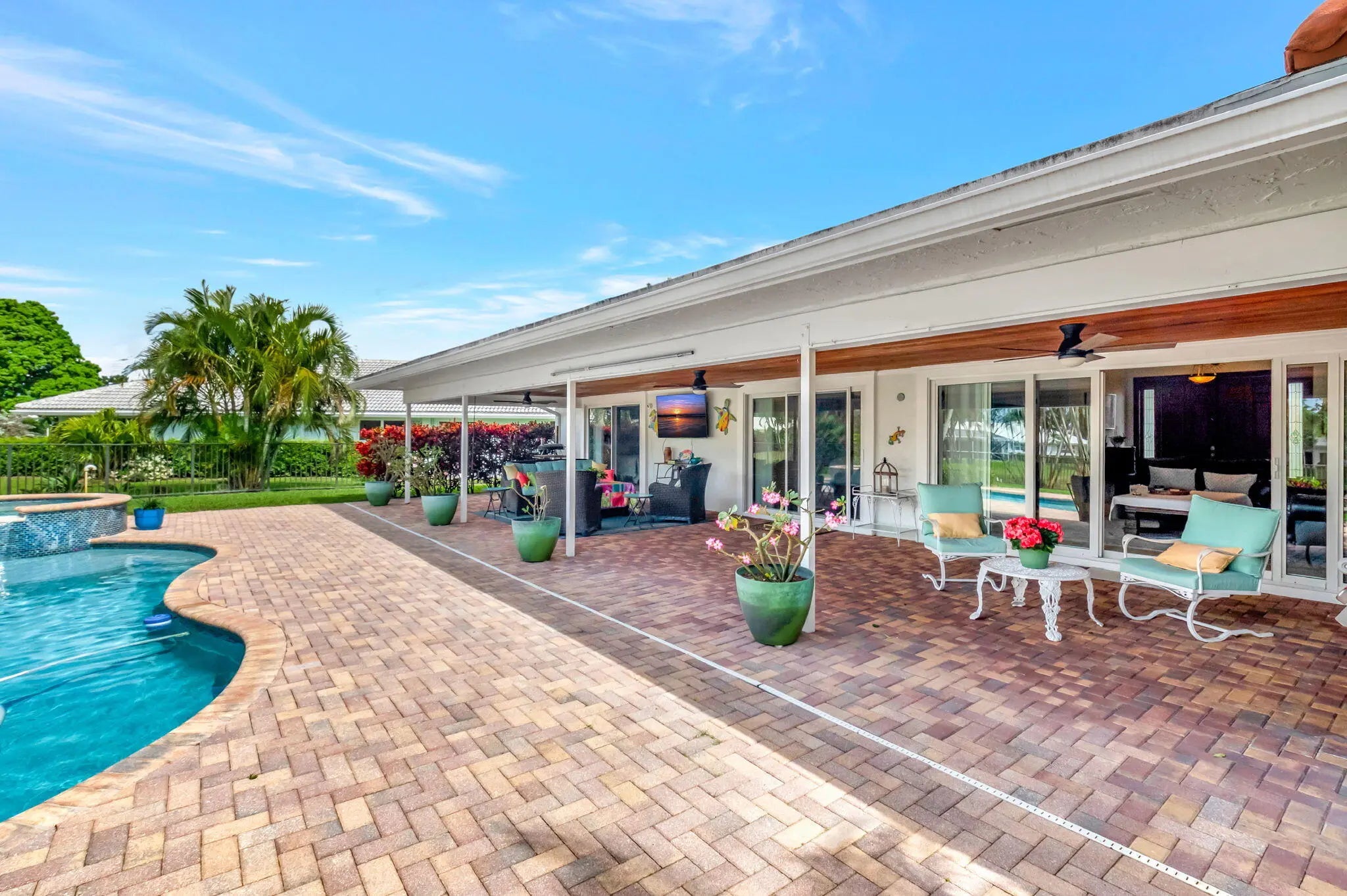 Beautifully updated in Delray Dunes. The 18 hole Pete Dye golf course was just fully renovated in 2024. The home was entirely renovated in 2013. With an expansive addition to the living room, the roof & partial trusses were removed in order to re-shape the roof line, and the living area ceiling height was raised to 10ft. The electric system was redone, along with a new panel & breakers. The A/C ducts were entirely redone during the addition, and a new unit was recently installed in 2022. Full hurricane impact windows overlook the covered patio area, along with the pool & hot tub. Enjoy a fully fenced yard, on the over-sized lake front lot. The all age community offers golf & tennis, a gym, a resort style pool & bar, along with indoor and outdoor dining at the clubhouse.