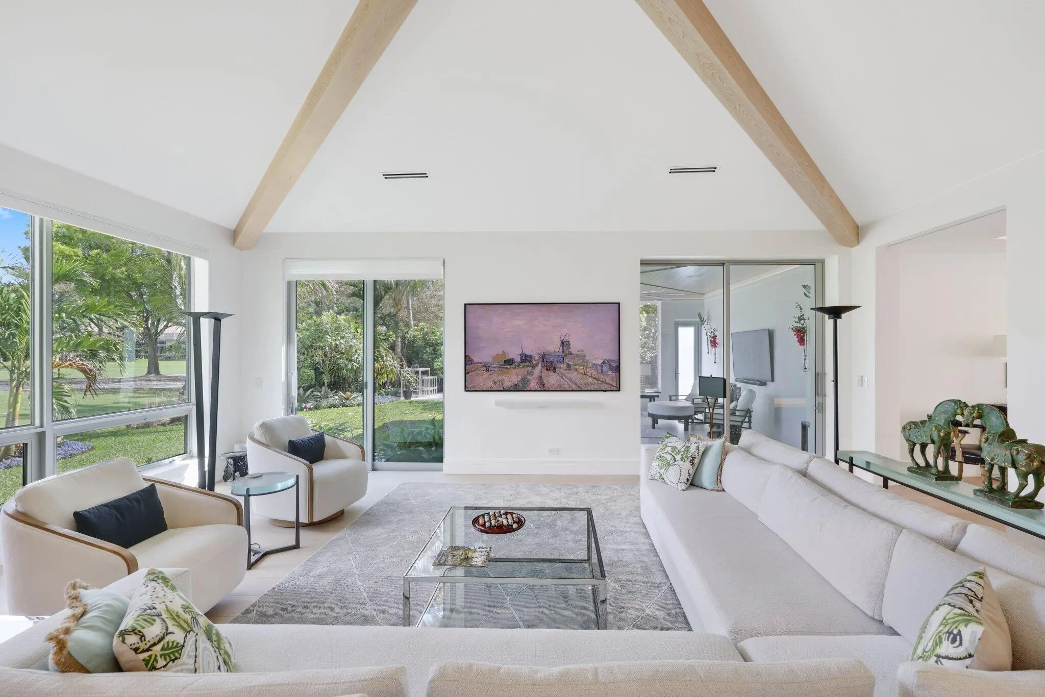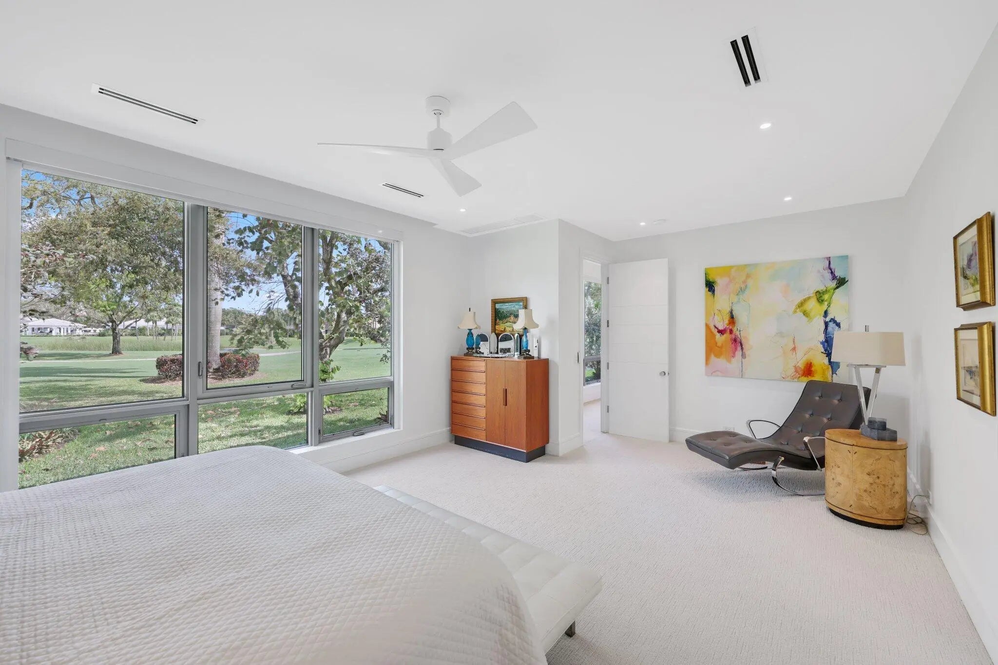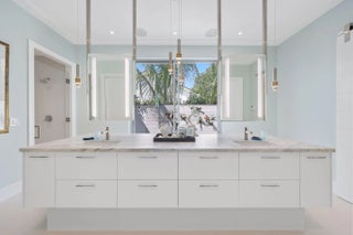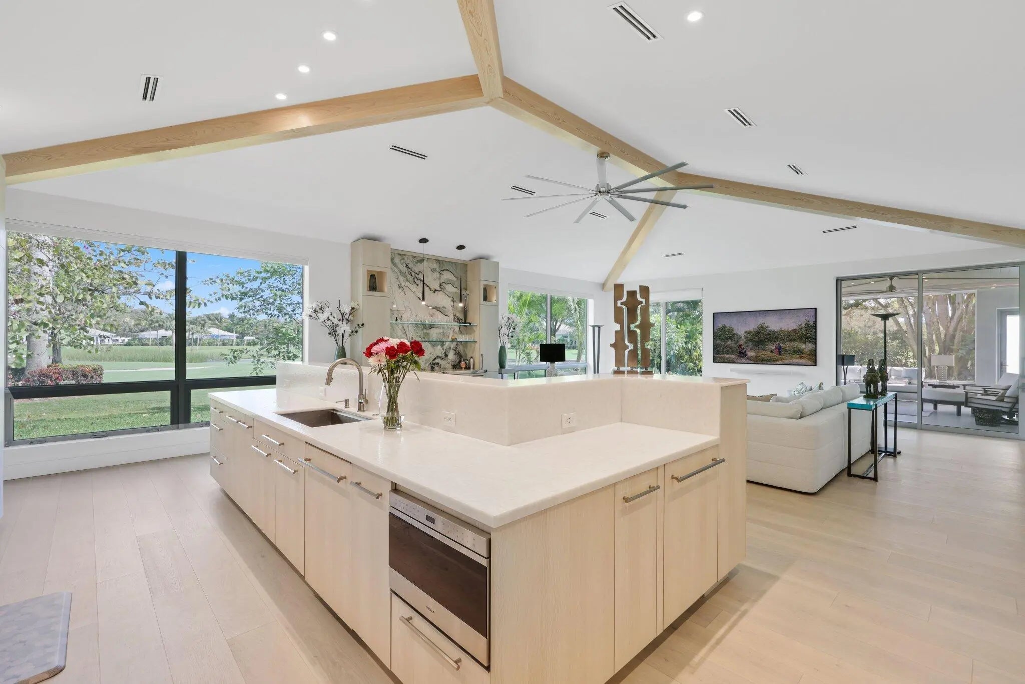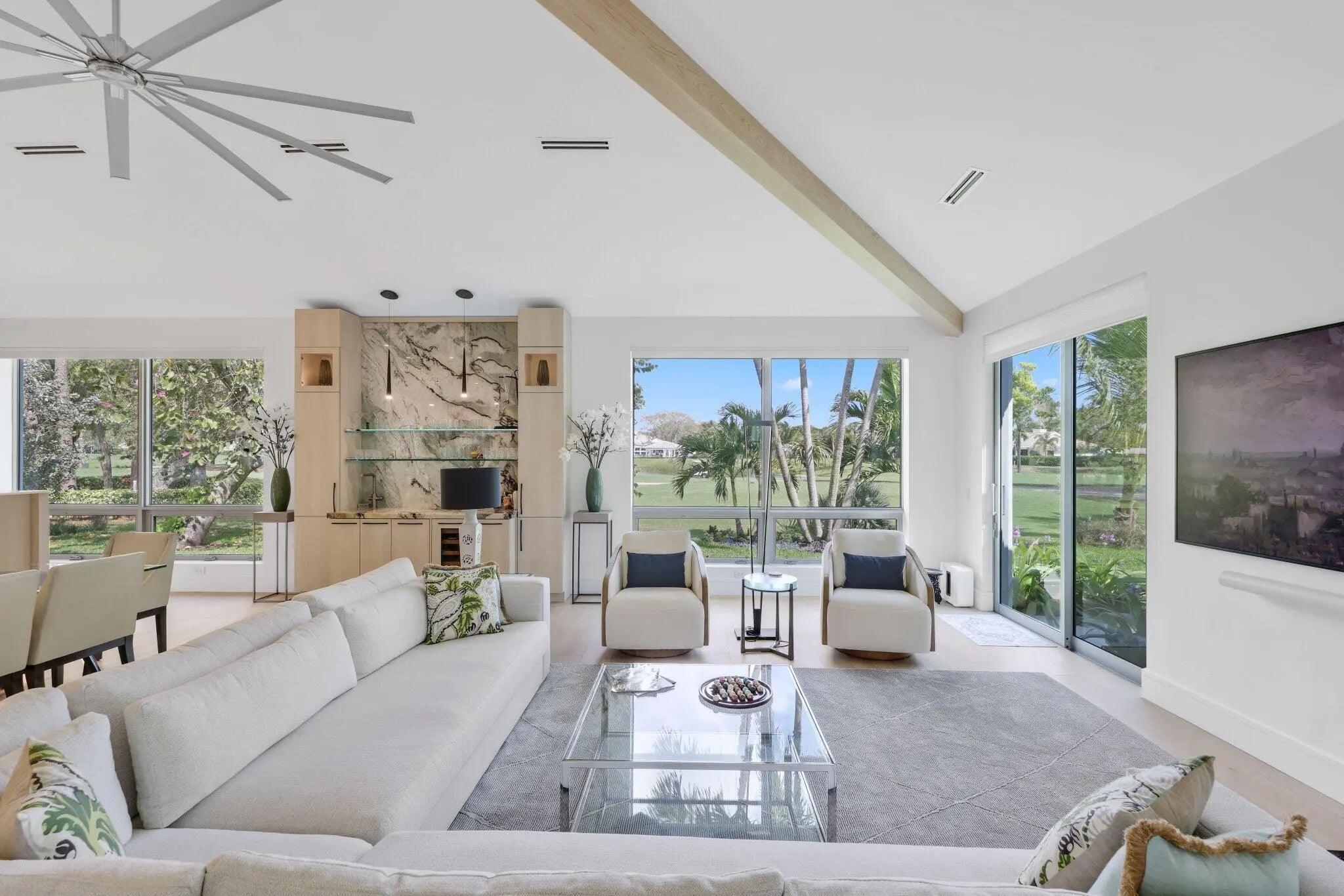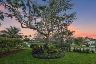 Live the Lifestyle! This custom -built residence, completed in 2024 by Signature Builders for the business owner, embodies traditional new construction and modern enhancements. It features panoramic views of the Delray Dunes Golf & Country Clubs signature 18th green and is conveniently located just a three minute walk from the clubhouse and amenities. The split-bedroom plan, accented by French White Oak flooring throughout, ensures optimal privacy for residents. All interiors walls are sound insulated for enhanced tranquility. The primary bathroom includes a floating dual-sided vanity with ceiling suspended mirrors, an outdoor shower and bathtub enveloped by coconut palms to evoke a tropical ambiance, two separate walk-in closets, a private toilet room and an indoor shower. Ceilings throughout the home are 10 feet high or vaulted, while 9-foot exterior doors and windows maximize natural light infiltration. Additional amenities encompass smart lighting controls, motorized window treatments, a centrally wired AV system, a 1,000 gallon in-ground propane tank, and pre-wiring for a whole-home generator. High-end finishes and structural reinforcements exceeding current building codes underscore the superior quality and thoughtful design of this contemporary home. The swimming pool is scheduled for completion by the end of February 2026.