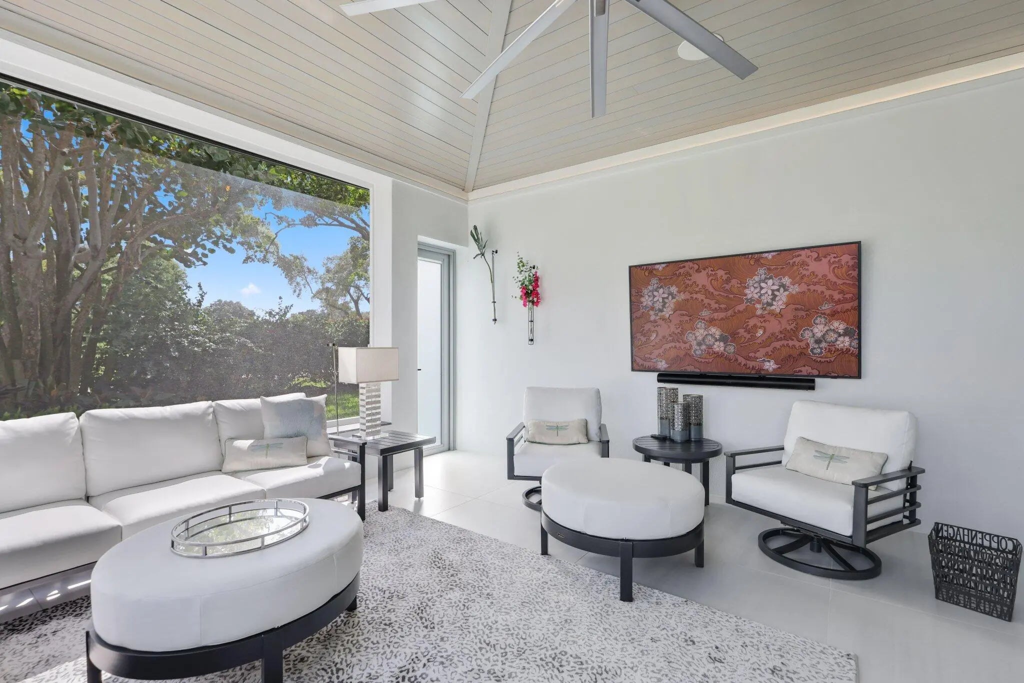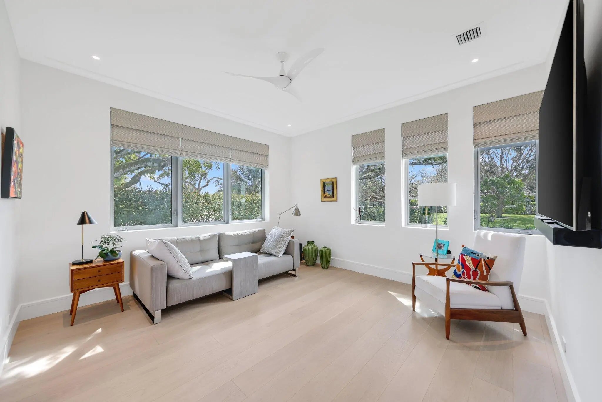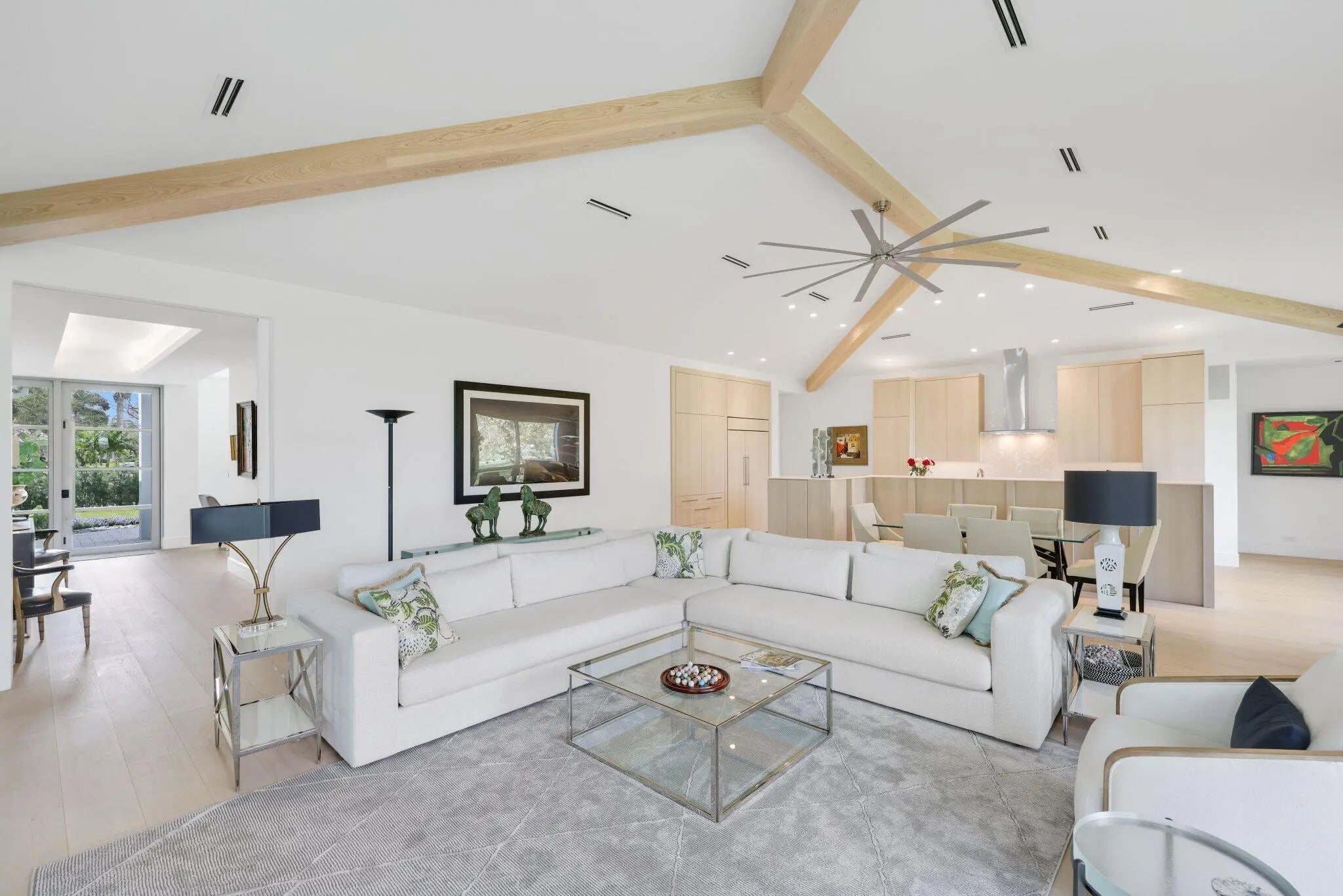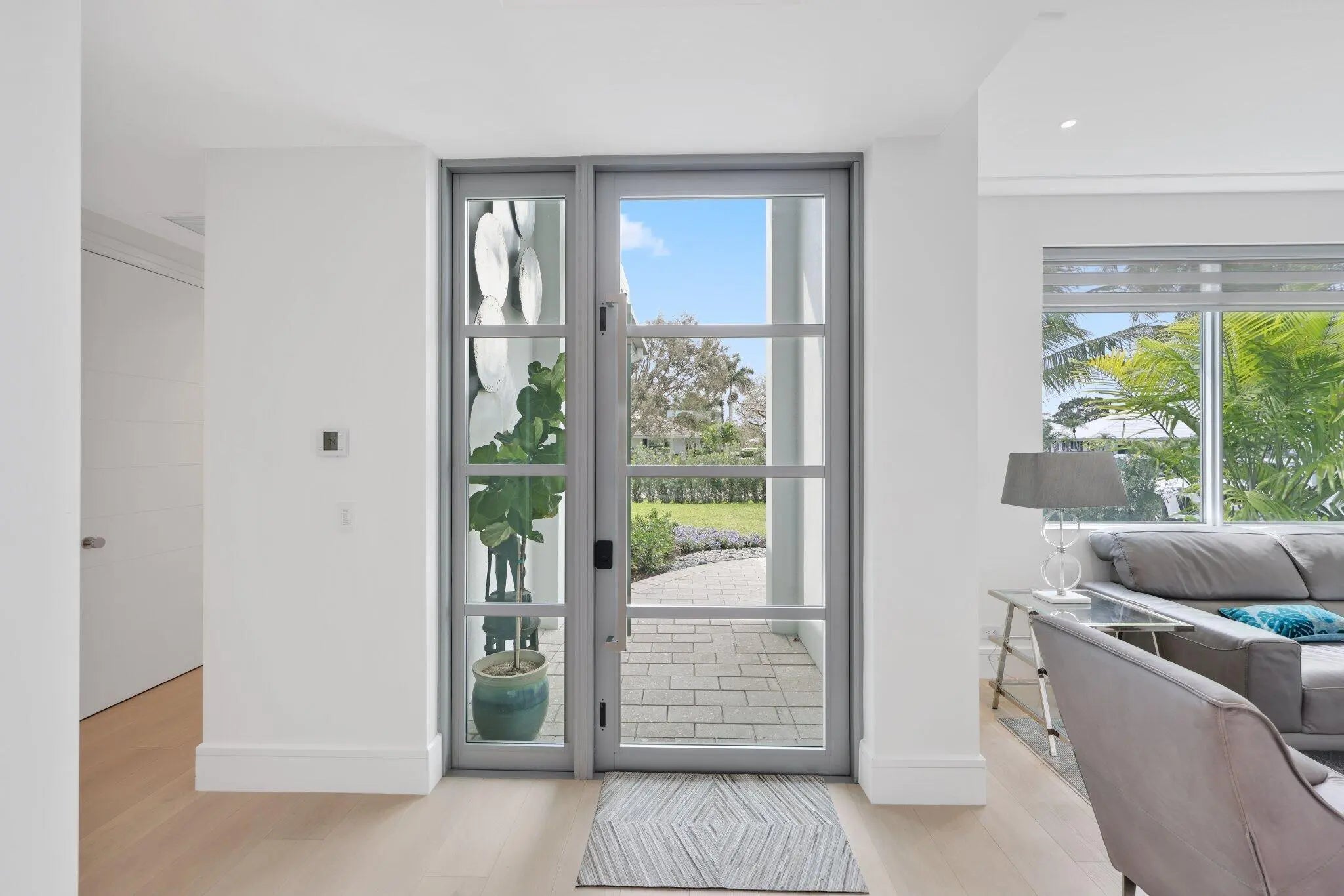 Live the Lifestyle! This custom -built residence, completed in 2024 by Signature Builders for the business owner, embodies traditional new construction and modern enhancements. It features panoramic views of the Delray Dunes Golf & Country Clubs signature 18th green and is conveniently located just a three minute walk from the clubhouse and amenities. The split-bedroom plan, accented by French White Oak flooring throughout, ensures optimal privacy for residents. All interiors walls are sound insulated for enhanced tranquility. The primary bathroom includes a floating dual-sided vanity with ceiling suspended mirrors, an outdoor shower and bathtub enveloped by coconut palms to evoke a tropical ambiance, two separate walk-in closets, a private toilet room and an indoor shower. Ceilings throughout the home are 10 feet high or vaulted, while 9-foot exterior doors and windows maximize natural light infiltration. Additional amenities encompass smart lighting controls, motorized window treatments, a centrally wired AV system, a 1,000 gallon in-ground propane tank, and pre-wiring for a whole-home generator. High-end finishes and structural reinforcements exceeding current building codes underscore the superior quality and thoughtful design of this contemporary home. The swimming pool is scheduled for completion by the end of February 2026.