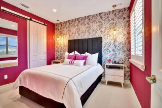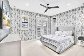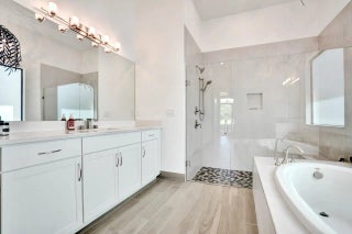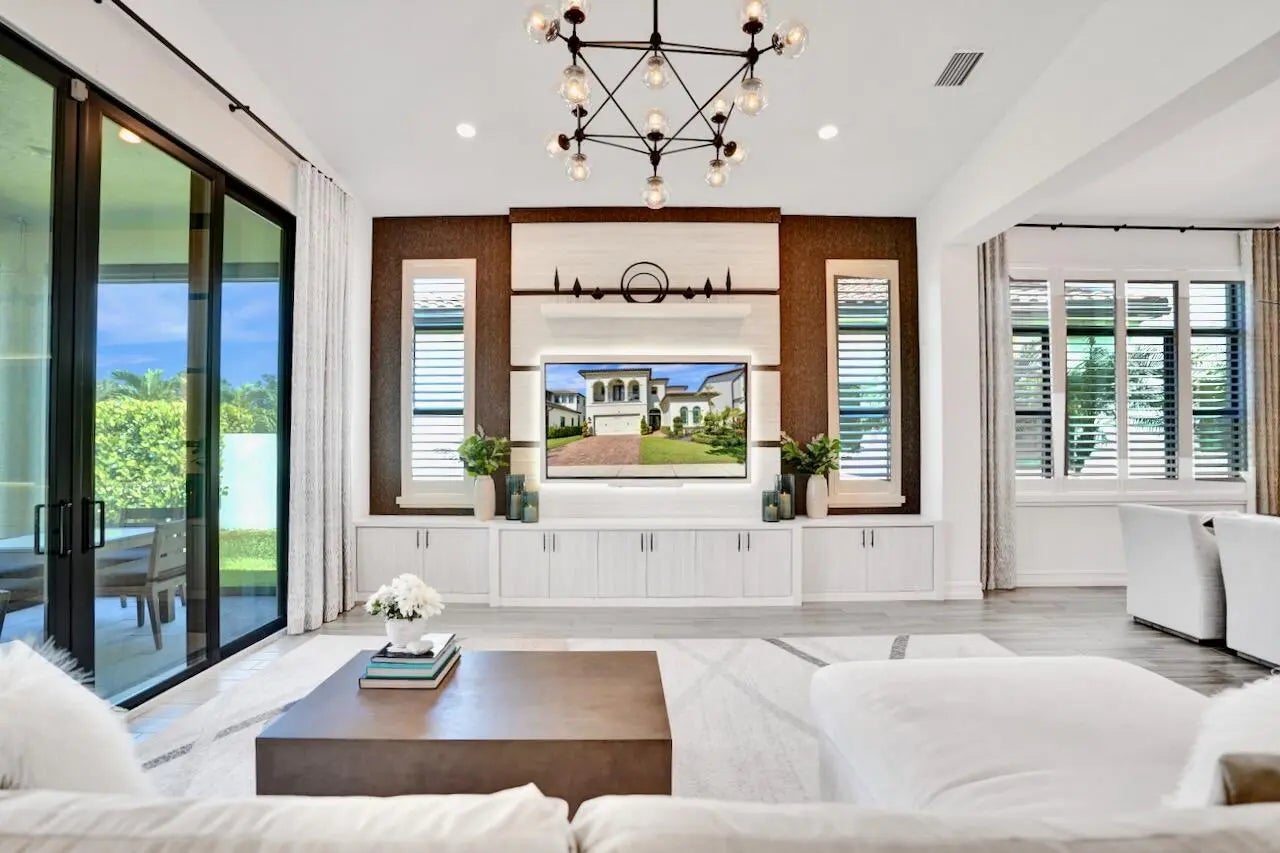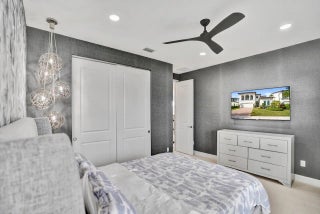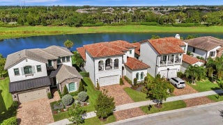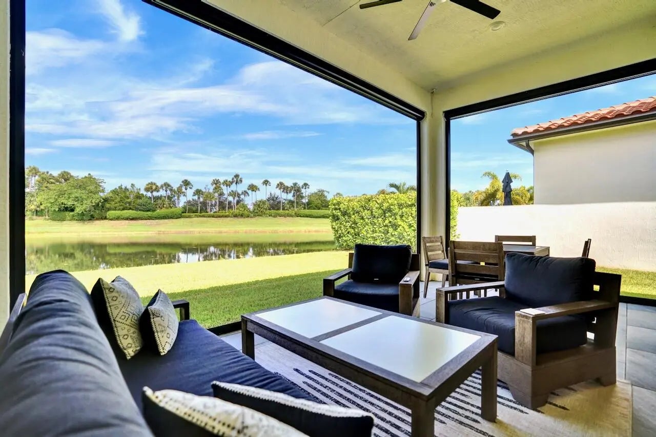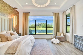 Welcome to this stunning Provence B Model in the gated community of Palm Meadows Estates. Built in 2020, this professionally decorated 4-bedroom, 4.5-bath residence with a dedicated office and spacious loft offers over 3,200 sq. ft. of thoughtfully designed living space and shows like a model home. The main level features an open-concept living area, upgraded glass double entry doors, custom media cabinetry, and an entirely upgraded chef's kitchen with quartz countertops, marble backsplash, stone accent tile, stainless steel appliances, gas range, double ovens, and a walk-in pantry with custom storage. Also on the main floor are the luxurious primary suite, a private office with barn doors and built-in storage, a second ensuite bedroom, and a custom mudroom with built-in seating. The primary suite includes custom electric shades, designer lighting, and two oversized walk-in closets. The spa-inspired bath offers a frameless glass shower and soaking tub. Upstairs, enjoy a spacious loft with custom built-ins and a beverage refrigerator, ideal for a lounge or secondary office. Two additional bedrooms complete the upper level, including one with a private balcony and ensuite bath. All guest bathrooms feature upgraded finishes, dimmable anti-fog mirrors, designer fixtures, and frameless shower doors. Outdoor living is enhanced by a screened-in lanai with upgraded tile flooring, remote-controlled retractable screens, and tranquil lake views. The professionally landscaped yard includes timed exterior lighting and offers ample room for a pool. Additional features include impact windows throughout, integrated security system, EV charger, plantation shutters, designer lighting, custom trim work, and premium carpeting. Palm Meadows Estates offers resort-style amenities including a clubhouse, fitness center, aerobics room, indoor basketball court, children's playroom, resort pool, splash pad, jacuzzi, tennis and pickleball courts, playground, BBQ area, and more. Schedule your private showing today and be sure to view the virtual tour! INFORMATION HEREIN NOT GUARANTEED AND SUBJECT TO ERRORS & OMISSIONS. ALL MEASUREMENTS APPROXIMATE.