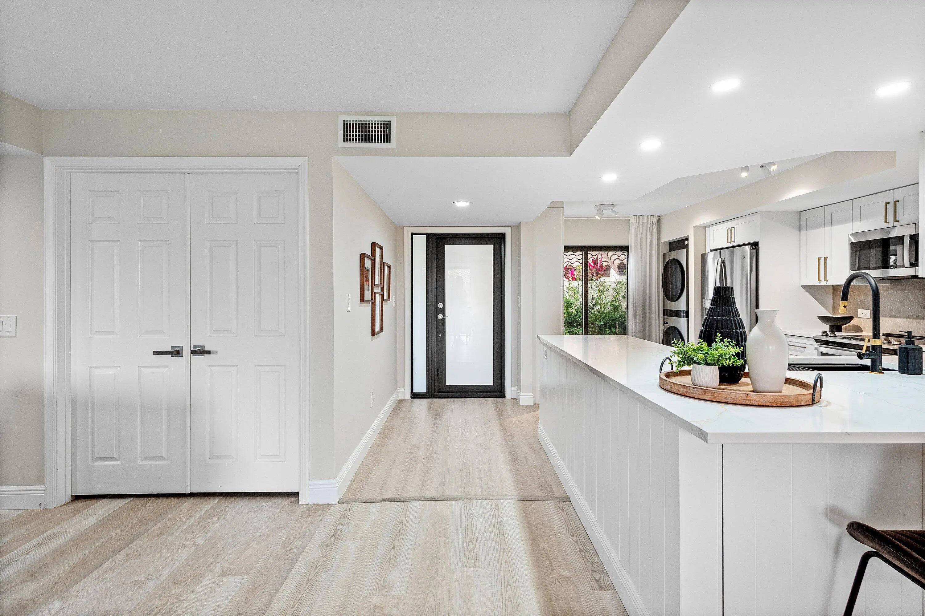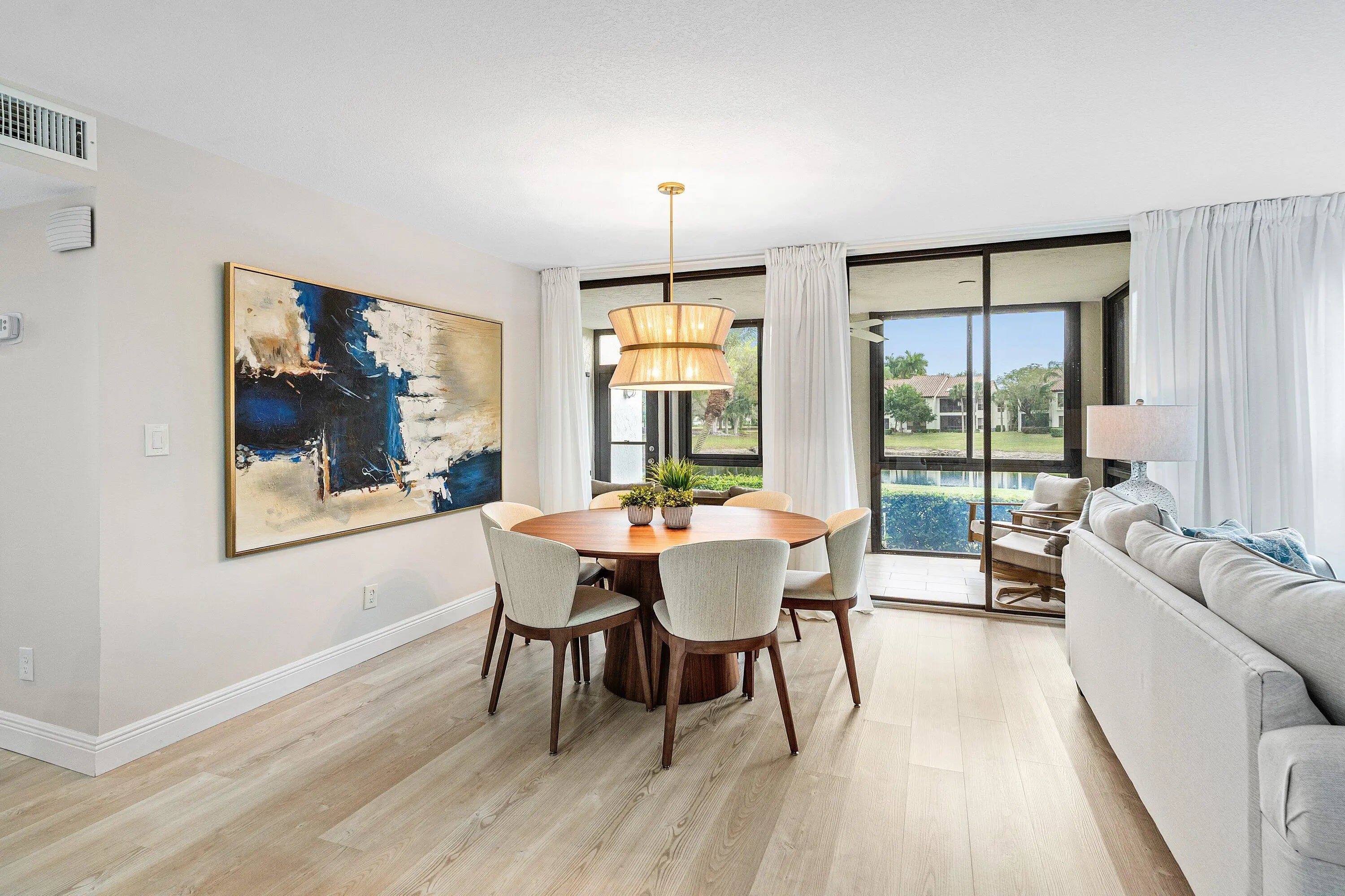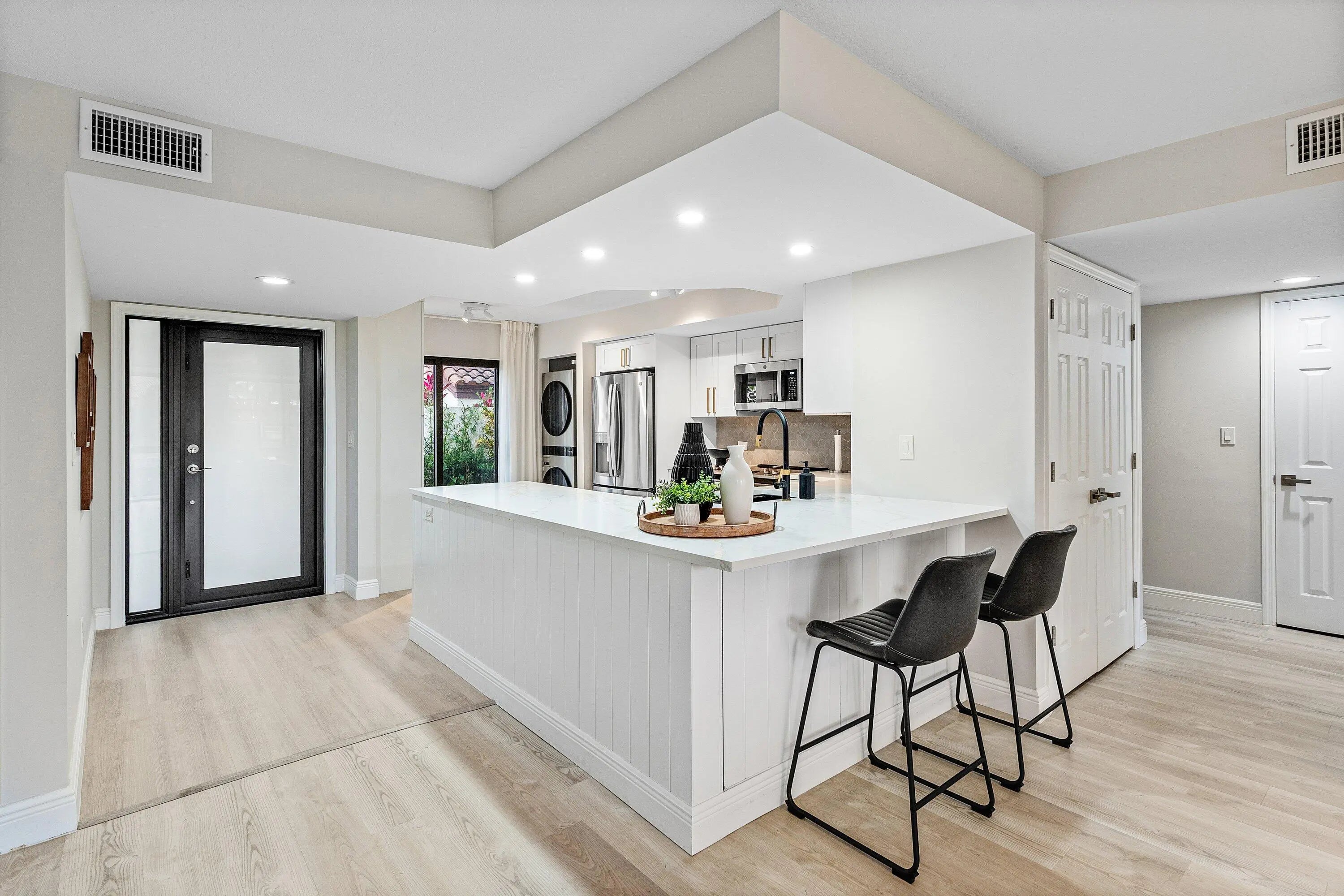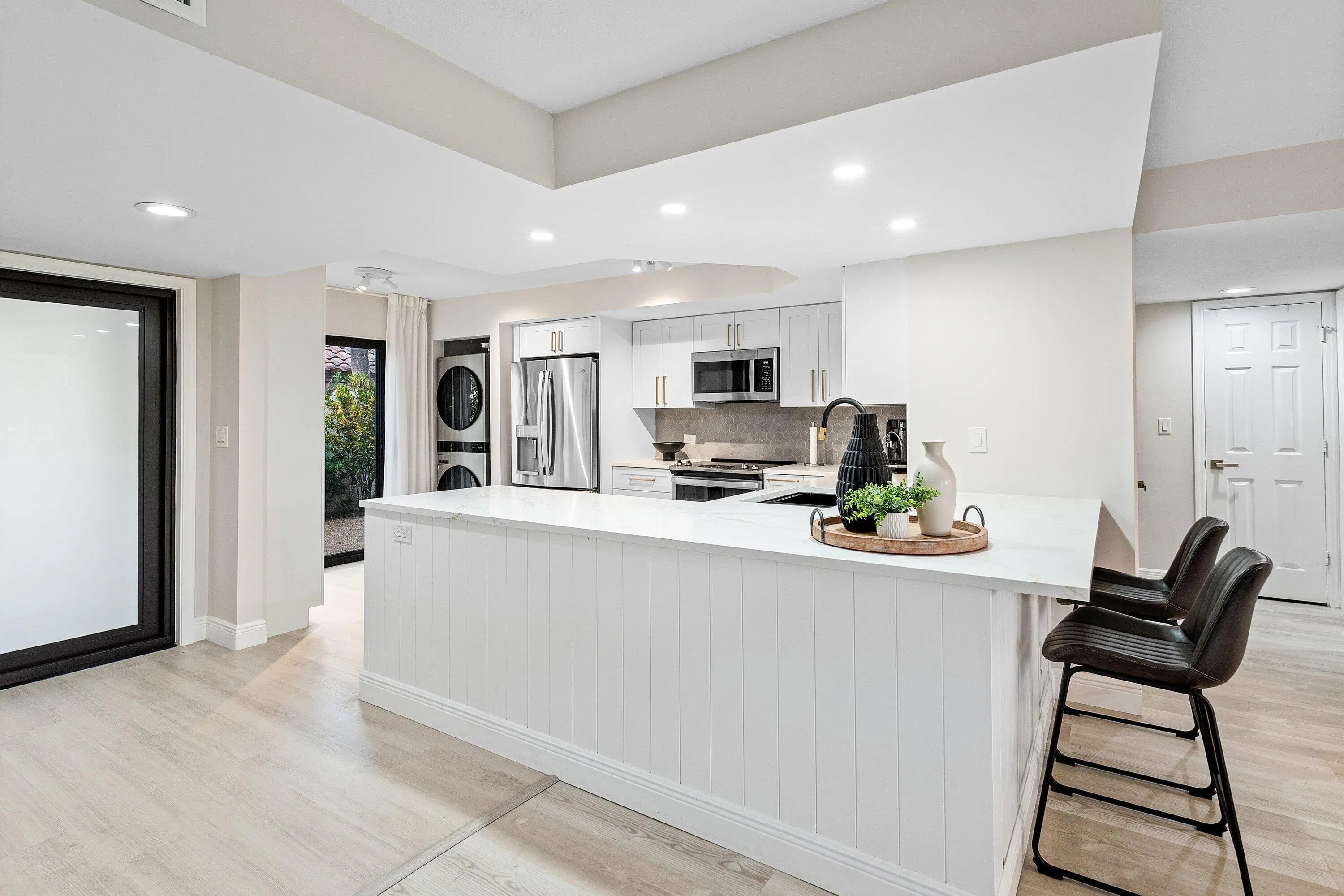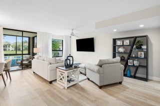 Welcome to your dream oasis at El Viento of Boca Pointe, where luxury meets tranquility in this stunning 1st floor condo. Newly renovated in 2024, this gem boasts an open-concept design that seamlessly blends style & comfort, making a perfect retreat of modern living Step inside to discover 3 spacious bedrms & 2 full baths all adorned with elegant vinyl flooring. The heart of the home features a sleek kitchen complete with quartz countertops, pristine white cabinets & SS appliances. The primary bdrm is a sanctuary of light, featuring fl to ceiling windows w views of the serene lake outside.Unwind in the glassed-in sunroom while enjoying the sites of S. Fl. Guardgated 24/7 for peace of mind. NON MANDATORY membership gives you the flexibility to enjoy all Boca Pt w/o pressure of commitment. Steps from the community pool Boca Pointe is centrally located!