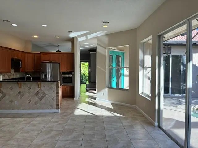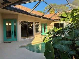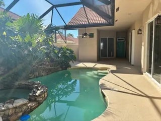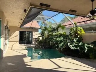 THIS IS A TROPICAL PARADISE, COURTYARD HOME WITH A TROPICAL HEATED POOL/JACUZZI/HOT TUB FALL AND LUSH LANDSCAPING AREA SCREENED IN, HURRICANE RESISTANT IMPACKED GLASS IN THE EAST SIDE $25k UPGRADE. A PRIVATE GUEST SUITE WITH A BATHROOM AND SHOWER AND PRIVATE ENTRANCE. . THE MAIN HOME HAS GRANITE IN KITCHEN COUNTER BAR OVER LOOKS THE POOL TILE FLOORS, FIREPALCE. SPLIT PLAN INSIDE UTILITY ROOM. FAMILY ROOM. LARGE MASTER OVER LOOKS THE POOL AND COURTYARD. MASTER BATH WITH TUB AND SEPERATE SHOWER. WALK IN CLOSET. PLANNED COMMUNITY OF 1200 HOMES LARGE LAKE TO WALK AROUND, GATED AND GUARDED ENTRANCE. COMMUNITY POOL, TENNIS, CLUB HOUSE. WALK TO SHOPPING AND RESTAURANTS.