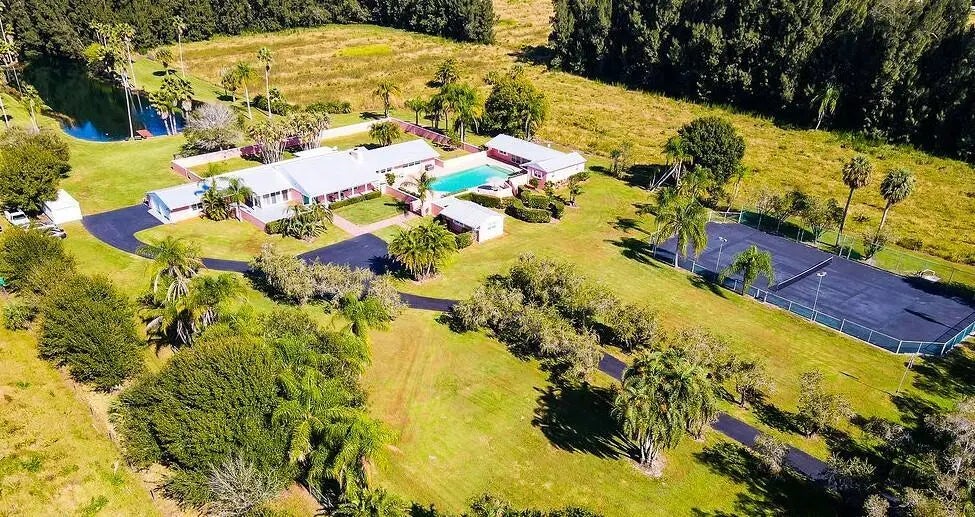 Welcome home to a rare Old Florida private estate situated on 4.33 lush acres offering exceptional privacy and timeless character. Mature palms, expansive grounds, & tranquil water views create a one-of-a-kind setting close to shopping, dining & beaches. The main residence features 4 bedrooms and 2.5 baths with terra-cotta tile flooring, wood cathedral ceilings, and an eat-in kitchen with granite countertops. A private courtyard-style saltwater pool separates the main home from the guest house featuring a full kitchen, 2 baths and private sauna. A additional detached building offers added versatility. This property also includes a pond with dock, retired tennis court, gated entry, CBS construction and metal roofs, A legacy property offering privacy, authenticity and timeless Florida charm Improvements: Water system 2022. Pool - saltwater conversion in 2022. New windows/sliding door in guest house 2023, Tile and bathroom update in small office in 2025, New front electronic gate in 2025 and, Full exterior painting Dec 2025.
