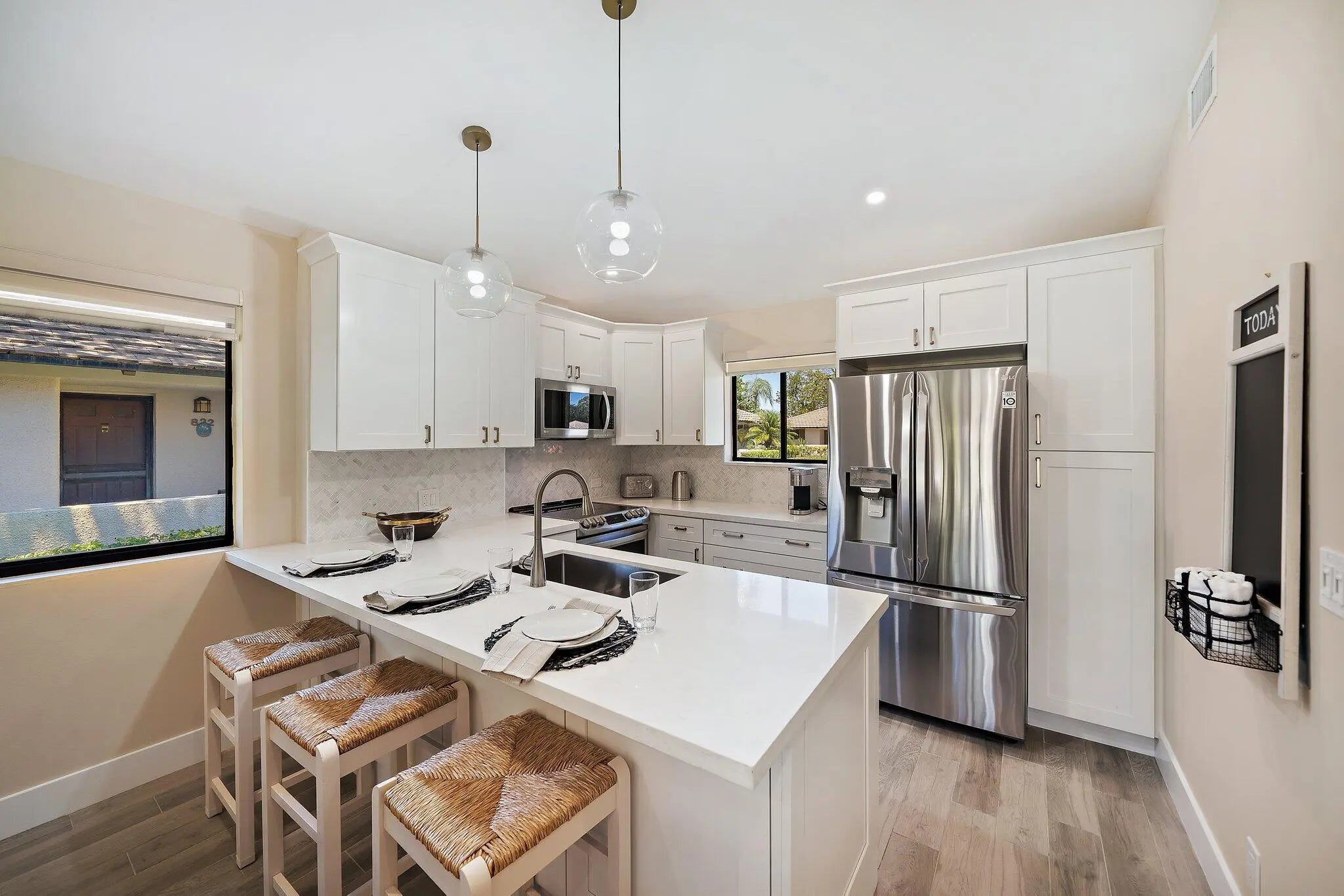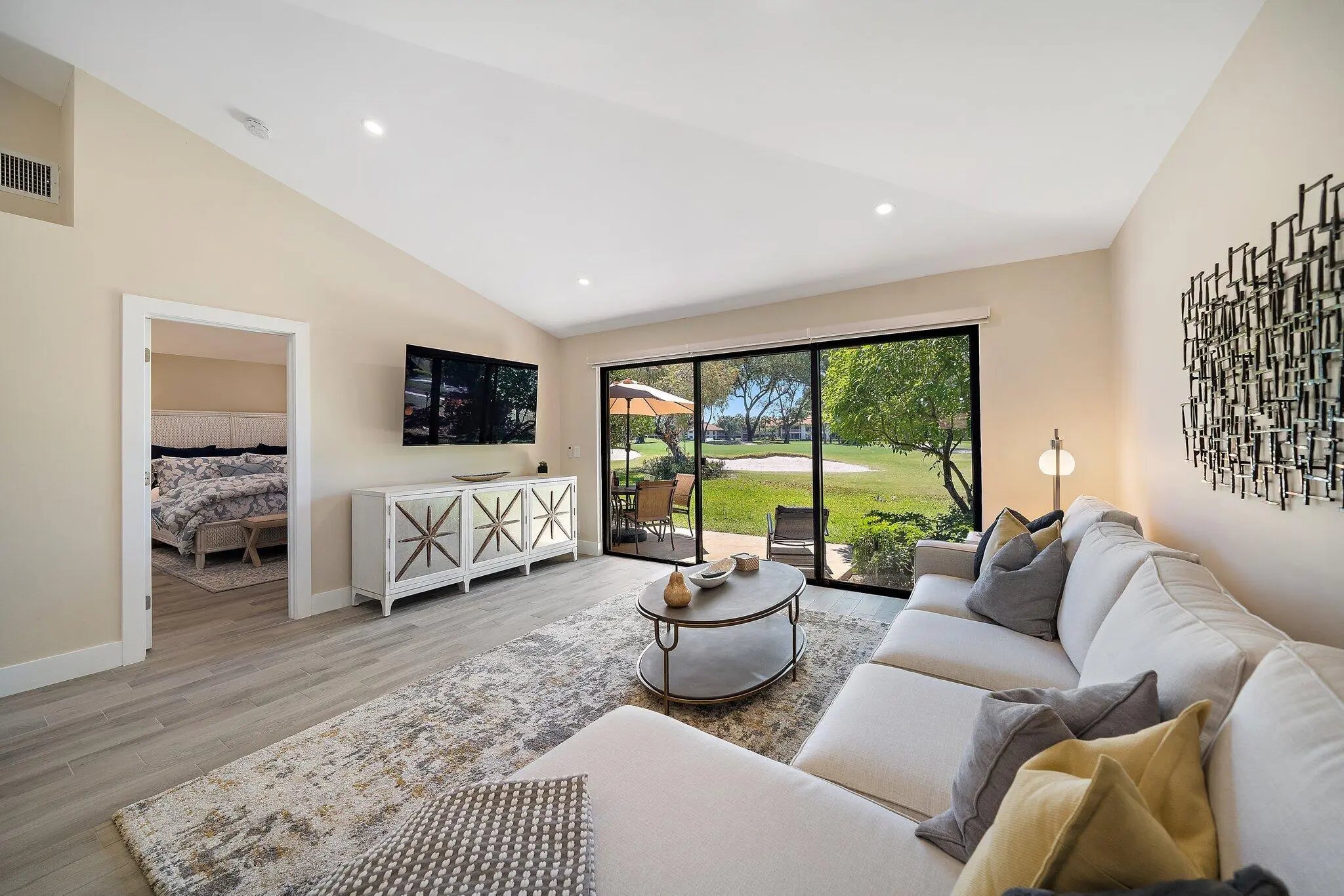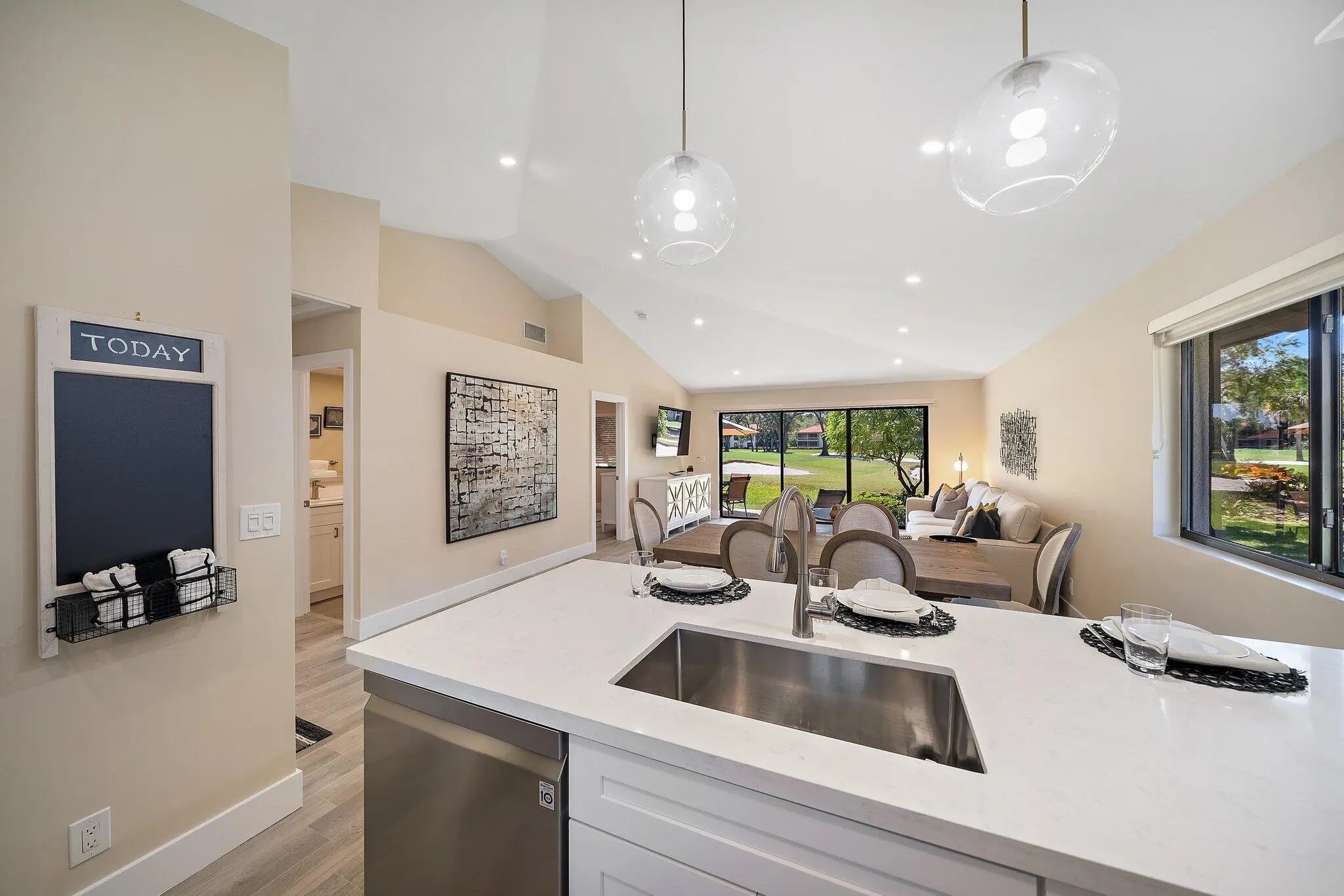 Beautifully Renovated Cottage With Incredible View. Stunning remodel of this light and bright designer decorated Club Cottage. Idyllic location overlooking the newly renovated Par 3 course. Completely renovated in 2021. 2 bedroom/2 full baths at PGA National Club Cottage located inside the prestigious gated community which is home of the Honda Classic. Walking distance to the Pedestrian Bridge which takes you to the Resort, Spa, Restaurants and Bars. The cottage is tastefully decorated with everything you need to feel at home including but not limited to fine furnishings, 3 large flat screen smart tvs (65'',55'',43'') full size washer/dryer and wifi throughout the home. NO PETS. The open plan kitchen includes quartz countertops, stainless steel appliances, garbage disposal and all the dishes, utensils and glassware to make your stay comfortable. Bathrooms are fully renovated with marble and porcelain tiles, quartz countertops. Master walk-in shower and guest tub/shower combo. Master bedroom has a California King bed with a hybrid mattress, walk-in closet and plenty of drawer space. The Guest Room has a queen size bed with a memory foam mattress. Sit inside, or out on the patio and enjoy the amazing view of the golf course and waterway. Relax on the patio while barbequing on the Weber Grill. Enjoy golfing, shopping and fine dining just minutes away. Only 10 minutes to the prestigious Gardens Mall, 20 minutes to pristine beaches and 20 minutes to Palm Beach Airport! The surrounding area has over 100 restaurants from which to choose.