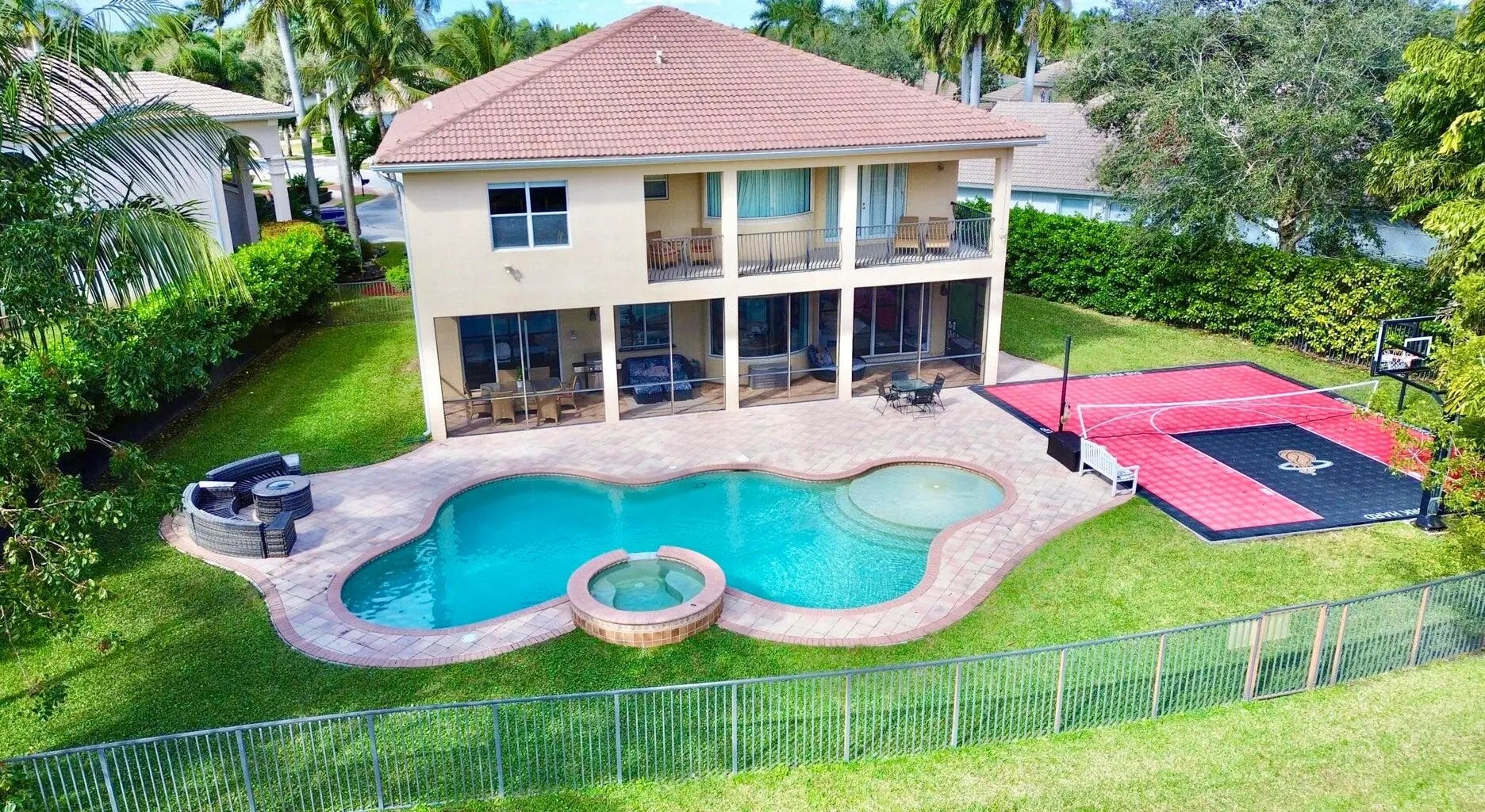 Set on an oversized, private cul-de-sac lot, this exceptional lakefront residence in Canyon Lakes delivers the ultimate Florida lifestyle. The resort-style backyard is a true retreat, featuring a sparkling pool with sun shelf, relaxing hot tub, and a new pool heater for year-round enjoyment. The expansive yard includes a custom sports court designed for basketball, volleyball, and pickleball, while mature palm trees create serene spaces to unwind. An additional 500 square feet of screened outdoor living space provides the perfect setting for grilling, dining, entertaining, and seamless indoor-outdoor living. Inside, this spacious six-bedroom home showcases crown molding, plantation shutters, hardwood floors, custom closets, and a dedicated movie room highlighted by a hand-painted mural for memorable family nights. The open-concept redone kitchen is ideal for both everyday living and entertaining, offering a pass-through window, built-in bench seating, and a walk-in pantry. The expansive primary suite is a true sanctuary with vaulted ceilings, custom walk-in closets, a sitting area, and access to a covered veranda overlooking the lakeperfect for enjoying sunrise views. The primary bathroom has been fully renovated, offering a luxurious, spa-like experience. Conveniently located within walking, biking, or golf-cart distance to A-rated schools, parks, and popular dining, this home is a rare opportunity in the Canyons. With space to grow, play, and entertain, this remarkable property offers Florida living at its finest.