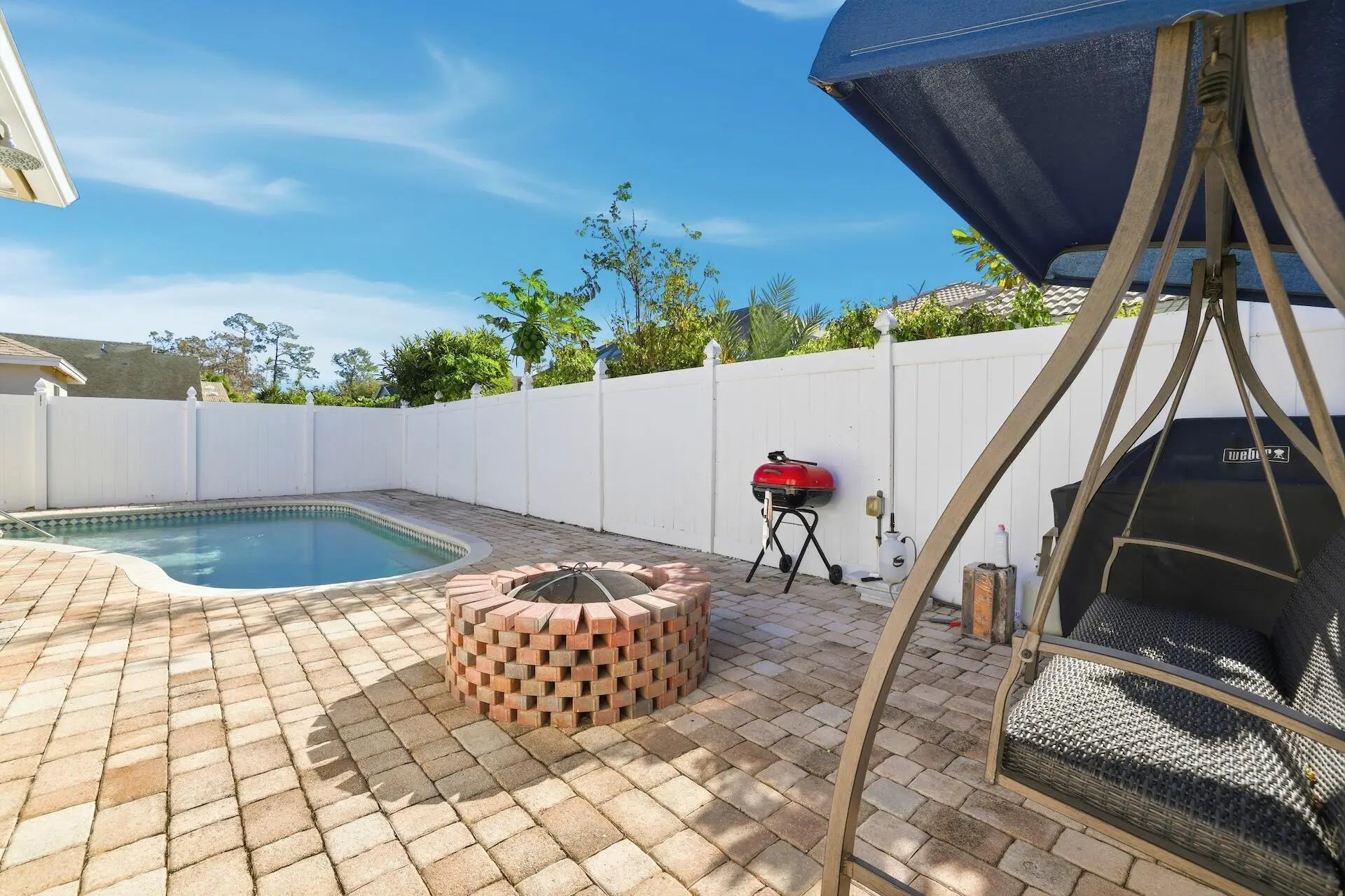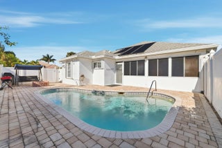 Charming pool home that is ideally situated on a corner lot with privacy fence. This home features a desirable 3 way split bedroom plan, crown molding, eat-in kitchen with newer dishwasher & microwave, newer Central Air (2 years) and water heater 1 year. Enjoy energy efficiency Solar panels installed in 2019 with average electric bill $35.00 and accordion shutters for hurricane protection. Sprinkler system is on a well for added savings. Private Inground pool with salt system, custom built fire-pit, bonus enclosed lanai patio perfect for home office or bonus room. Inside laundry room with wash tub and storage cabinets. Primary bedroom with walk in closets, newer primary bath, all tile thru out home. Close to equestrian venues and ''A'' rated schools.