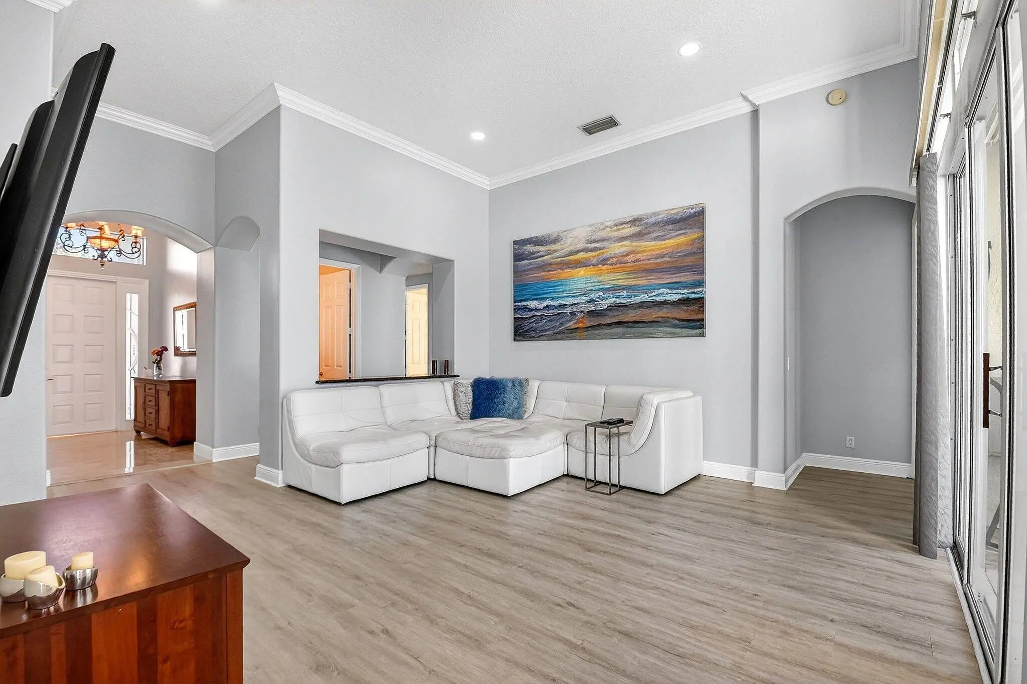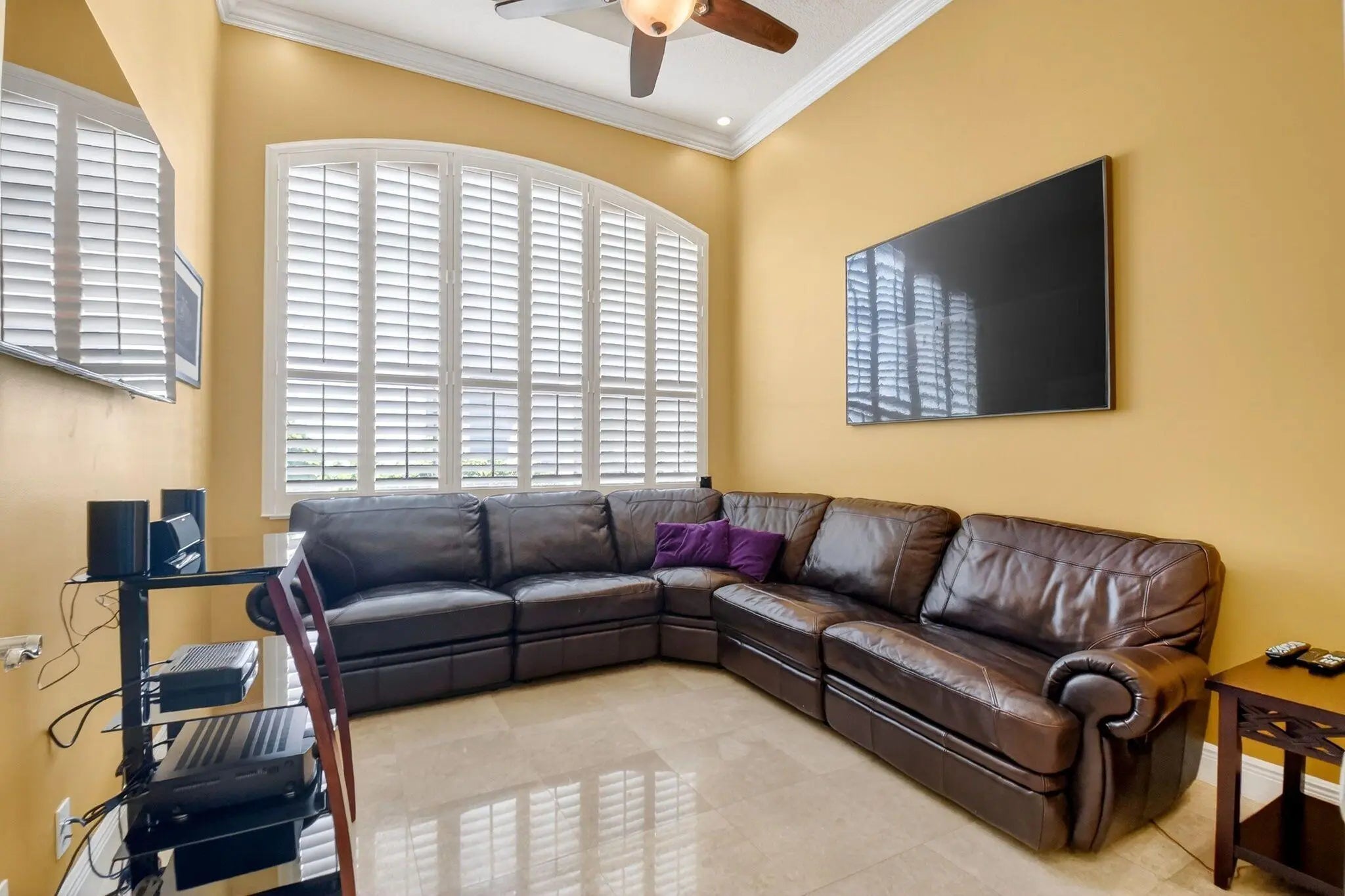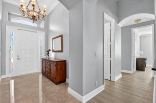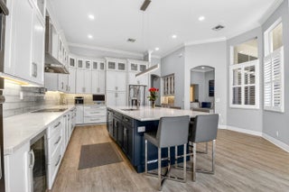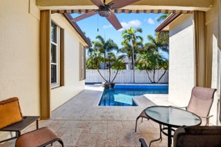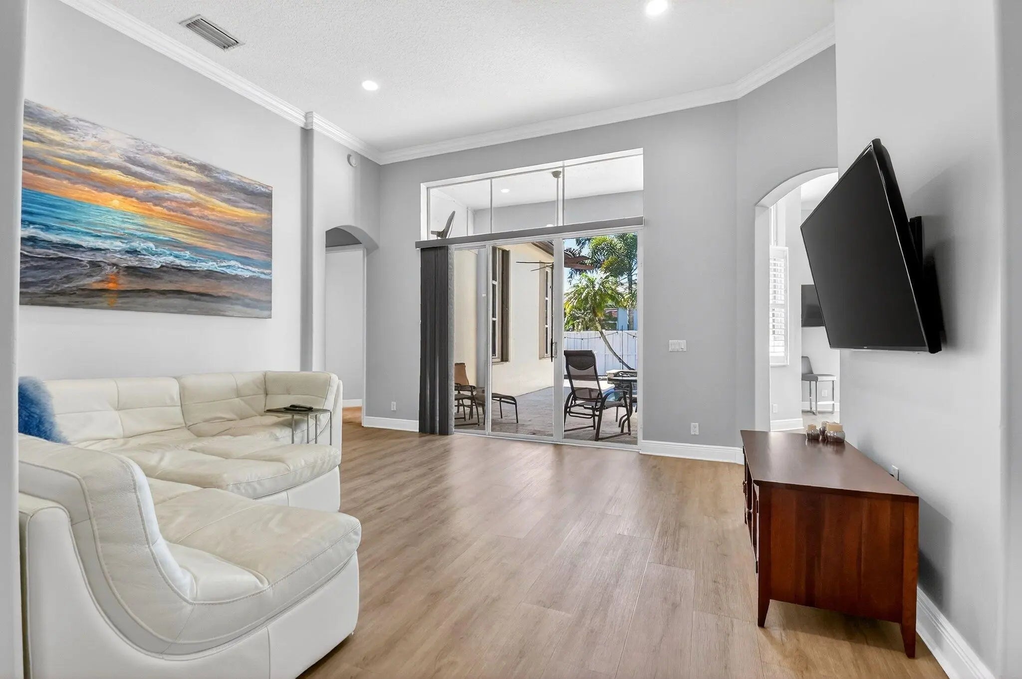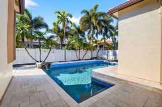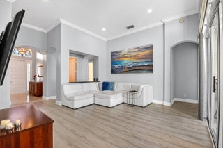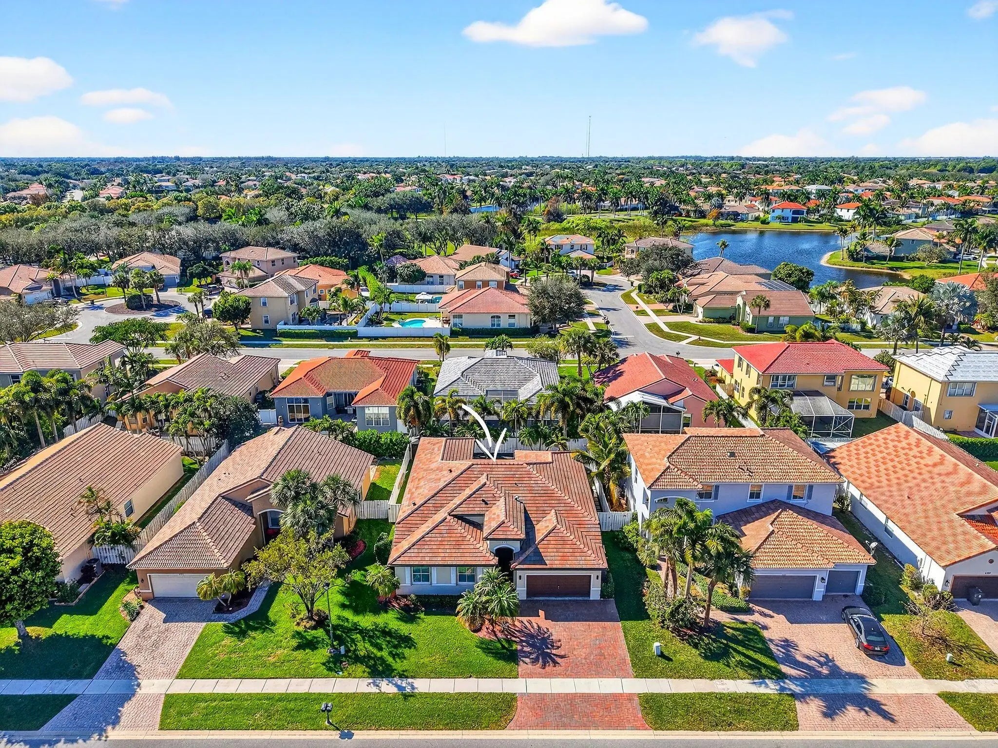 From the moment you pull up to this home, you'll probably notice the expanded three-car paver driveway. Perhaps you'll even notice the new, pristine 2023 flat tile roof. But I guarantee that you will notice, and fall in love with, the kitchen that dreams are made of. The heart of this home is a chef's masterpiece: a magnificent, expanded kitchen featuring a massive quartz island, stainless appliances including a beverage refrigerator, tons of cabinetry including stacked upper cabinets with glass-front displays, two pantries, pullout drawers, special storage for spices and knives, and a pot-filler over the stove. The spacious floor plan offers four bedrooms plus a versatile bonus den/office, accented by luxury plank flooring, crown molding, plantation shutters and beautifully updated bathrooms. Step outside to your private backyard sanctuary, fully fenced and featuring a sparkling pool with travertine deck, a waterfall feature, electric awning, outdoor shower, and a handy storage shed. Living here means more than just a beautiful home; it's a lifestyle. Located in an A-rated school zone, this manned-gated community offers 24/7 security with a PBSO officer dedicated to our community, and an expansive clubhouse featuring on-site management, tennis, pickleball, weight room, cardio room, banquet room with kitchen, card room, basketball, volleyball, ball field, and tot lot. Schedule your private showing today!