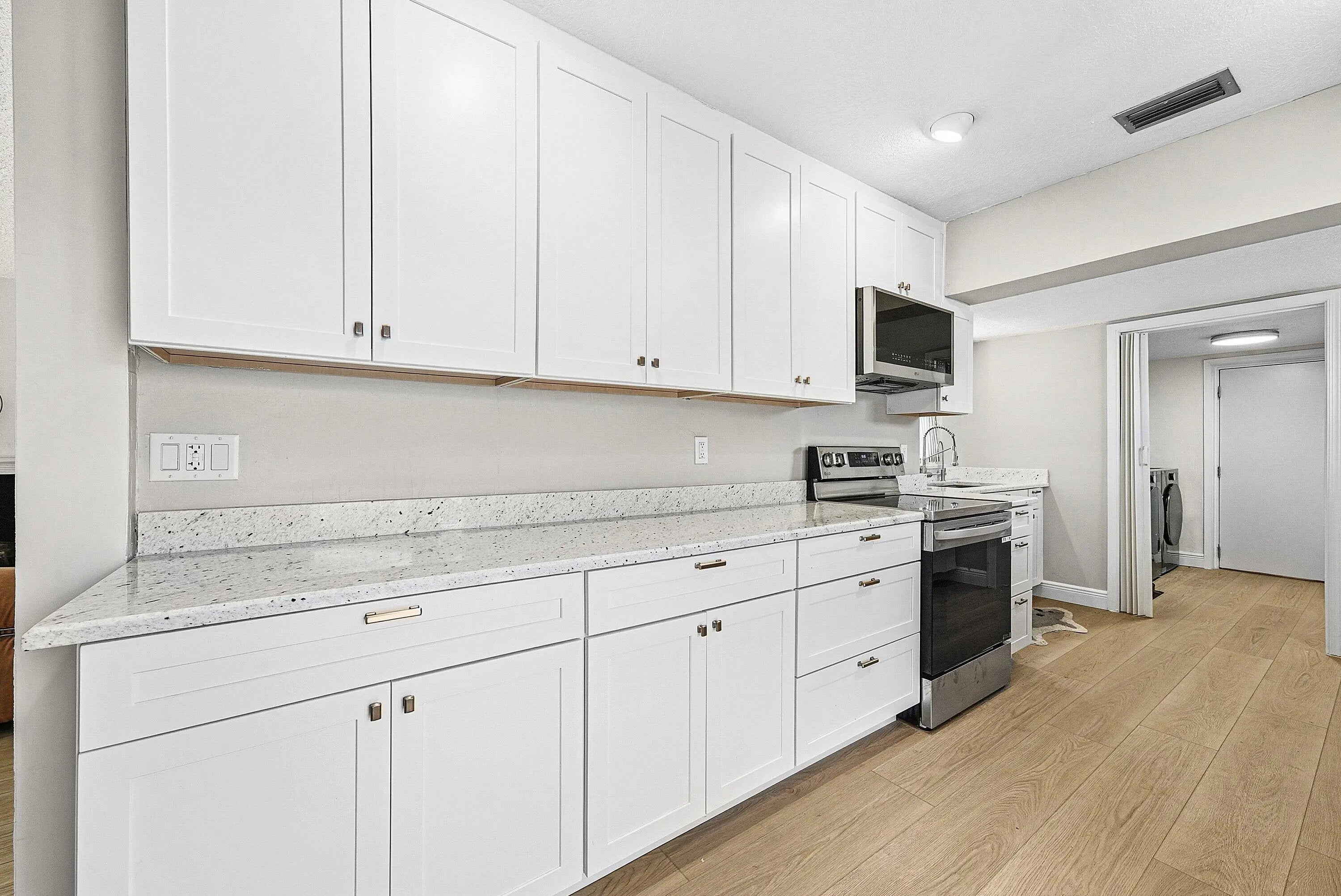 Stunning 3BR/2BA residence in East Boca with NO HOA! Updates include a brand-new kitchen featuring custom white shaker cabinetry with plentiful storage, exquisite white granite countertops, and premium LG appliances. The expansive living area features luxury vinyl plank flooring that flows seamlessly throughout the entire layout. The primary suite is a private retreat with a large walk-in closet, a modernized en-suite bathroom, and French doors that open to the tropical backyard oasis with pool. The second bedroom also allows for direct patio access, while the spacious third bedroom includes its own updated en-suite bath and a walk-in closet with exceptional storage. Other highlights include a tranquil enclosed atrium off the dining area, a wood-burning fireplace, and a dedicated laundry room under air with new LG washer & dryer and floor-to-ceiling cabinetry. Enjoy total peace of mind with new water heater (2025), AC (2024), and impact-rated windows. Located a mile from the beach and minutes to Mizner Park, Atlantic Ave in Delray and I-95 in an A-rated school district. This residence combines modern luxury with an unbeatable location. Schedule your private tour today!