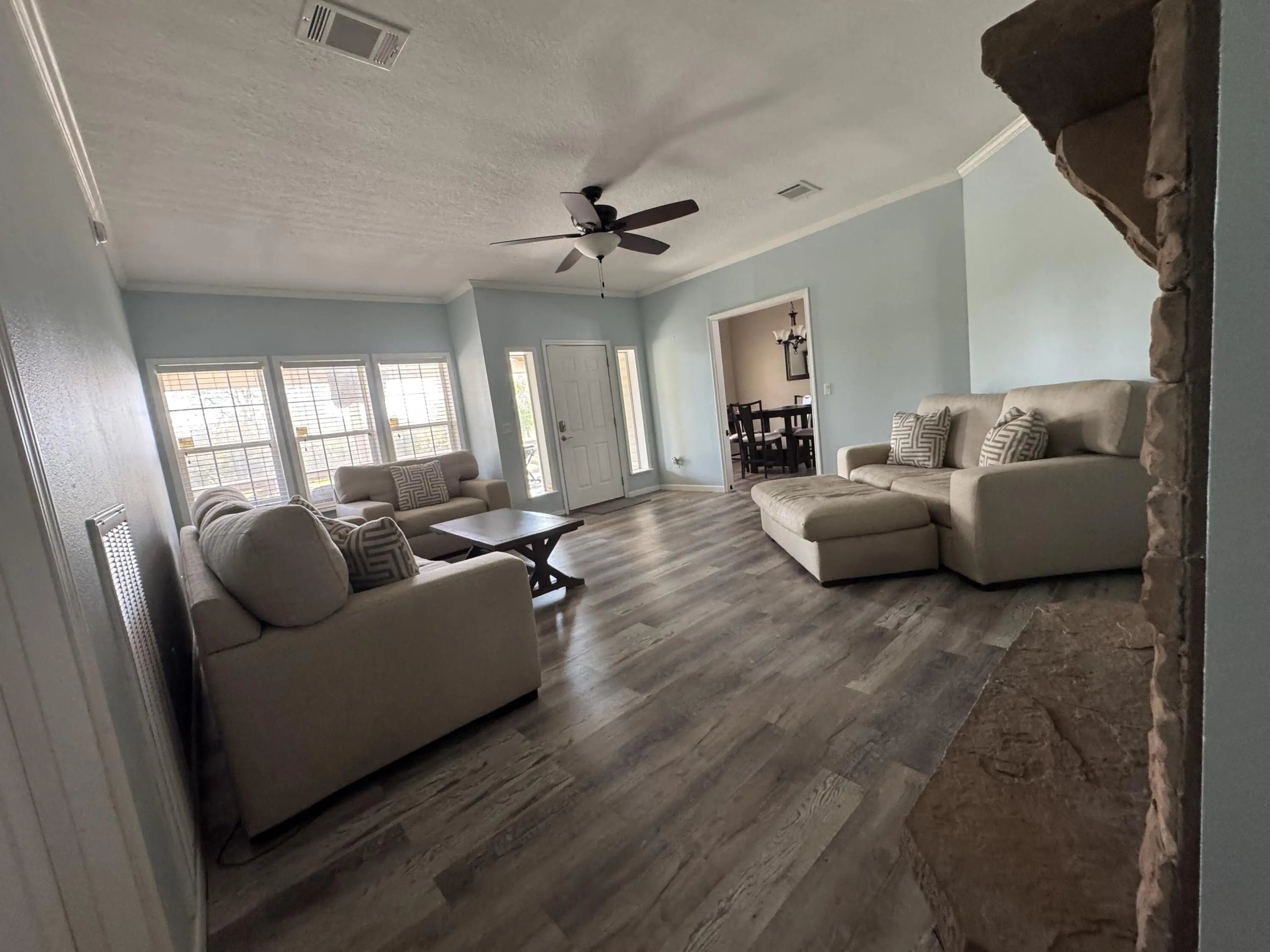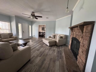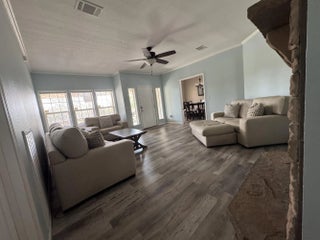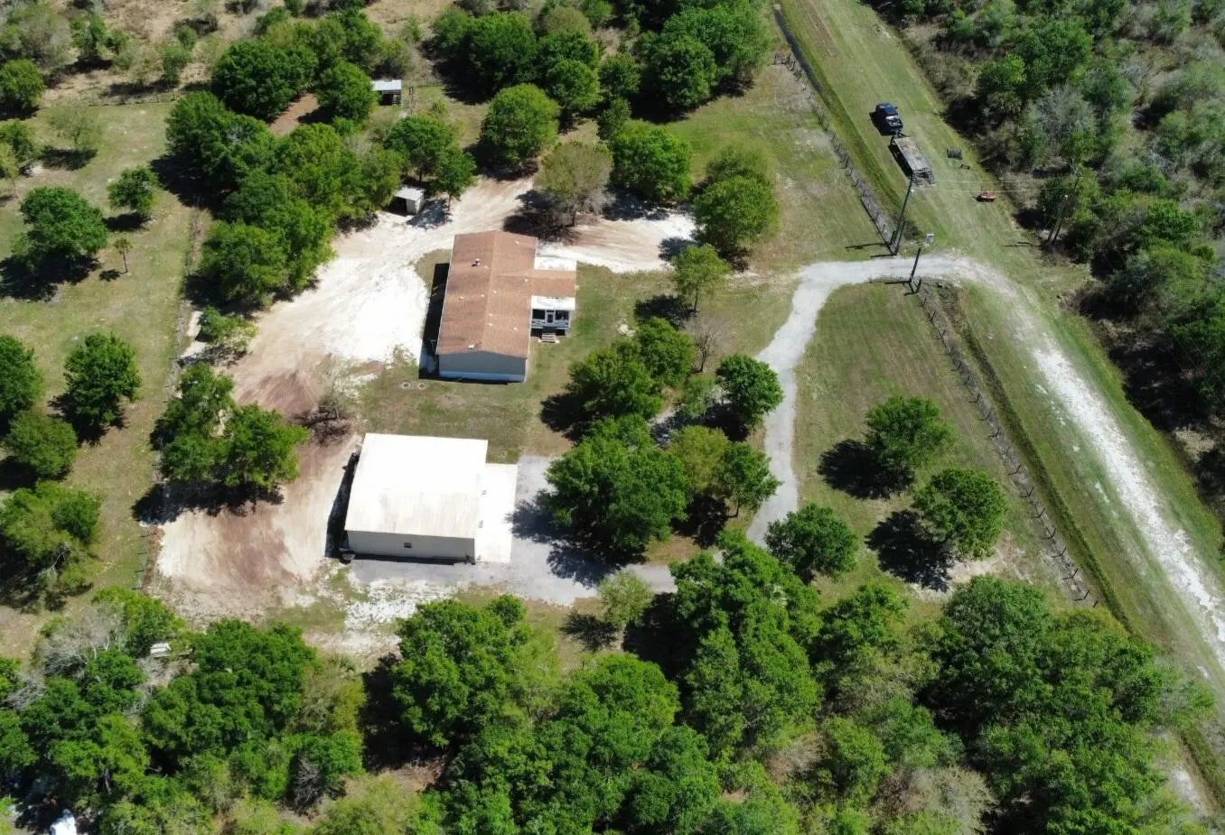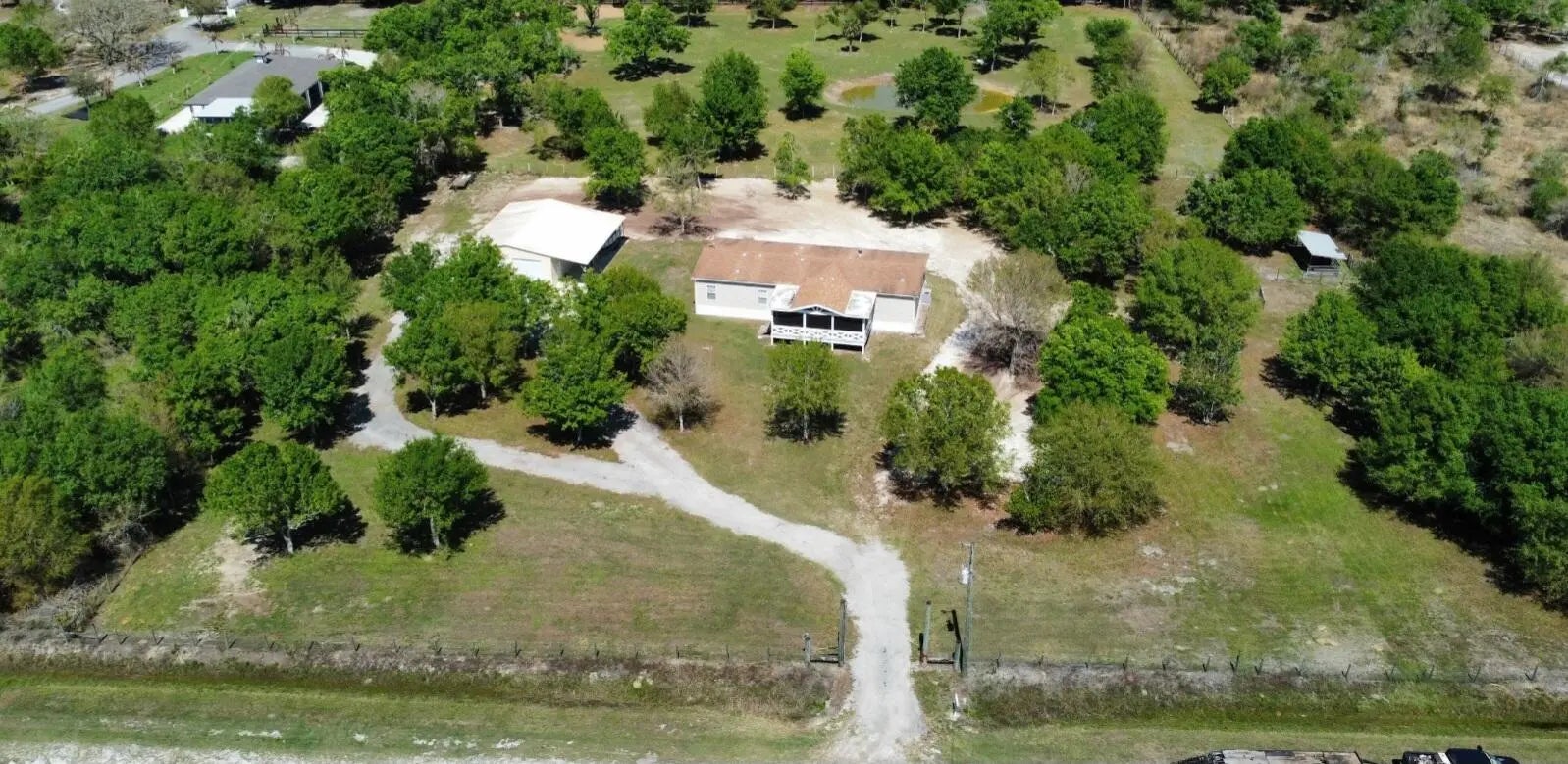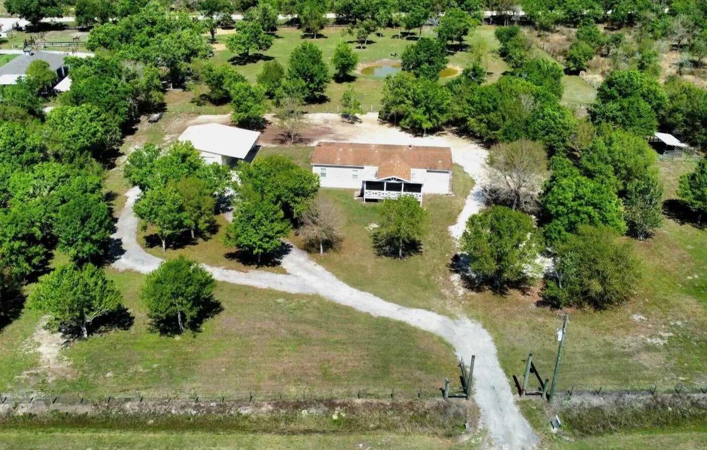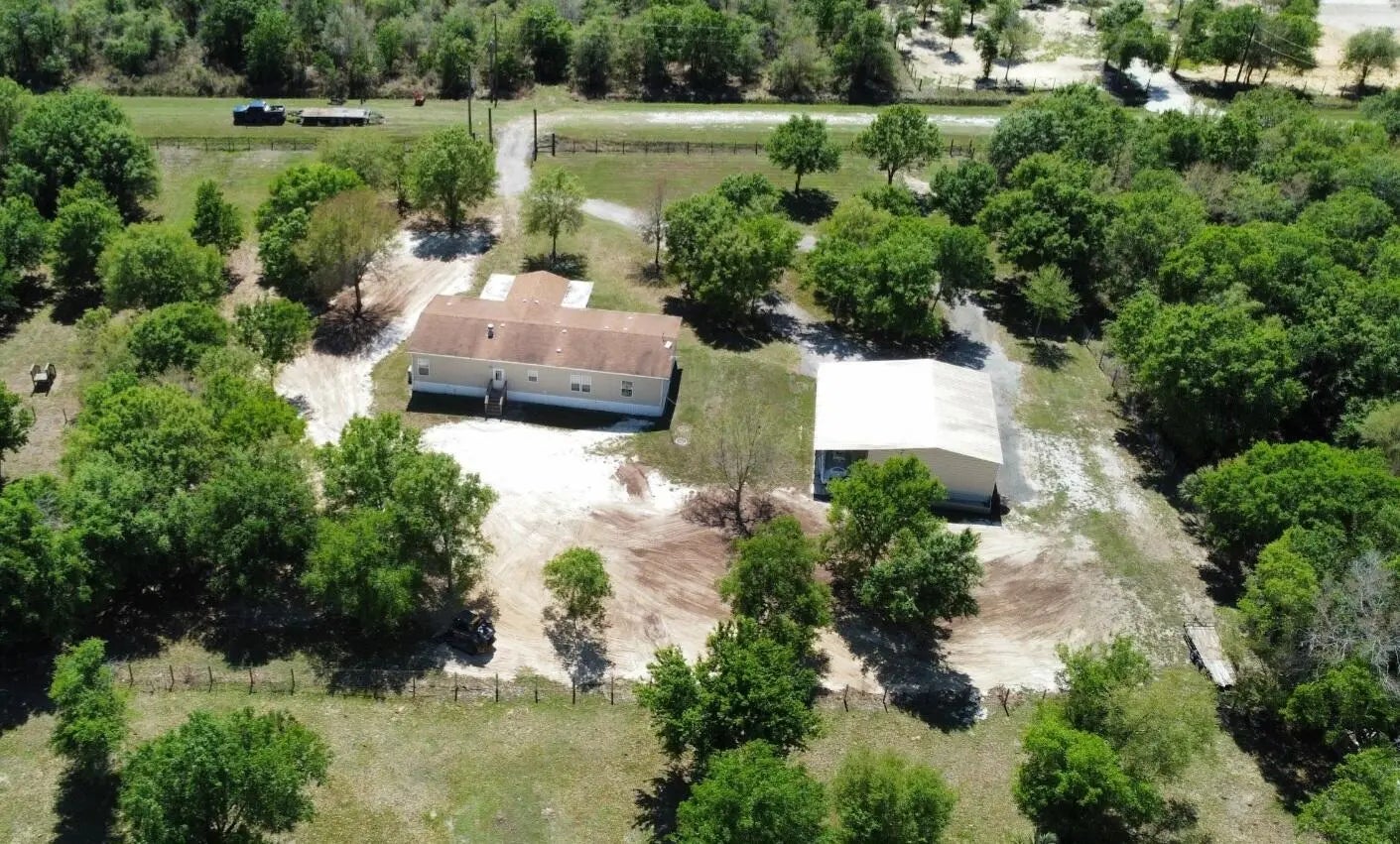 Spacious 4BR/2BA home on 2.5 fully fenced acres offering privacy and space. Well-maintained property with the home centered on the lot. Three bedrooms include walk-in closets, while the fourth is ideal as an office or craft room. Functional interior layout features two separate living rooms, formal dining room, large kitchen, and spacious laundry/mud room. Enjoy outdoor living on the screened-in front porch with vaulted ceiling and TV hookup. Exterior highlights include a quiet road, mature oak trees, expansive yard, plus an additional fenced agricultural area with two pens for animals or hobby use. Steel building garage with two 10-ft automatic doors provides space for 6-8 vehicles, equipment, or workshop use. Peaceful country living with beautiful sunrises and sunsets. Peaceful retreat!