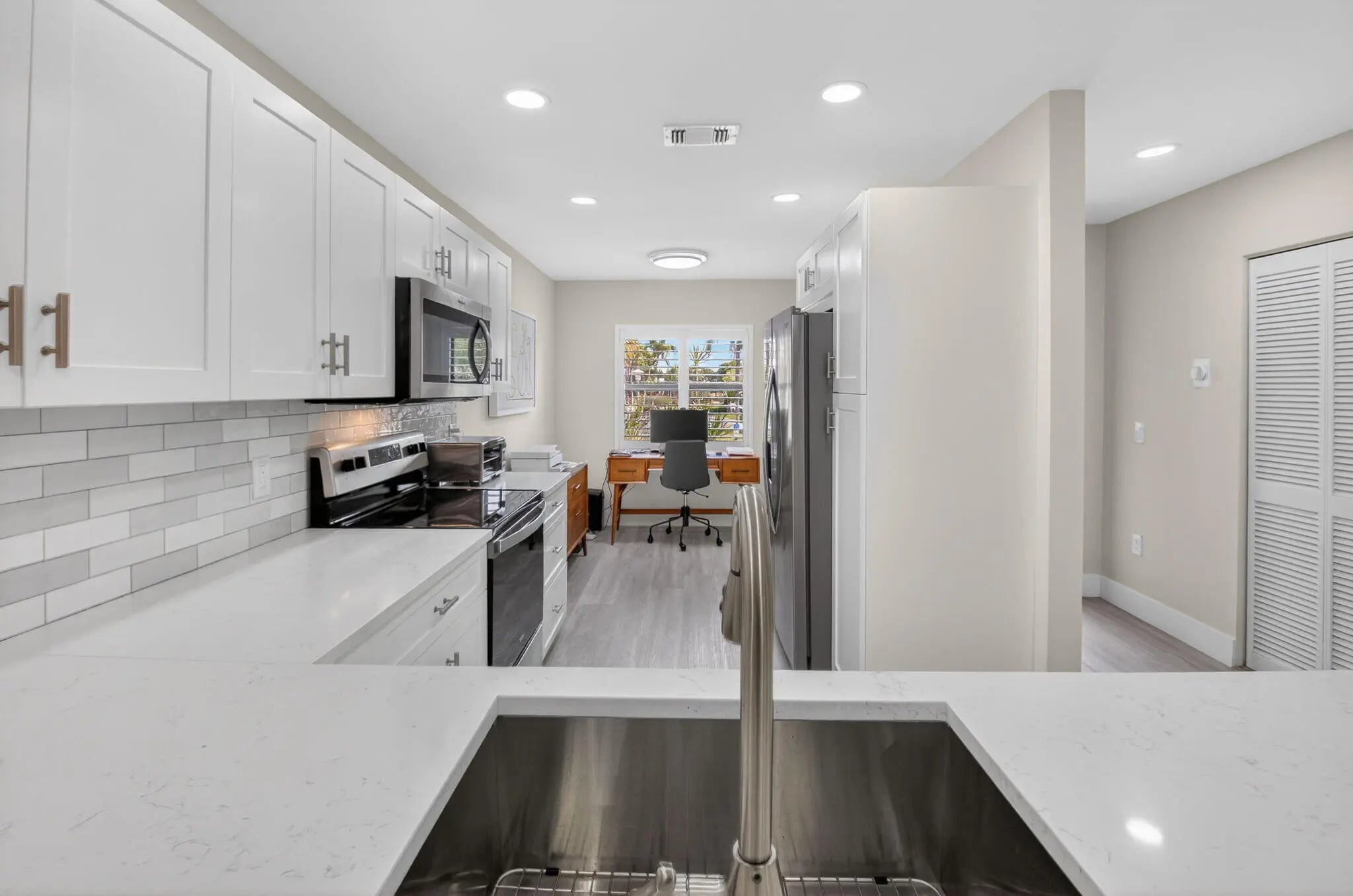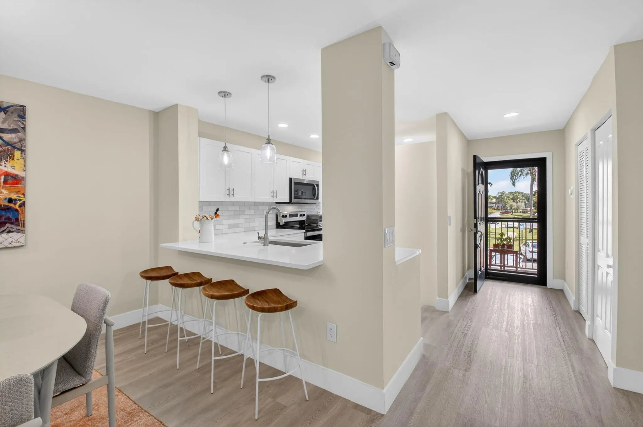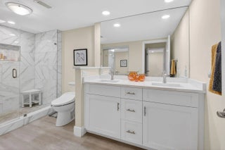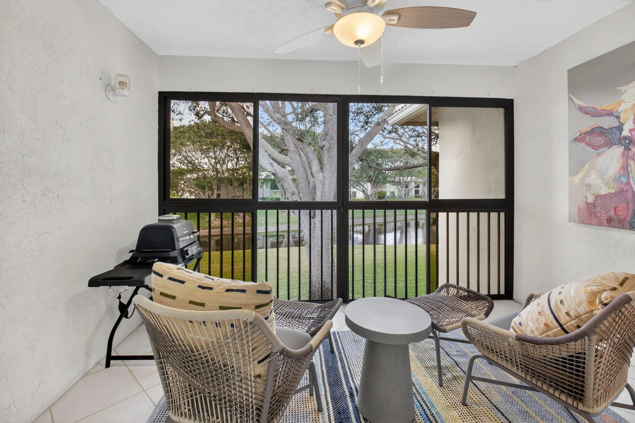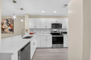Experience refined country club living in this exquisitely renovated second-floor residence, thoughtfully reimagined through the prestigious Hunters Run Country Club Model Program. Perfectly positioned to capture sweeping lake and golf course vistas, this two-bedroom, two-bath home is bathed in natural light and showcases breathtaking western sunsets from its enclosed lanai with plexiglass sliders — creating a seamless indoor-outdoor lifestyle. The open-concept design blends sophistication and comfort, highlighted by a designer kitchen featuring quartz countertops, stainless steel appliances, a classic subway tile backsplash, custom soft-close cabinetry, and a pullout pantry for effortless organization. MORE... Luxury vinyl flooring flows throughout, complemented by impact glass windows and elegant plantation shutters, offering both style and peace of mind. Offered turnkey for immediate enjoyment, this residence is ideally located just moments from the main clubhouse, placing world-class amenities within easy reach. A rare opportunity to own a beautifully curated home in one of the area's most distinguished country club communities