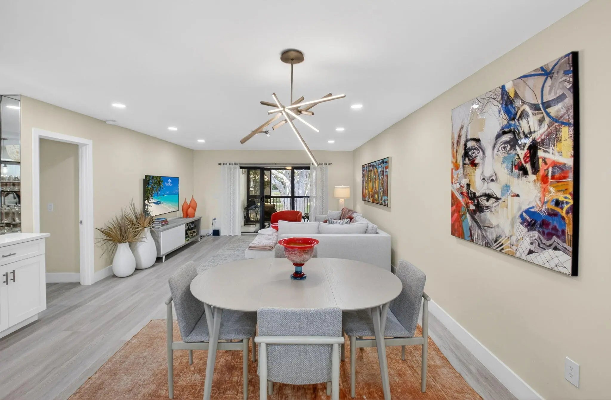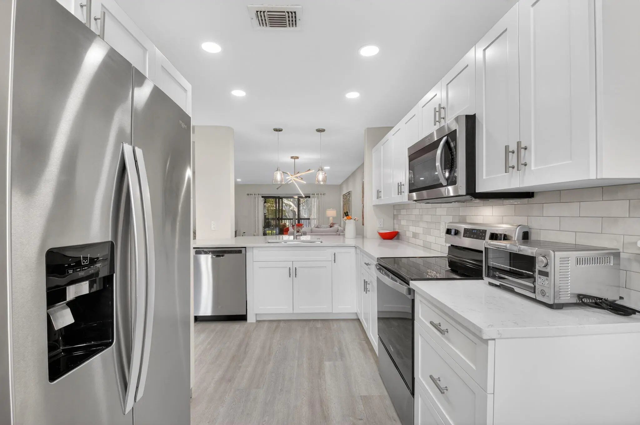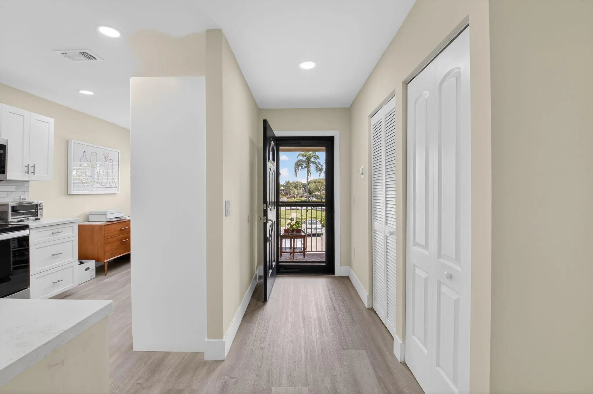 Experience refined country club living in this exquisitely renovated second-floor residence, thoughtfully reimagined through the prestigious Hunters Run Country Club Model Program. Perfectly positioned to capture sweeping lake and golf course vistas, this two-bedroom, two-bath home is bathed in natural light and showcases breathtaking western sunsets from its enclosed lanai with plexiglass sliders — creating a seamless indoor-outdoor lifestyle. The open-concept design blends sophistication and comfort, highlighted by a designer kitchen featuring quartz countertops, stainless steel appliances, a classic subway tile backsplash, custom soft-close cabinetry, and a pullout pantry for effortless organization. MORE... Luxury vinyl flooring flows throughout, complemented by impact glass windows and elegant plantation shutters, offering both style and peace of mind. Offered turnkey for immediate enjoyment, this residence is ideally located just moments from the main clubhouse, placing world-class amenities within easy reach. A rare opportunity to own a beautifully curated home in one of the area's most distinguished country club communities