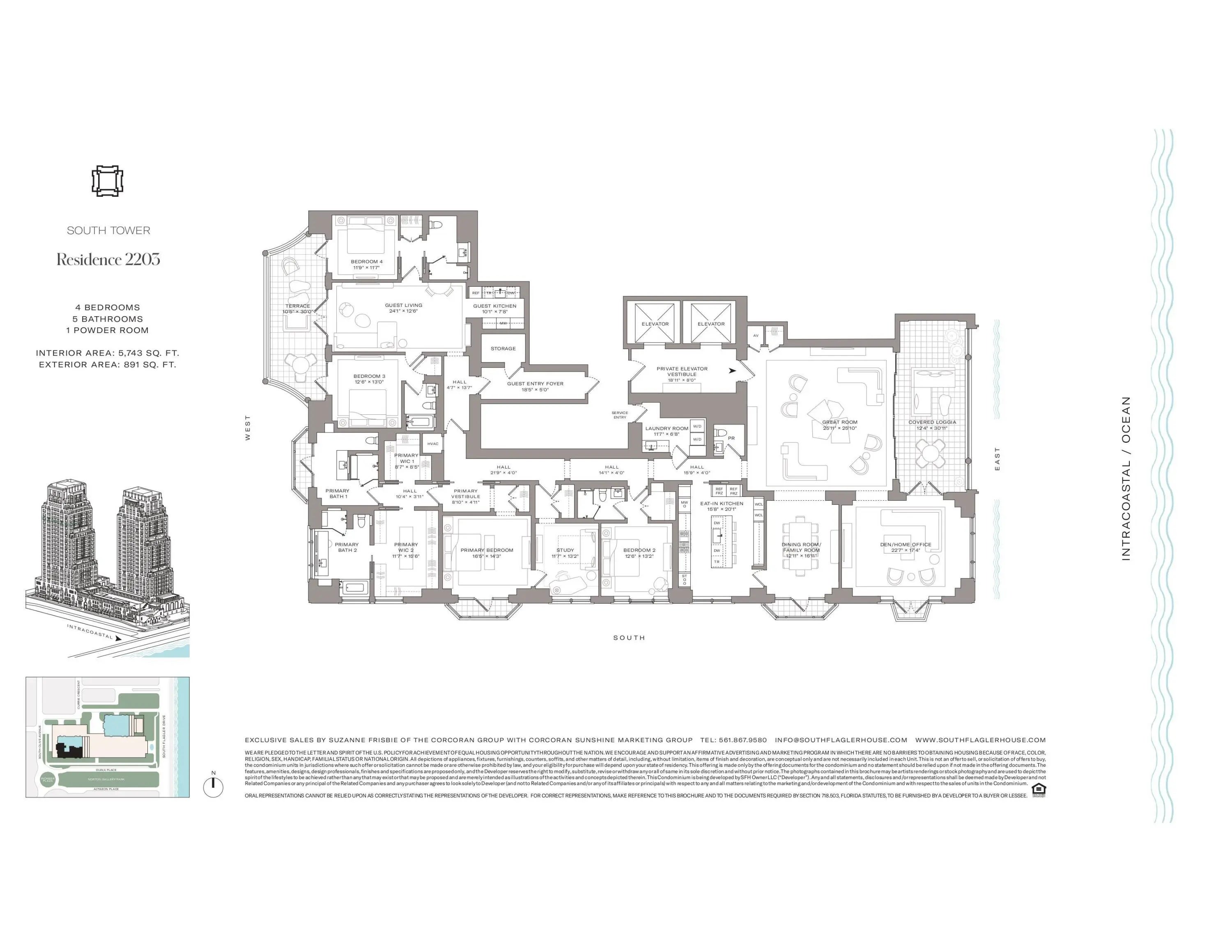 South Tower Residence 2203 at South Flagler House captures the essence of waterfront living with 4 BR and 5.1 BA designed for elegance and ease. A private elevator opens to a sunlit great room with sweeping views of the Intracoastal, Palm Beach Island, and the Atlantic Ocean. The primary suite is a serene retreat with dual baths & dual walk-in closets. Thoughtfully designed for both comfort and entertaining, the residence features an eat-in kitchen, library/office, guest wing with its own private terrace, and expansive outdoor living that seamlessly blends with the interiors. South Flagler House, presented by Related Ross, combines the timeless style of Robert A.M. Stern Architects & the luxurious aesthetic of Pembrooke & Ives, resulting in soulful spaces designed for an enhanced lifestyle. Primely positioned on 3.4 acres along the Intracoastal Waterway at 1355 S Flagler Dr. South Flagler House features two 28-story structures with 105 beautifully appointed 2-to-5-bedroom homes. Representing the single largest amenity offering per residence in all of Palm Beach County. Residents will have access to lifestyle amenities of unprecedented range & quality, with on-site concierge services surpassing those of the most exclusive private members' clubs.