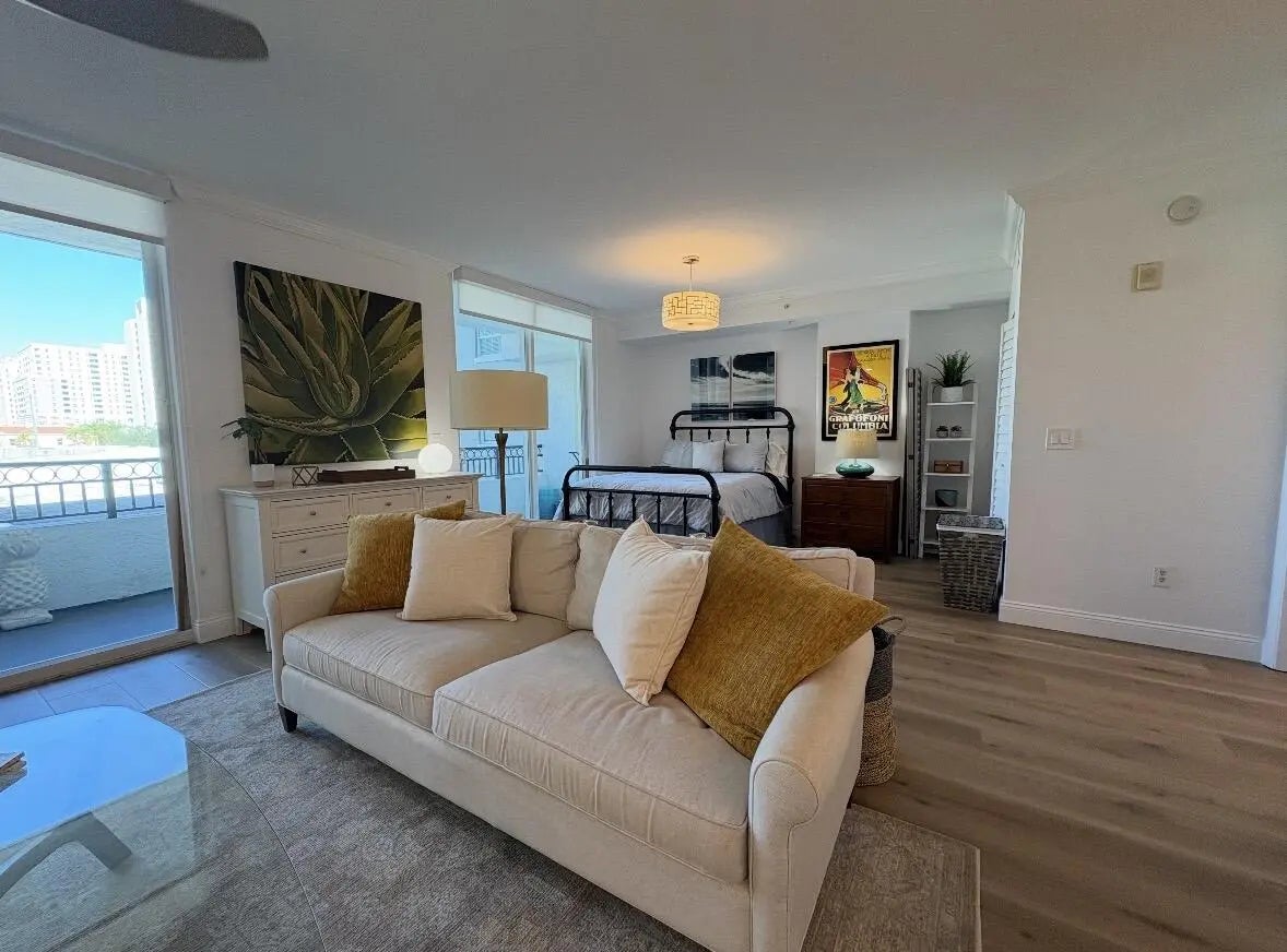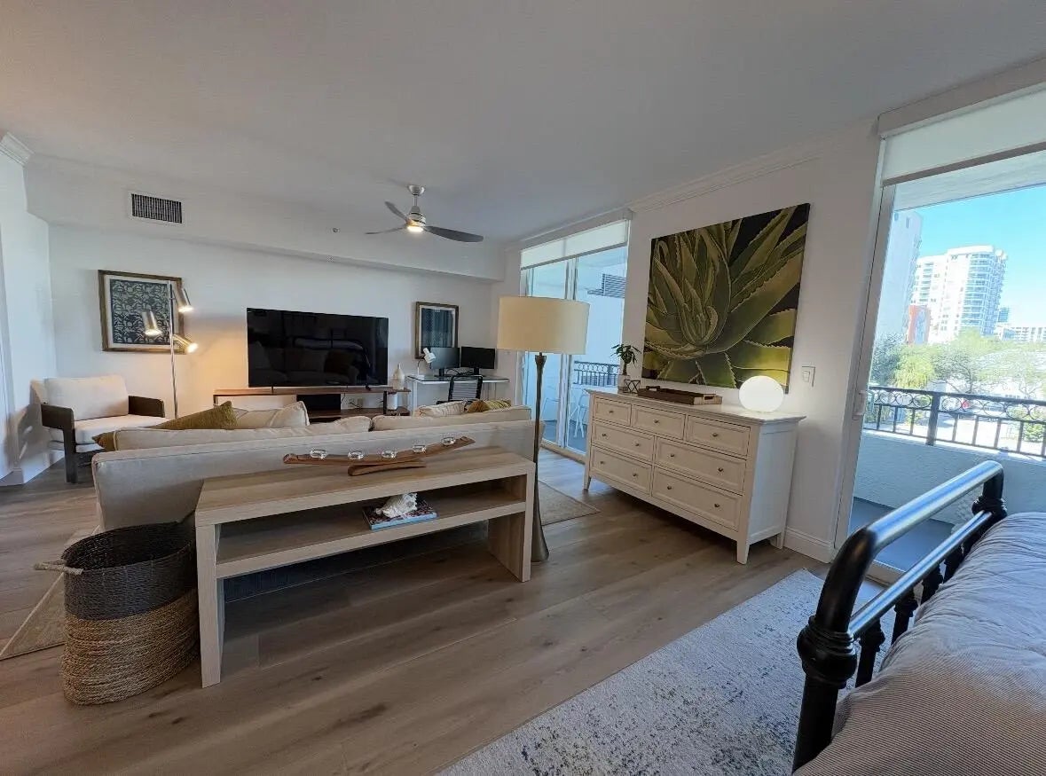 Enjoy upscale downtown living in this beautifully furnished, oversized studio facing north with breathtaking city views. This light-filled residence features high ceilings, an open layout, and an abundance of natural light throughout. The newly renovated kitchen showcases quartz countertops, stainless steel appliances, and a stylish coffee bar, perfect for starting your mornings right. You will find the washer and dryer are conveniently located in-unit, and the spacious bedroom area includes a generous walk-in closet. The large private covered balcony offers the perfect place to relax and take in the city skyline. The oversized bathroom features quartz countertops and ample space, adding to the home's modern appeal. The Prado offers exceptional amenities including a 24-hour front desk, resort-style pool, hot tub, fitness center, sauna, and social room. One assigned parking space in the building garage is included. Ideally located in the heart of Downtown West Palm Beach, you're just steps from shopping, dining, entertainment, the Brightline station, and the waterfront. Enjoy easy access to Palm Beach Island via the North or South Bridge , making beach days effortless. Come and see what downtown living has in store for you!