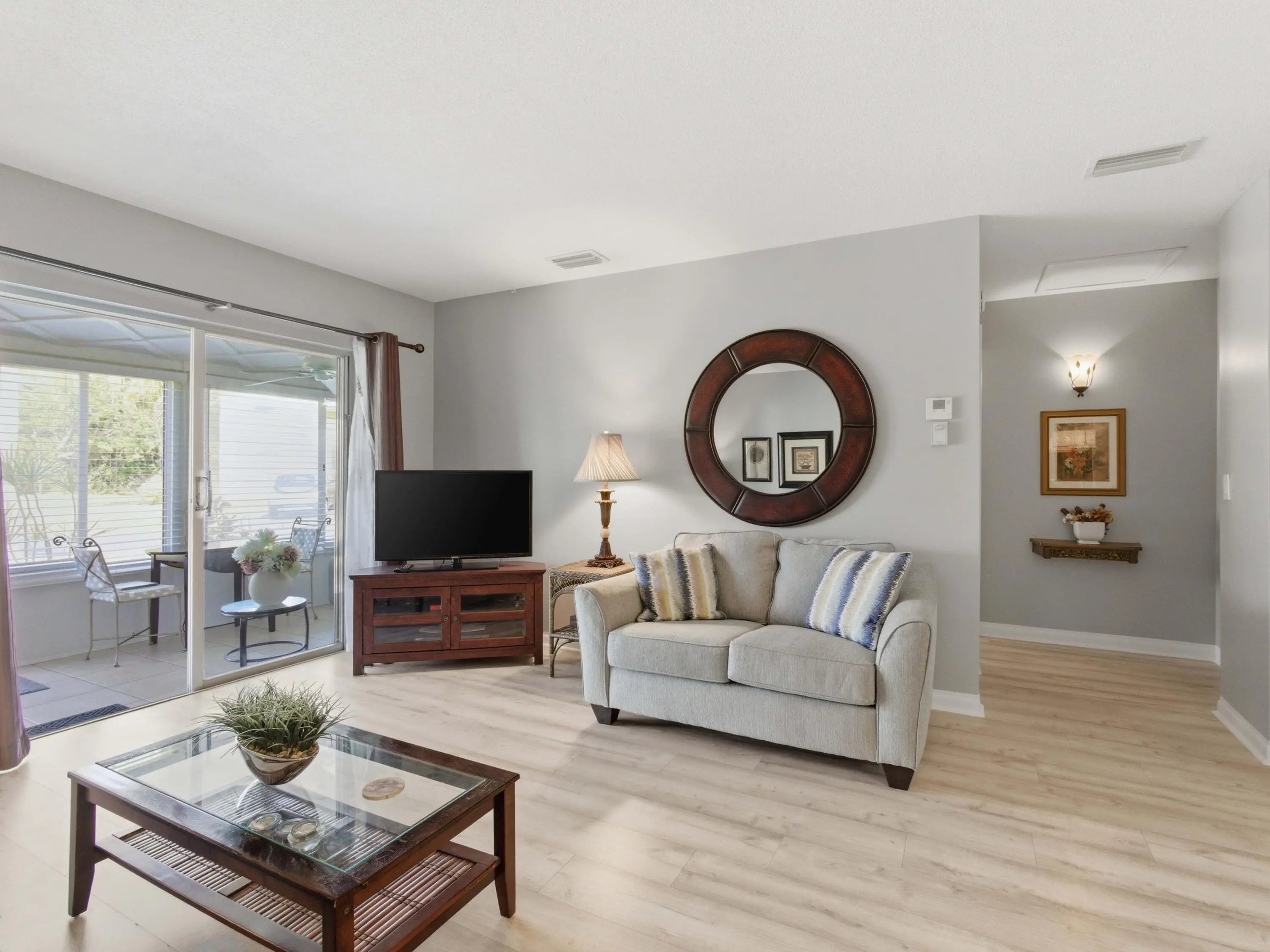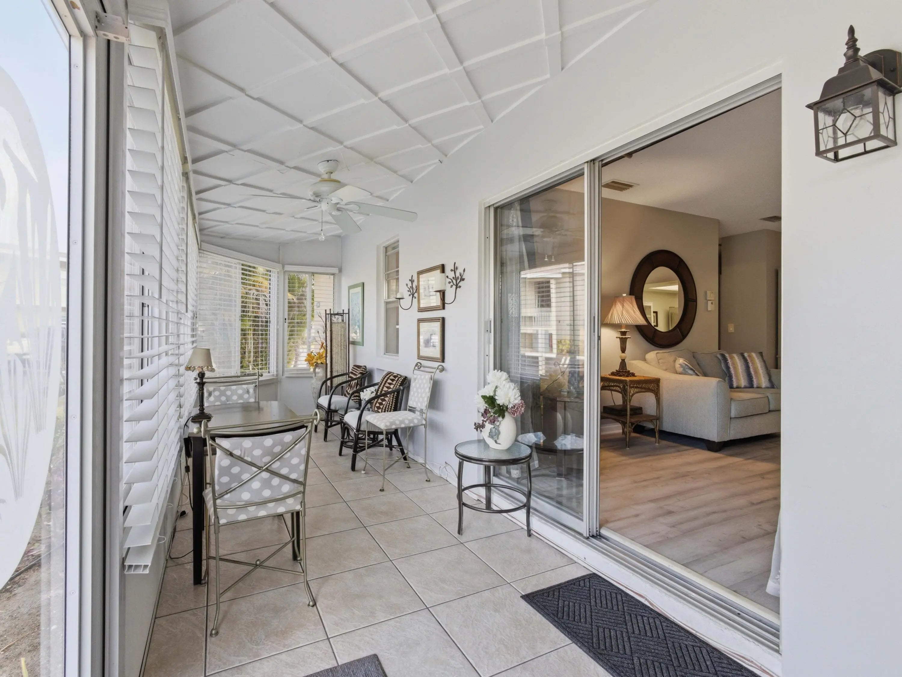 Welcome to Four Sea Suns in beautiful Boynton Beach — a hidden coastal gem just minutes from the Atlantic Ocean, pristine beaches, and waterfront dining. This stunning 2-bedroom, 2-bath villa offers the perfect blend of comfort, thoughtful updates, and easy Florida living. The interior features stylish luxury vinyl flooring throughout with no carpet, creating a clean, modern feel that is both attractive and low maintenance. A new electrical panel adds additional peace of mind. The kitchen is equipped with newer appliances including a stove, microwave, dishwasher, and disposal, along with updated faucets and quarter-turn shutoffs for added convenience. Both bathrooms have been refreshed, including the addition of a sleek glass shower door. A washer and dryer are included, and the spacious laundry room features a great workshop area, providing valuable storage and utility space perfect for hobbies, tools, or extra organization. The villa also comes with an assigned parking space for added ease. Being sold fully furnished, this villa is truly turnkey just bring your clothes and move right in! Four Sea Suns Condominium enhances your lifestyle with a newly renovated sparkling pool, fitness center, and a well-stocked library. The maintenance fee covers water, sewer, and exterior insurance, ensuring truly hassle-free living. Located close to beaches, shopping, and restaurants, this villa is more than just a home it's an inviting coastal lifestyle opportunity in the heart of Boynton Beach.