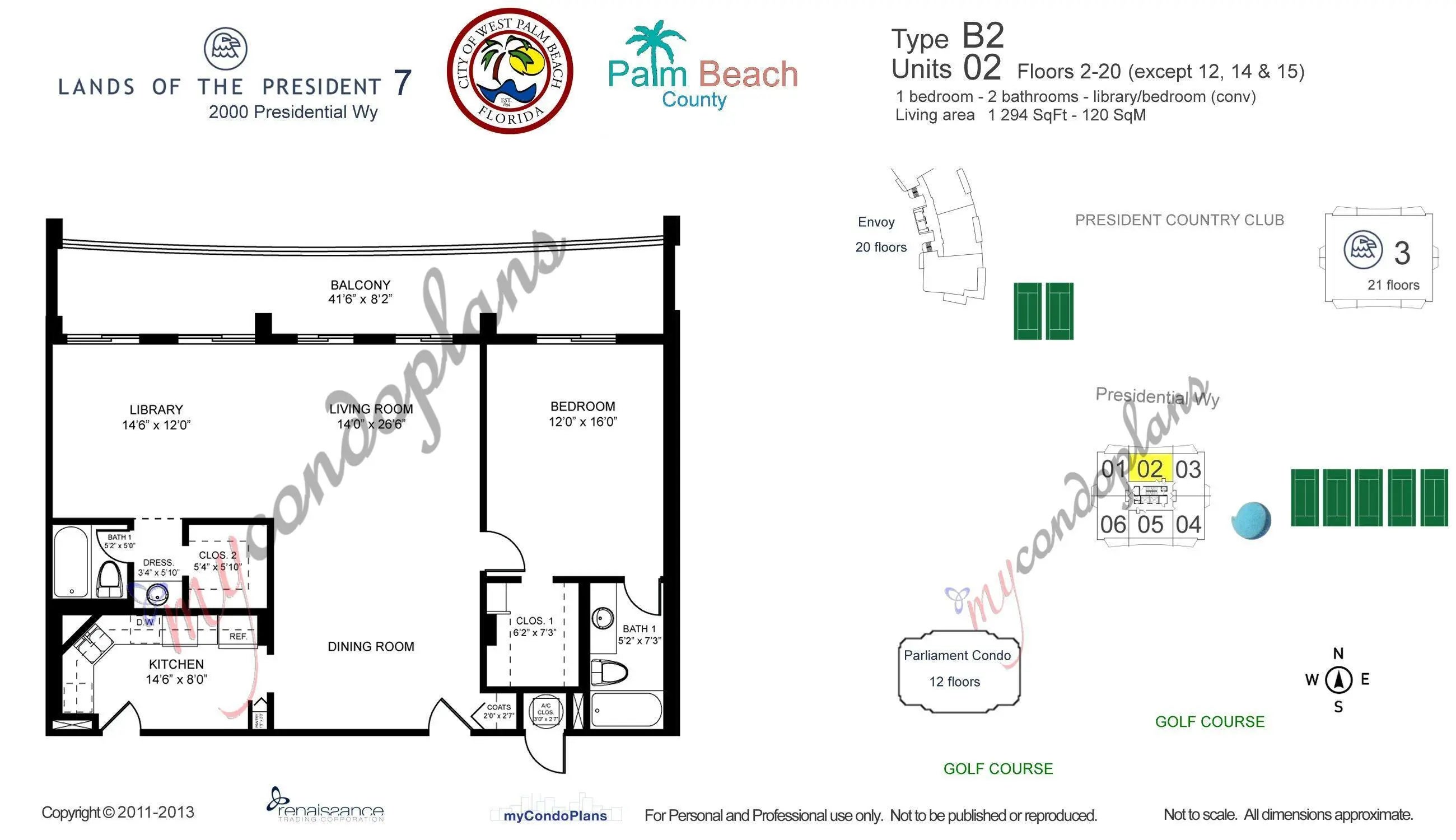 It's hard to beat the sweeping penthouse views from the ocean to the western communities from PH-2 at Jefferson Tower. The residence has been renovated throughout, with tile floor, recently updated bathrooms and modern kitchen. This exceptional residence features two full bedrooms, each with its own en-suite bath, and all rooms open to a stunning 42-foot private balcony with desirable northern exposure—perfect for enjoying expansive views and refreshing breezes. The unit also includes two assigned parking spaces, one of which is covered. All assessments have been paid and all construction has been completed, providing true peace of mind. This is penthouse living at its finest, combining breathtaking views and thoughtful updates inside the gated community of Lands of the President.