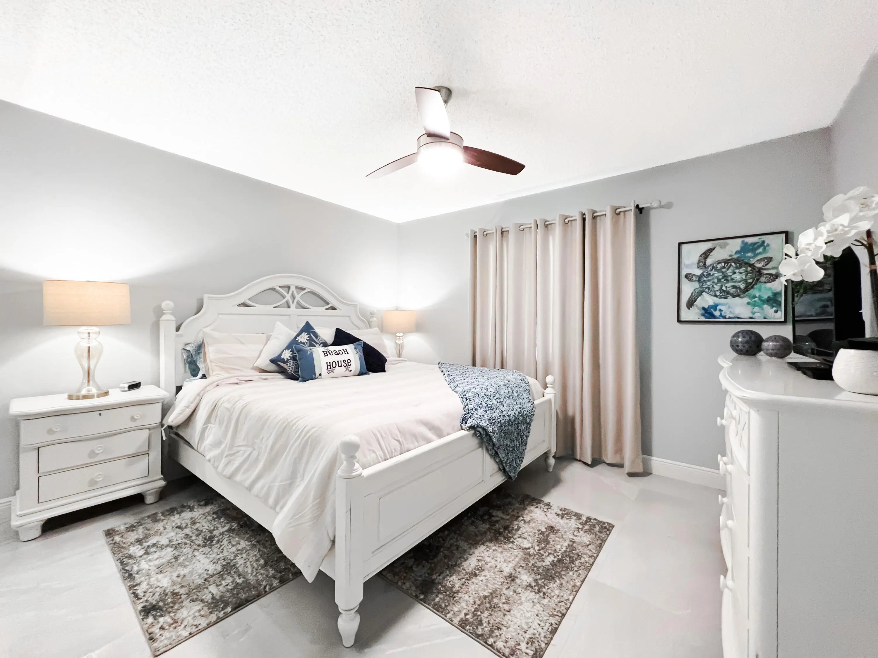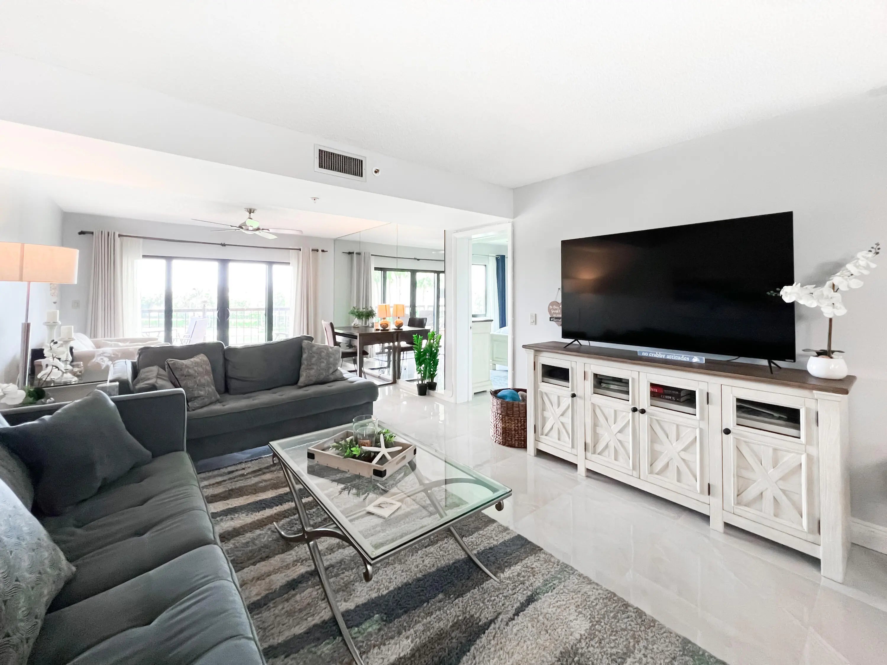 Turn key beach residence is available April 1st - June 30th. Fantastic location! Beautifully renovated residence - new tile floors, stainless steel appliances, new furniture and tvs, updated bathrooms, king size bed with new high end mattress in master, queen memory foam pull out couch in living room, king size bed in guest bedroom. Play tennis, pickle ball, or take a dip in the community pool, go for a walk or bike ride along the beach. Numerous restaurants, shopping, entertainment are within minutes. Call to book your Jupiter getaway today!