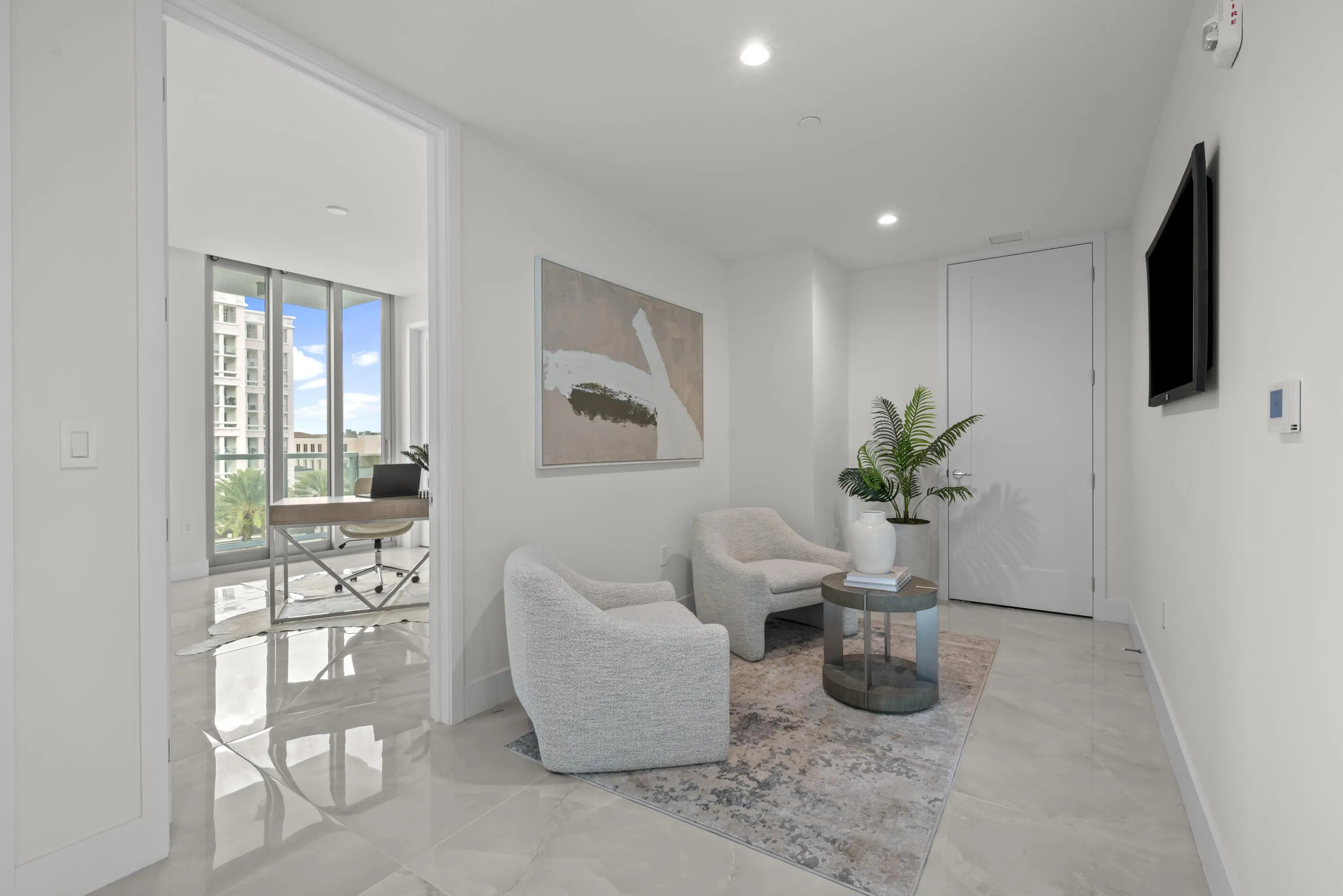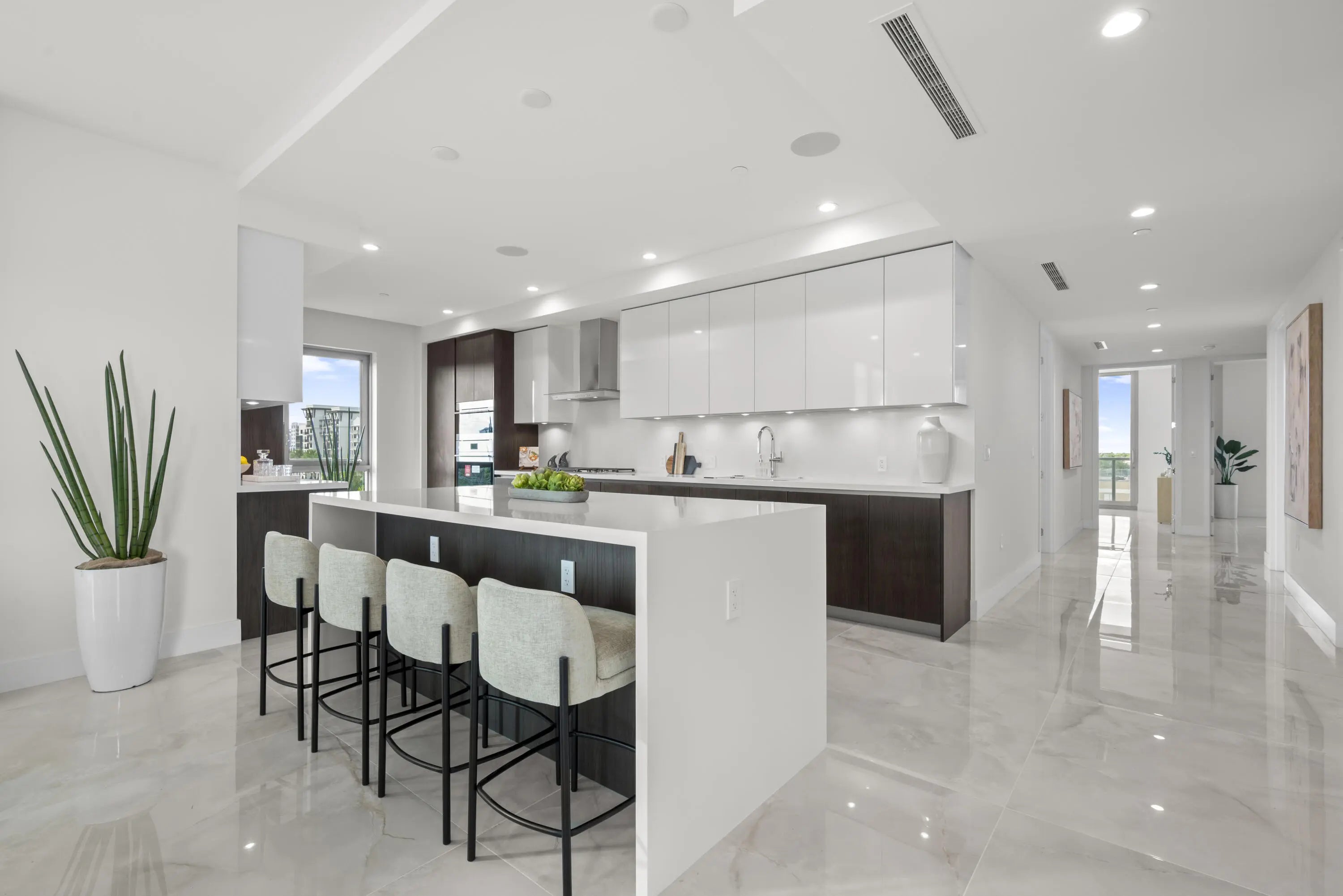 Welcome to your home in the sky! Royal Palm Residences represents the ultimate in luxurious living the heart of East Boca Raton. Unparalleled elegance and modern comforts can be found in this expansive customized corner residence featuring an open floor plan with 4 ensuite bedrooms, half bath and laundry room. The elevator opens directly into this sophisticated 5th-floor corner unit, offering southern, western, and northern views allowing you to savor the panoramic vistas from every angle. The chef's kitchen features sleek Italian cabinetry, Wolf and Subzero appliances, including a gas cooktop and wine refrigeration. The large island with seating is perfect for casual dining or entertaining guests. The kitchen is beautifully finished with elegant quartz countertops and a matching back splash. The spacious living room is a showstopper with two sets of glass doors that lead out to an enormous wrap around balcony. Here, you can grill on the outdoor Wolf gas summer kitchen or enjoy breathtaking views of the Boca Raton Resort and golf course. Indulge in the epitome of high-rise living in this spectacular home upgraded with Crestron system, TOTO toilets, porcelain flooring in every room and incredible building amenities and 2 parking spots. Close to exceptional restaurants, shops, markets and the beach this is the epitome of luxury in condominium living in East Boca Raton.
