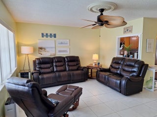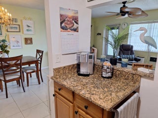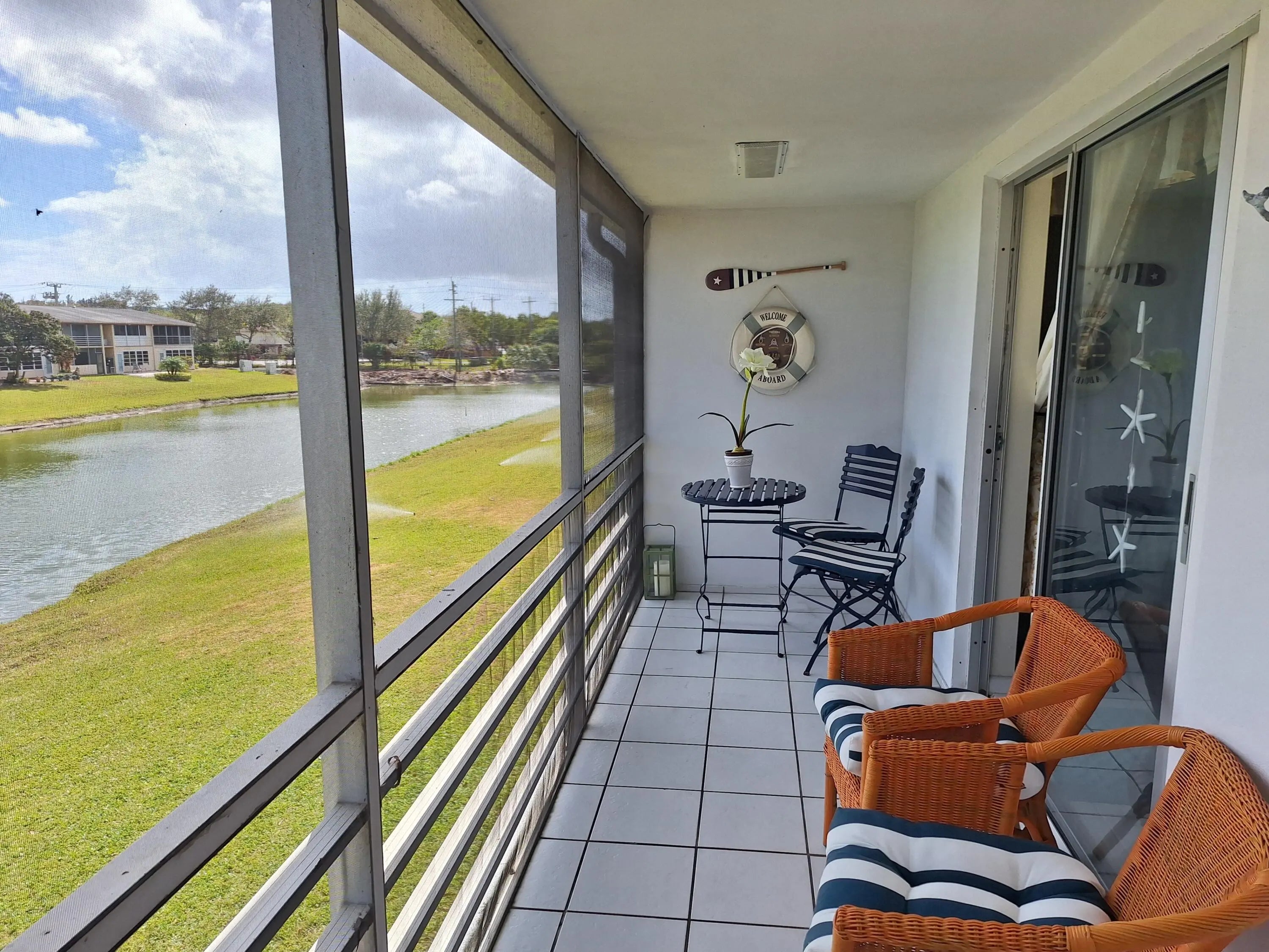 A rare opportunity to own a turnkey, pet-friendly unit that has a water view facing the eastern sunrise. Fully furnished, with everything you want or need. From the moment you enter, you will notice the comfort and pride of ownership, which has been geltly used as a winter get away. Beautiful ceramic tile floors throughout the entire living space, a kitchen that has been upgraded with top-of-the-line Samsung appliances and granite countertops, and everything that one would need, pots, pans, dishes, glasses, a Keurig coffee maker, a toaster oven, a microwave, etc. A spacious bedroom with a king-size bed flows to the screened-in patio that faces east, which has water views, to relax with a coffee or tea. This unit is a pleasure to visit and will make one lucky family very happy. The community offers everything that one would need. gated entry, several pools, and one indoor heated pool, movie theater, live performance theater, clubhouse, exercise room, pickle ball courts, free bus service, the list is endless. Come visit this special condo and you will be sold.