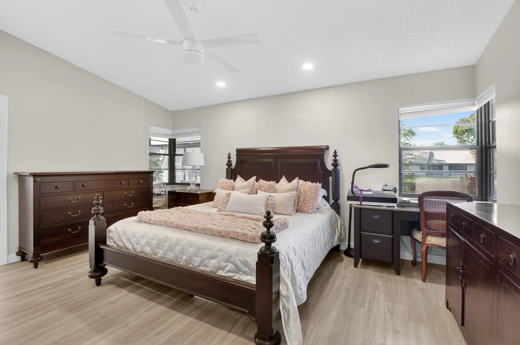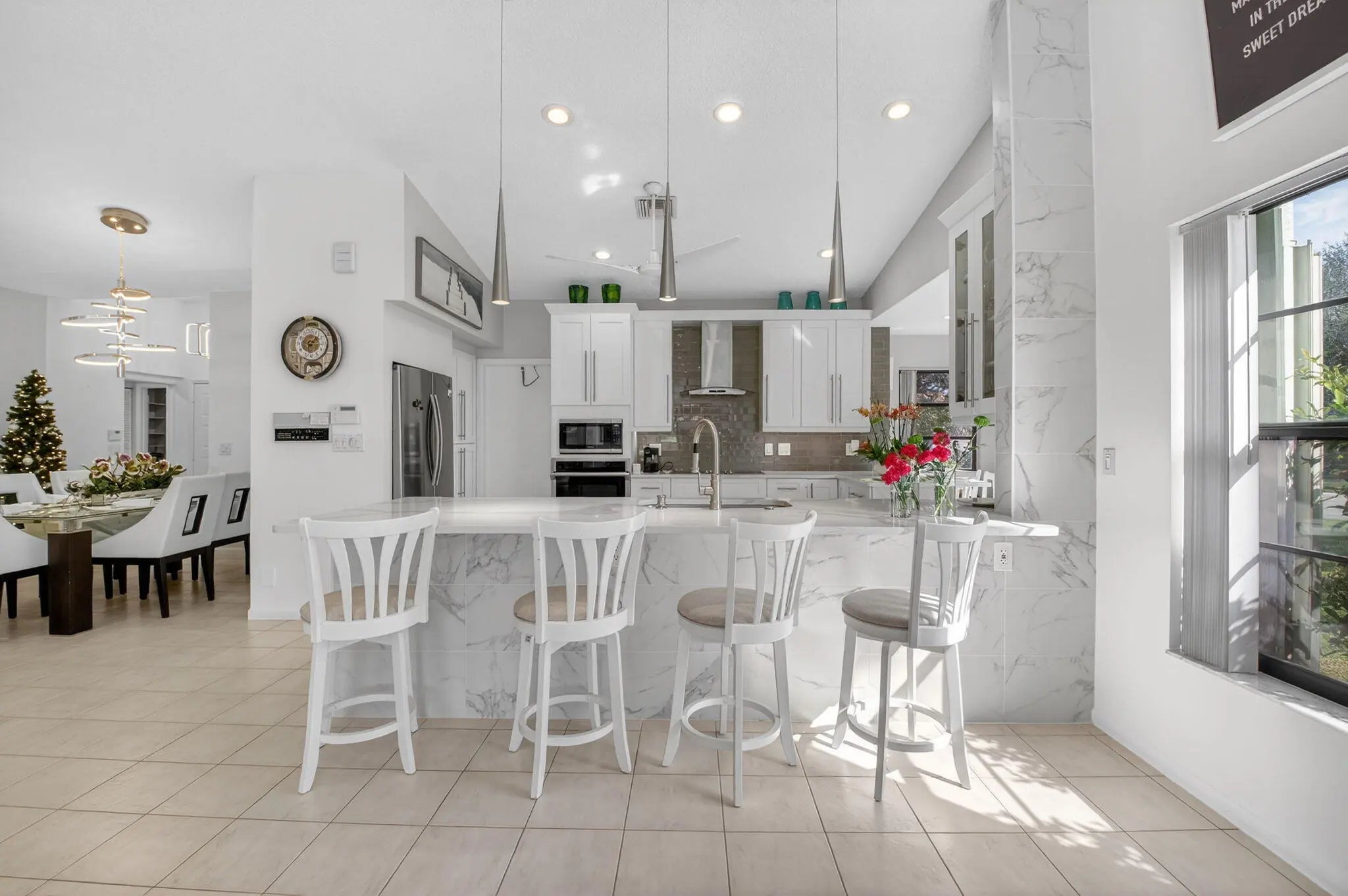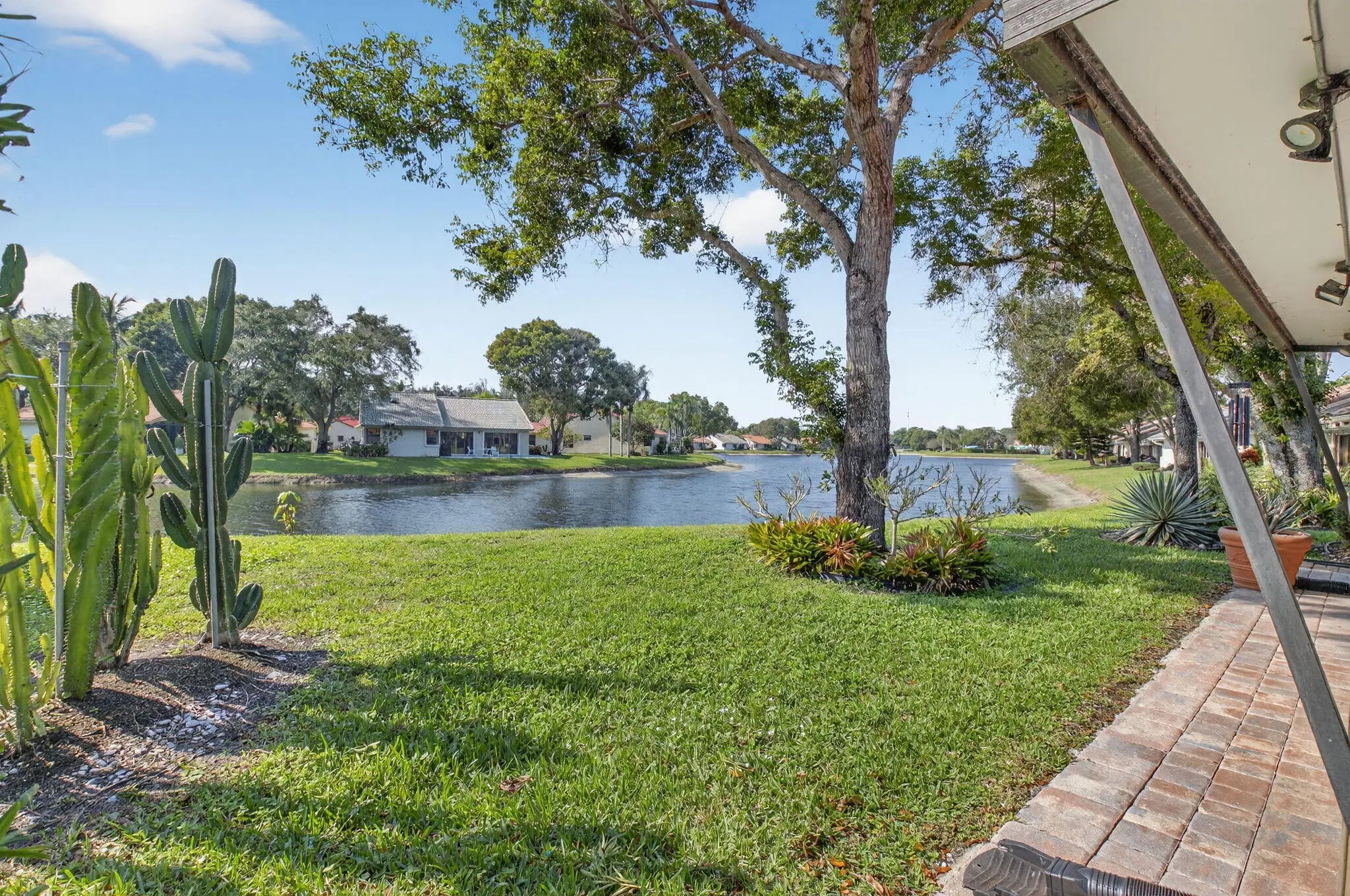 Fabulous, total high-end rehab, largest model in active 55+ community. 3BR/2BA w/open layout & full lake view. Cul-de-sac location. Enclosed AC Florida room w/glass sliders lead to great patio. Huge gourmet chefs kitch w/top SS appliances & range hood. Tons of cabinets, deep drawers, & extra wide counters & storage. Upgraded bathrm finishes. Redesigned closets & built-ins for maximum use. Spacious primary suite w/luxury vinyl floor includes renovated bath w/double vanity, jacuzzi, separate shower, & custom cabinets. Guest BR/office w/ custom Murphy bed sys, desk, cabinets, & bookcases. Impressive double door entry leads to dramatic XL LR. 2c garage w/A/C. New lighting & kitchen pipes. New roof 2016, A/C 2020, 50-gallon hot water heater 2017, house painted 2025. Great home for entertaining!
