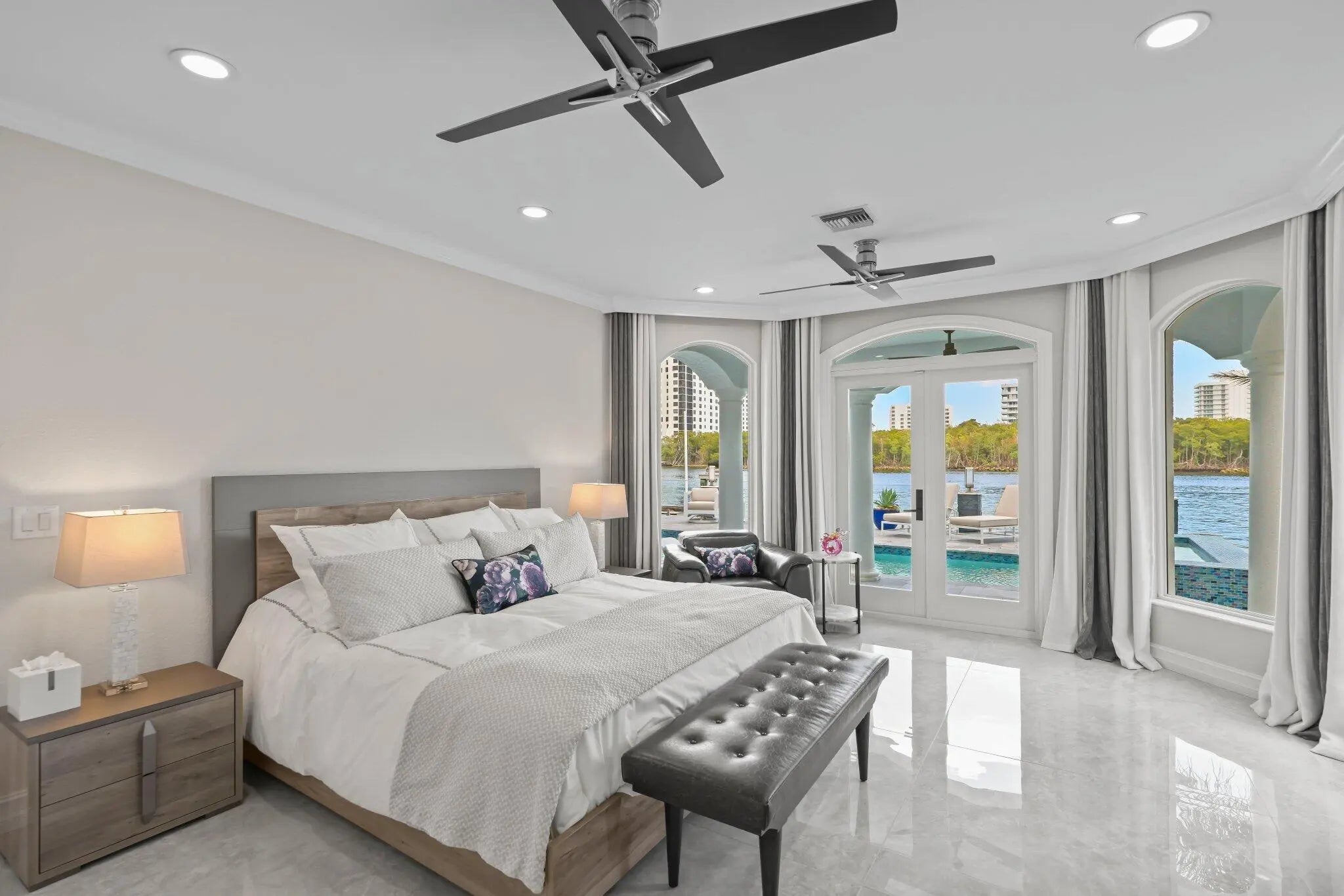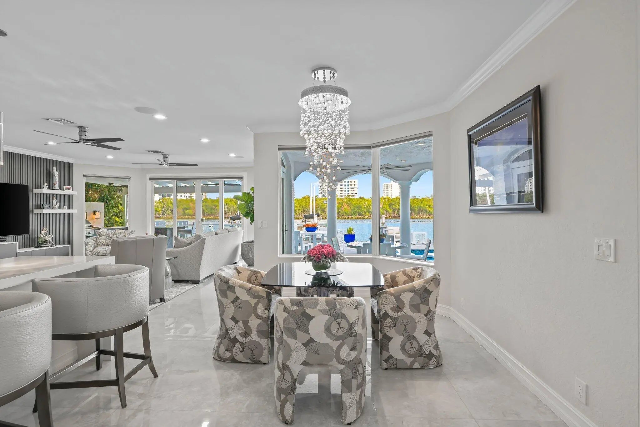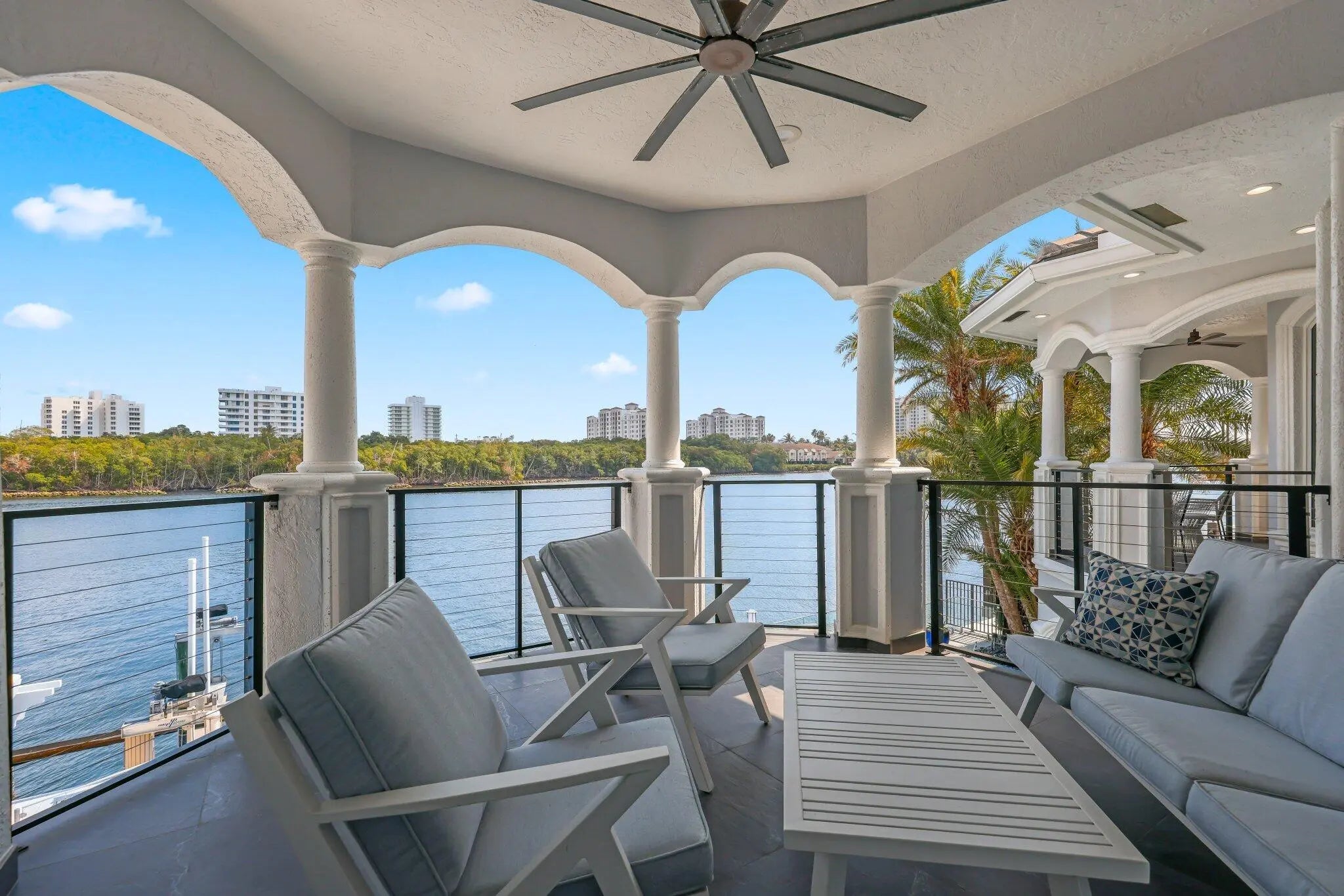 Direct Intracoastal and perfectly positioned on Harbour Island in Boca Harbour, this beautiful estate defines refined waterfront living. With 80 feet of direct Intracoastal frontage and sweeping preserve views, the setting feels expansive, tranquil, and exceptionally private. Offering 5 bedrooms, 5 full and 1 half baths, plus a dedicated office and gym, the open floor plan is thoughtfully designed to capture water views from nearly every room. The outdoor living rivals a private resort, featuring waterfront balconies and terraces, a heated saltwater pool and spa, a private dock, and a summer kitchen with cabana - all seamlessly oriented toward the water. Inside, meticulous craftsmanship and elevated finishes set the tone. The chef's kitchen is equipped with Wolf appliances, Sub-Zero refrigeration, and a butler's pantry designed for effortless entertaining. Steam showers, custom built-ins, integrated security cameras, Sonos audio throughout, and a full-house generator provide both luxury and peace of mind. The owner's suite serves as a true retreat, complete with multiple sitting areas, a private balcony, an expansive walk-in closet, and a spa-inspired bath featuring a vessel tub and oversized walk-in shower. Located in the heart of East Boca, Boca Harbour is known for its direct ocean access, no fixed bridges, and effortless coastal lifestyle within one of the area's most coveted waterfront communities.