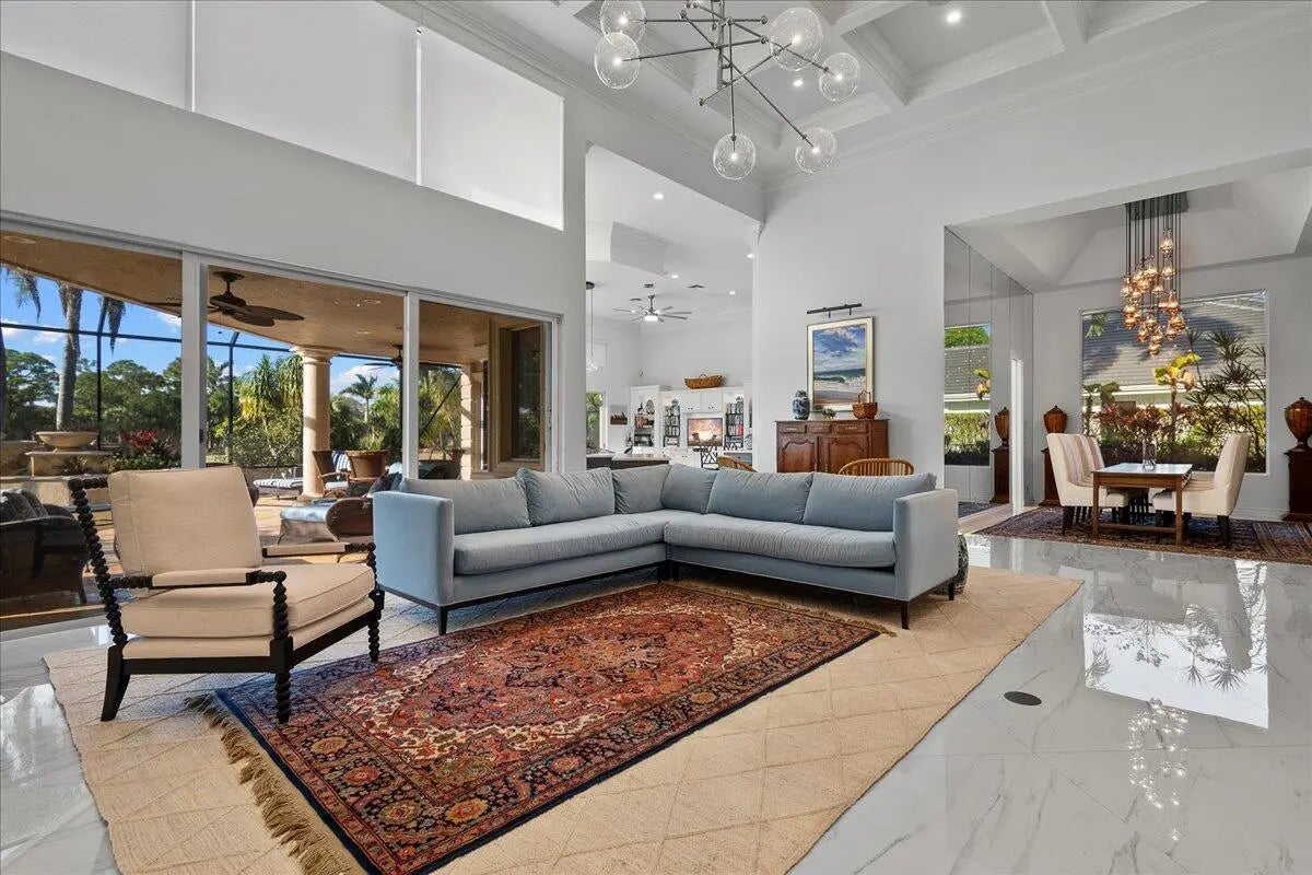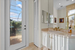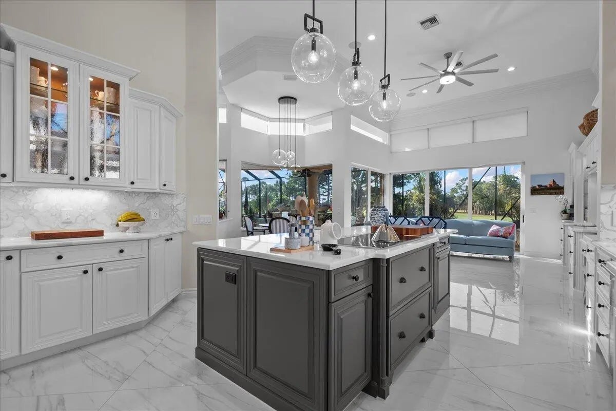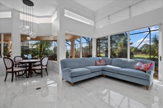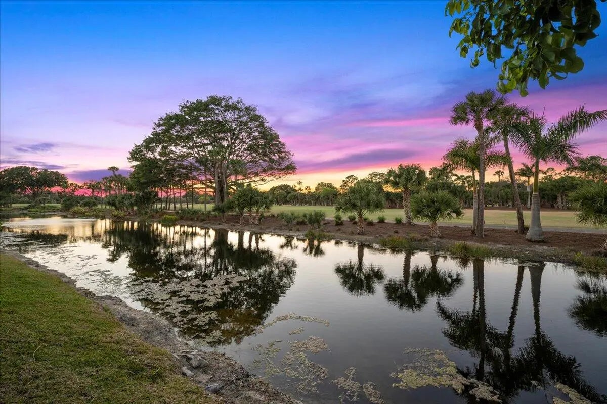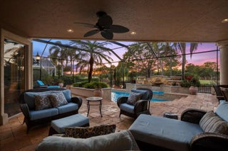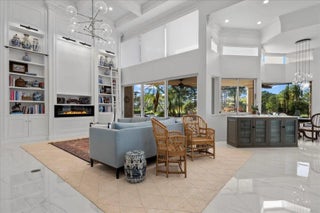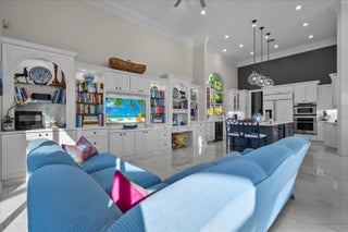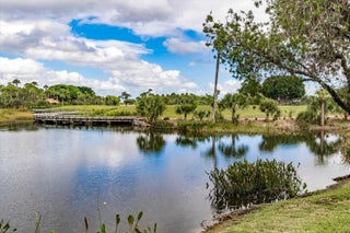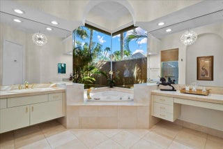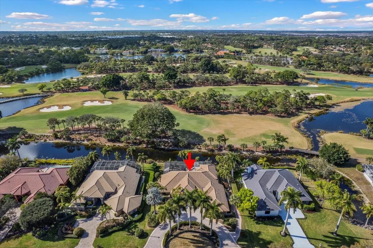 Enjoy one-of-a-kind, expansive views of water and the 13th and 14th fairways along the Rees Jones-designed Breakers West golf course. This beautifully customized residence offers 3 bedrooms with ensuite baths, a refined office/library, and a 2-car garage plus golf cart space. The home showcases oversized porcelain flooring throughout the main living areas and rich wood flooring in the bedrooms and office. Thoughtful millwork details include coffered box ceilings and floor-to-ceiling built-in bookcases with a fireplace anchoring the living room. Restoration Hardware chandeliers and wall sconces add a sophisticated touch throughout. The chef's kitchen is a true highlight, featuring white quartz countertops, a gray-and-white backsplash, and a large center island with seating... Enjoy one-of-a-kind, expansive views of water and the 13th and 14th fairways along the Rees Jones-designed Breakers West golf course. This beautifully customized residence offers 3 bedrooms with ensuite baths, a refined office/library, and a 2-car garage plus golf cart space. The home showcases oversized porcelain flooring throughout the main living areas and rich wood flooring in the bedrooms and office. Thoughtful millwork details include coffered box ceilings and floor-to-ceiling built-in bookcases with a fireplace anchoring the living room. Restoration Hardware chandeliers and wall sconces add a sophisticated touch throughout. The chef's kitchen is a true highlight, featuring white quartz countertops, a gray-and-white backsplash, and a large center island with seating. Outfitted with a Wolf cooktop with downdraft, wine refrigerator, and premium finishes, the kitchen opens seamlessly to the family room, breakfast area, and a newly added wet bar with sink and under-counter refrigerator--ideal for entertaining. The private office/library offers custom built-ins, drawers, a desk area, and a large arched window with plantation shutters. The primary suite serves as a tranquil retreat with wood flooring, high ceilings, crown molding, and expansive sliding doors overlooking the pool and patio. Dual marble primary baths provide individual vanities, showers, and private toilet areas, with a jacuzzi tub in the hers bath. Two guest bedroom suites are located on the opposite side of the home, each featuring wood flooring and custom walk-in closets for comfort and privacy. A dedicated laundry room leads to the garage, complete with built-in cabinetry and a workbench for additional storage. Outdoor living is exceptional, with a resort-style pool and spa accented by waterfall features and a marble stone patio deck, all overlooking two fairways and a serene lake. Sunset views create the perfect backdrop for relaxing evenings. Additional highlights include a whole-house generator, Sonos sound system, Nest cameras, app-controlled pool, spa, and lighting, WiFi boosters for strong indoor and outdoor connectivity, extensive landscape lighting, and a whole-house water softener system. Roof replaced in 2010. Breakers West offers optional club memberships at either Breakers West Country Club or Mayacoo Lakes Country Club, with no mandatory membership requirement. Ideally located near downtown West Palm Beach, Palm Beach, PBI Airport, The King's Academy, and Wellington equestrian amenities. A one-time capital contribution of $2,850 to the Breakers West Association is due from the buyer at closing.