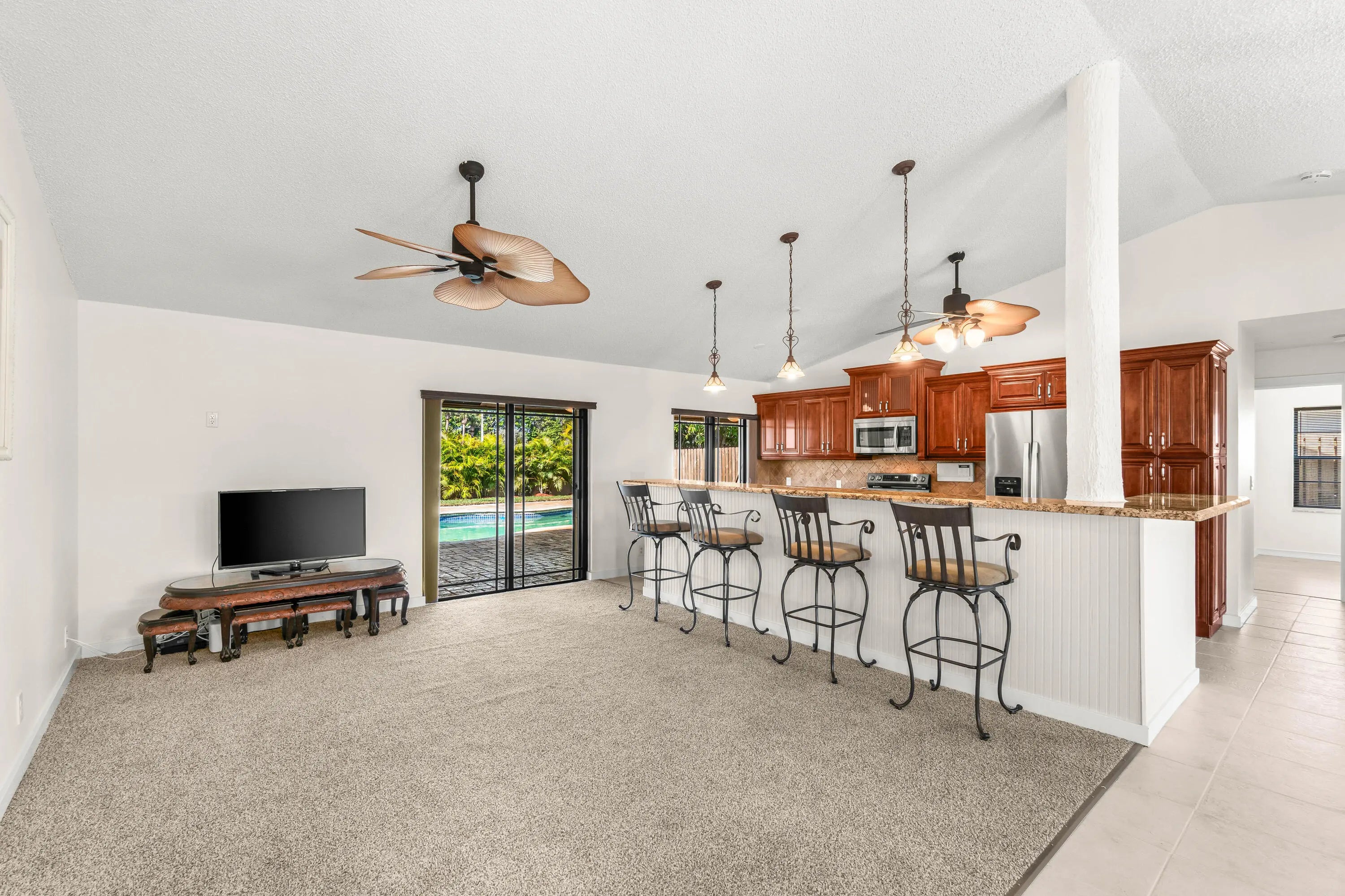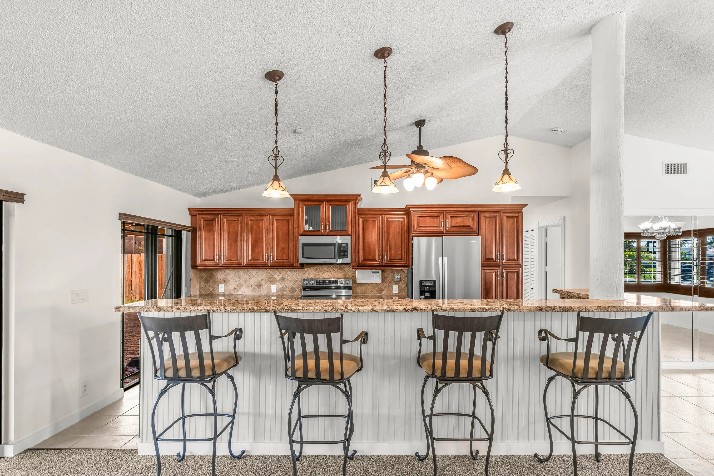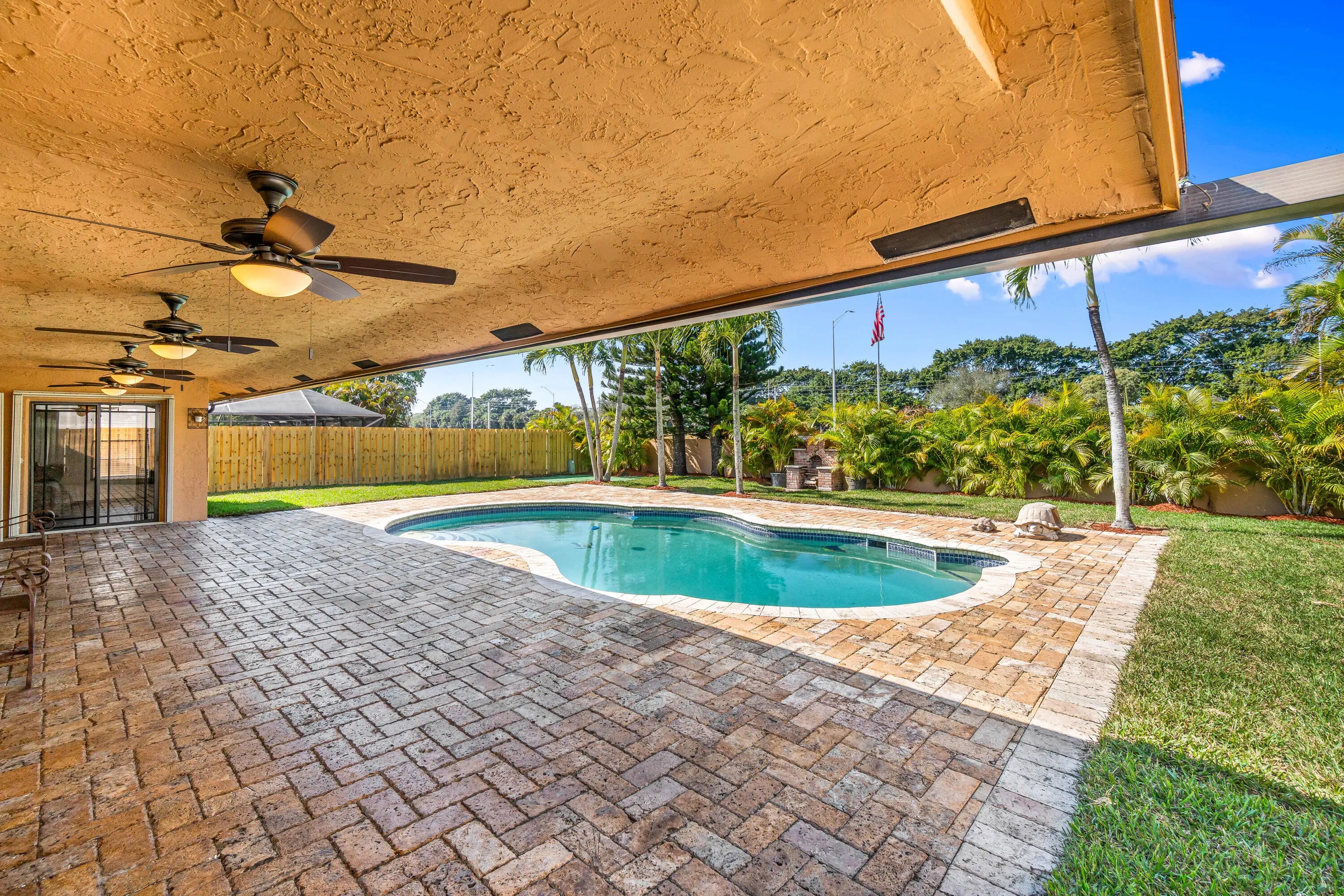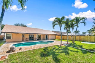 Absolutely stunning 3BR/2BA pool home on an oversized 10,000+ SF fully fenced lot in the highly desirable Estate Section of Boca Fontana! Situated by a quiet cul-de-sac with minimal traffic and A-rated schools, this move-in ready home offers the perfect blend of privacy, space, and style. The backyard is a true showpiece featuring a breathtaking updated freeform pool surrounded by gorgeous travertine marble decking and expansive patio space ideal for entertaining. Inside, enjoy volume ceilings, an open-concept split floor plan, and a beautifully upgraded granite kitchen with stainless steel appliances and center island. The oversized primary suite features a walk-in closet and renovated bath. New Roof 2025. accordion shutters, hurricane-rated garage door. HOA $205 cable tv, 2 heated pools.