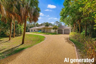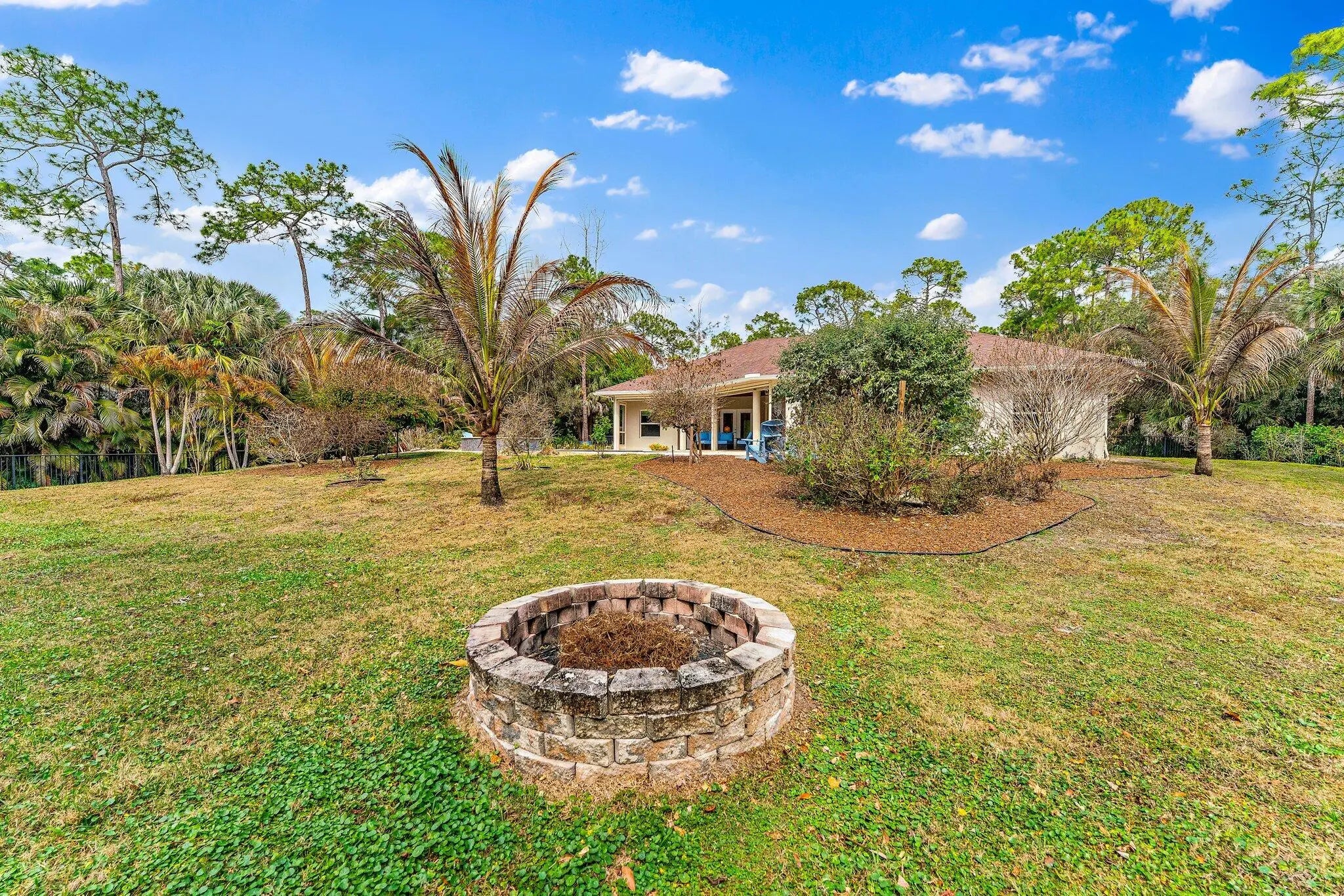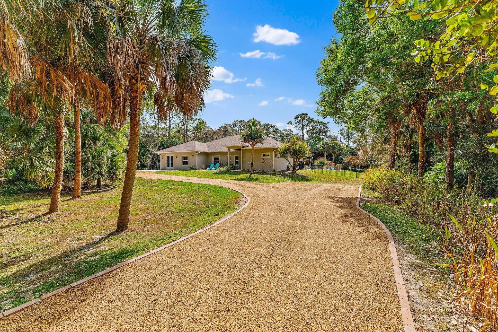 Private acreage living just minutes from Jupiter. Built in 2017 and extensively upgraded through 2025, this beautifully maintained 5-bedroom, 3-bath residence offers modern construction rarely found in Jupiter Farms. Resort-style outdoor living and rare flexibility for multigenerational living or a private guest suite. Located east of Jupiter Farms Road and biking distance to Riverbend State Park, the property combines the privacy and space of acreage living with convenient access to Jupiter's beaches, restaurants, and shopping. A standout feature is the newly created private guest or in-law suite completed in 2025, offering a separate bedroom, living room, and dining area. Ideal for extended family, guests, multigenerational living, or a private office, the space significantly expan the home's flexibility. The property also offers ample space to add a detached garage, workshop, or additional outbuilding if desired, allowing future owners to customize the property while maintaining the open acreage setting. The chef's kitchen is anchored by a stunning 9-foot island and features a Wolf gas range connected to a 400-gallon propane tank, a new refrigerator (2024), and Bosch microwave and dishwasher (2025). The open floor plan flows seamlessly between the dining area, living room, kitchen dinette, and second TV room with custom shiplap accent wall. Outdoor living is truly resort-style. The saltwater pool with waterfall and integrated hot tub was completed in 2018 and enhanced with a heater in 2020. In 2025 the pool received a new variable-speed pump, filter motor, and upgraded LED color-changing lights. The travertine patio, custom brick firepit, and professionally designed privacy landscaping create a beautiful space for relaxing or entertaining. Constructed with insulated concrete block for exceptional durability, the home also features full hurricane-rated windows and doors for impact protection and energy efficiency. Additional highlights include: " 400-square-foot hurricane-rated foam-insulated shed or studio " Circular driveway and upgraded gravel drive with brick edging " Metal-fenced backyard with locking gates " Covered porch with retractable screens " Tesla EV charger and 220 outlet for RV hookup " Ring doorbell and keypad entry " Move-In ready " Covered front porch " High and dry acreage property " Fire pit " Complete exterior power washing in 2026 including roof, patios, shed, gutters, and fencing " Ample space for RVs, boats, Hobbies or additional buildings This is not your typical Jupiter Farms home. With newer construction, extensive system upgrades, flexible living spaces, and resort-style outdoor amenities, this property offers a rare opportunity to enjoy private acreage living near Jupiter's serene beaches with turquoise waters. Seller is offering a $50,000 credit toward the construction of a 25 x 25 oversized two car garage. The proposed design features concrete block construction with a stucco finish and an asphalt roof to match the existing home. Plans include one hurricane impact window, a glass side entry door, and a concrete walkway connecting to the front porch. Fill dirt is also included to elevate the structure to match the current grade of the home. The garage has been staked on the right side of the property, aligned with the front of the house. The footprint may be adjusted up to approximately 7 feet to the right, as well as positioned further forward or back, offering flexibility based on buyer preference. A sample architectural rendering and contractor estimate are available. Total estimated cost is $66,500. Seller credit applies at closing. Garage shown in photos is a rendering for illustrative purposes only.
