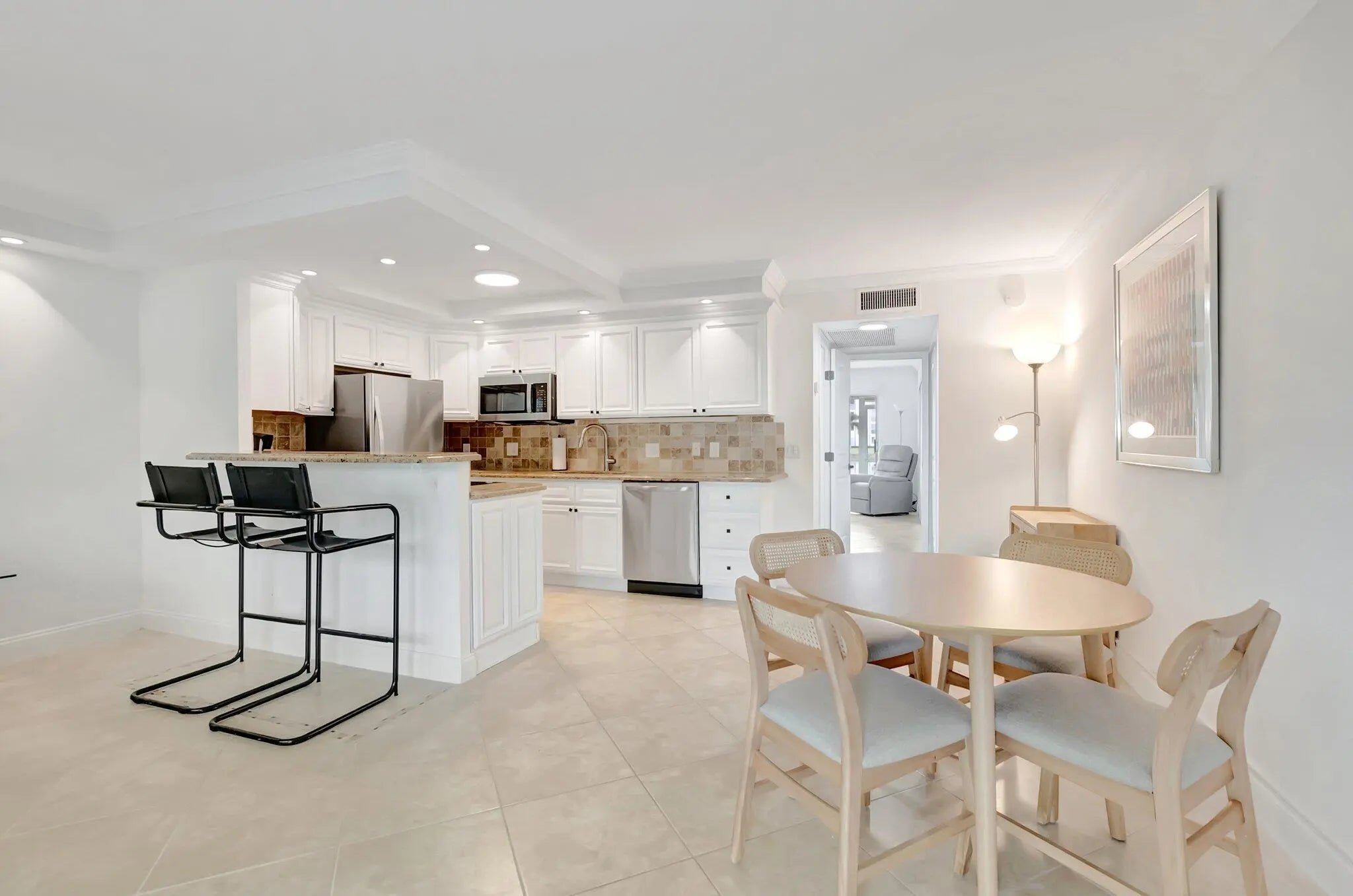 STUNNING RENOVATED! FIRST FLOOR WATERVIEW! Sparkling! Newly installed hurricane proof windows and doors just installed. Beautifully RENOVATED kitchen with the wall down, creating a GREAT room. Recently purchased furniture! MODERN WHITE kitchen walls and cabinets with black handles. Newly installed stainless-steel appliances! This 1 bedroom 1.5 bath has a very spacious feeling. Full bathroom renovated with new vanity and modern toilet and half bathroom has renovated tiles, vanity and toilet. Recessed lighting in kitchen, living room and bedroom., enhance the modern look of the condo. Desirable Yarmouth D, building, close to sidewalk path, parking and close to clubhouse and houses of worship! Yarmouth's pool is surrounded by the palm trees and the lake. Century Village Boca is located in upscale Boca. The village has biking paths, internal buses and connections with external busing. There are free or discounted programs, galore! Come enjoy the fun of this 55 plus community!