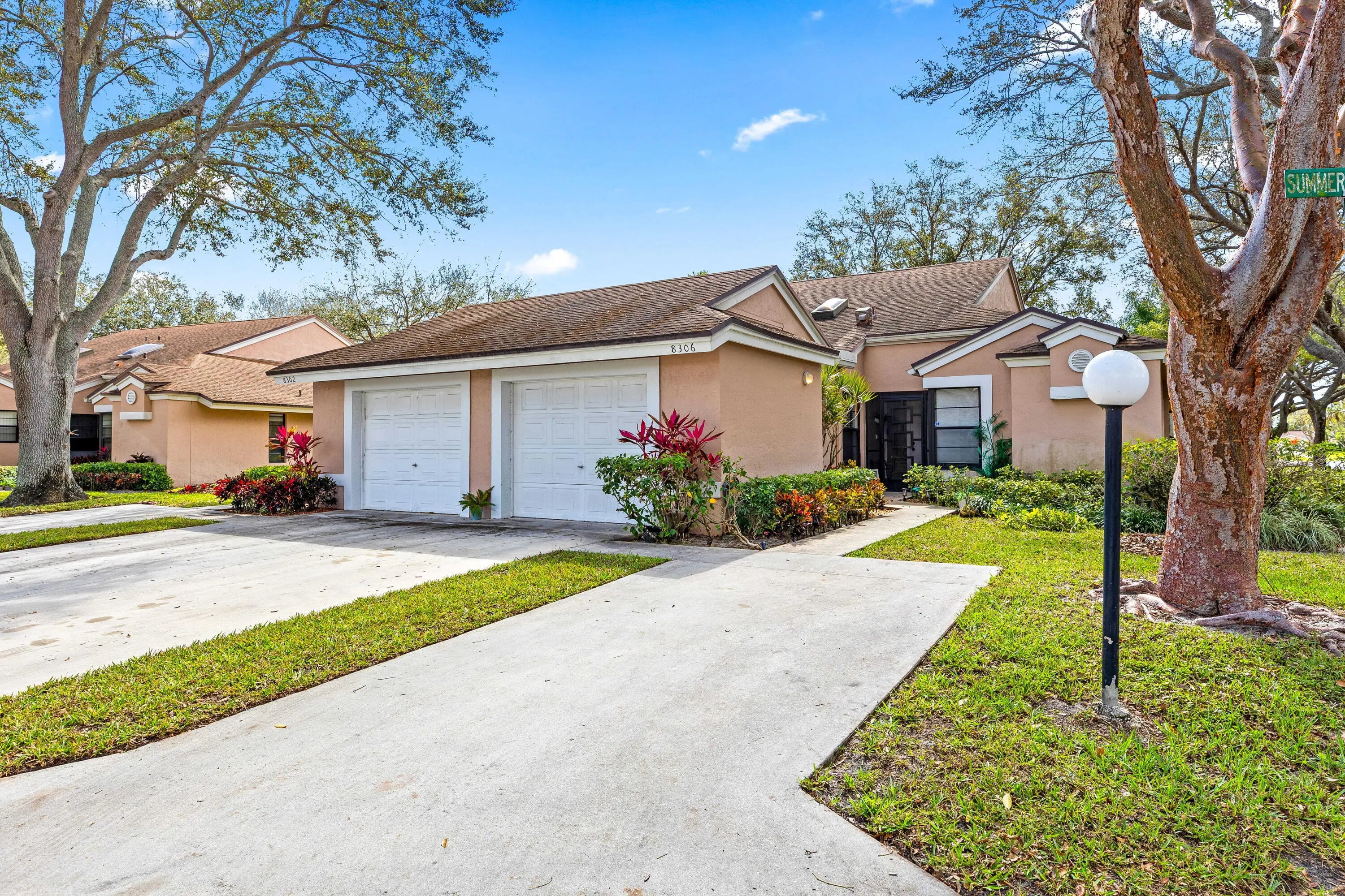 Welcome home to this rarely available Regal model in the desirable Parkshore section of Whisper Walk. This spacious 3-bedroom, 2-bath villa offers a bright, open layout designed for comfort and easy living. Vaulted ceilings, Recessed lights, two skylights, and expansive living areas fill the home with natural light, creating a warm and inviting atmosphere from the moment you enter. The thoughtfully designed split-bedroom floor plan provides privacy for guests, while the primary suite features generous proportions and ample closet space. An eat-in kitchen with a large pantry, full-size washer and dryer, and abundant storage make everyday living effortless. Tile and LVP flooring spread throughout the house for easy upkeep and keeping the house clean. Step into the enclosed Florida room, perfect for your morning coffee, relaxing afternoons, or entertaining while overlooking serene garden views. A one-car garage and private driveway add convenience rarely found in condo living. Located within Whisper Walk, a beautifully maintained, gated 55+ community spanning over 300 acres and 11 lakes, residents enjoy a true resort-style lifestyle surrounded by tranquil lakes and lush landscaping. Amenities include 8 tennis and 4 pickleball courts, a heated pool and spa, fitness center, sauna, and an active clubhouse with social rooms, library, billiards, card room, event space with a dance floor and year-round events curriculum. This is more than a home--it's a lifestyle. Come experience why Whisper Walk continues to be one of Boca Raton's most sought-after active adult communities