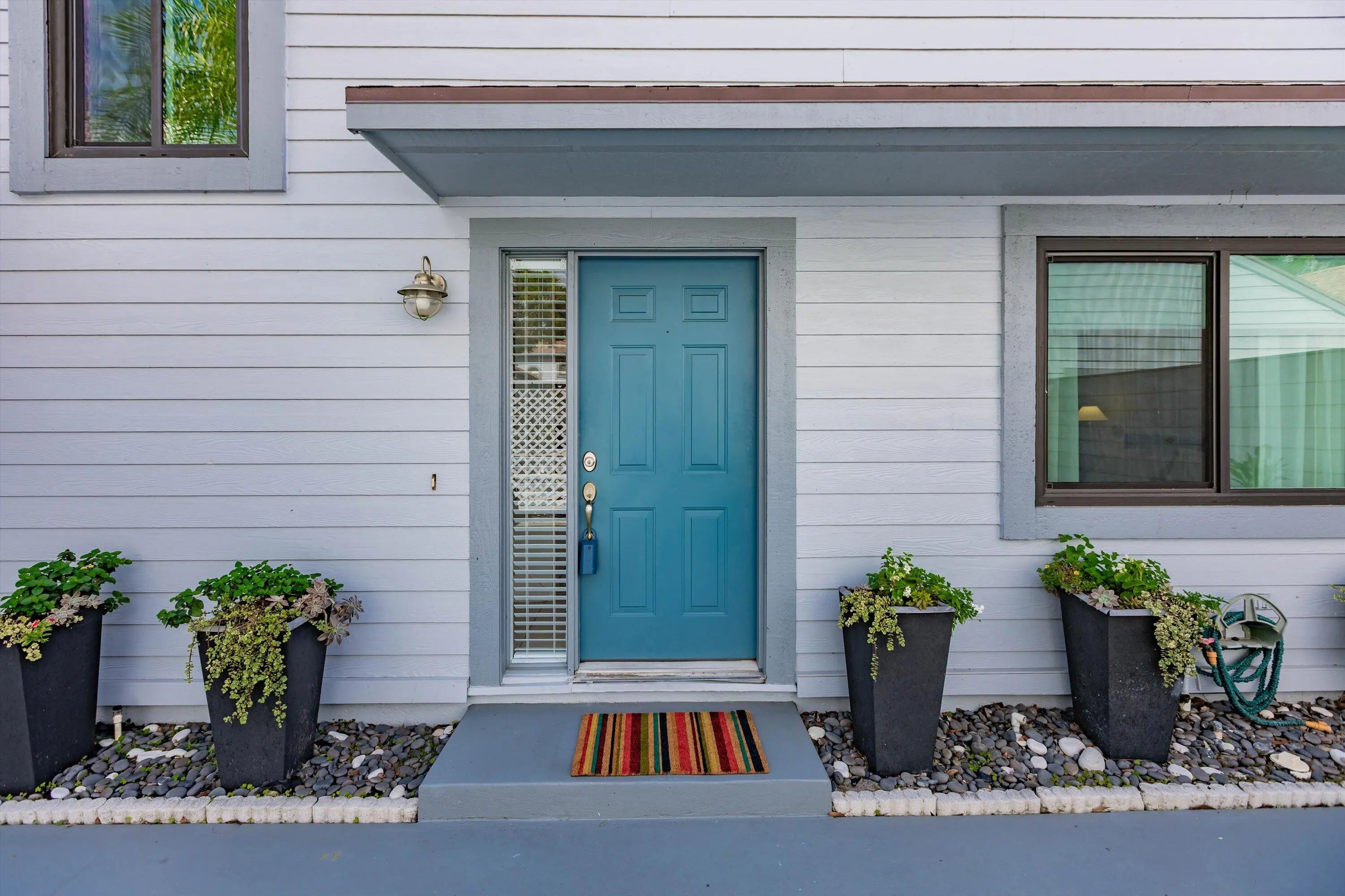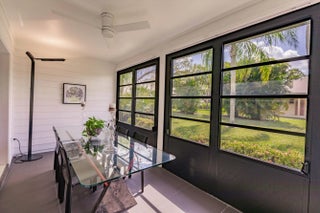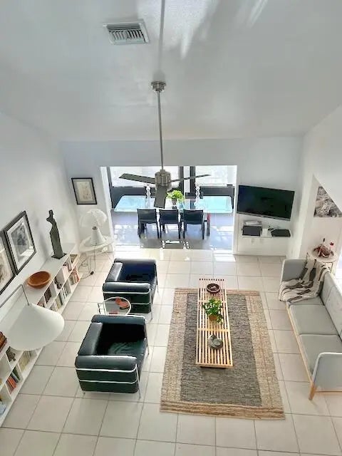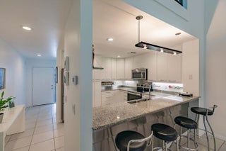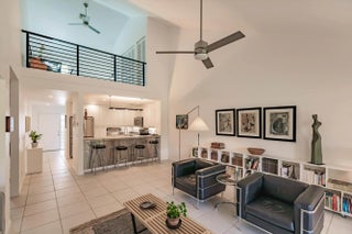 Fully renovated: modern kitchen with SS appliances and granite counters. Remodeled baths with designer tiles. New Water heater. Upgraded lighting and fans. Modern staircase and railings add to the designer look. Impact windows except the patio which is enclosed for more living space. 2Bed+Loft+Den (easily converted back to 3rd bed). Nearly turn-key with furnishings included as well as linens and kitchen items. Artwork and personal items excluded. Community pool just steps away. Also available is a clubhouse and another larger pool, tennis and pickleball. Close to Tom Fazio designed golf course and beaches. Come and see this exceptional design with open spaces and high ceilings that make this feel like a single family home with less maintenance.