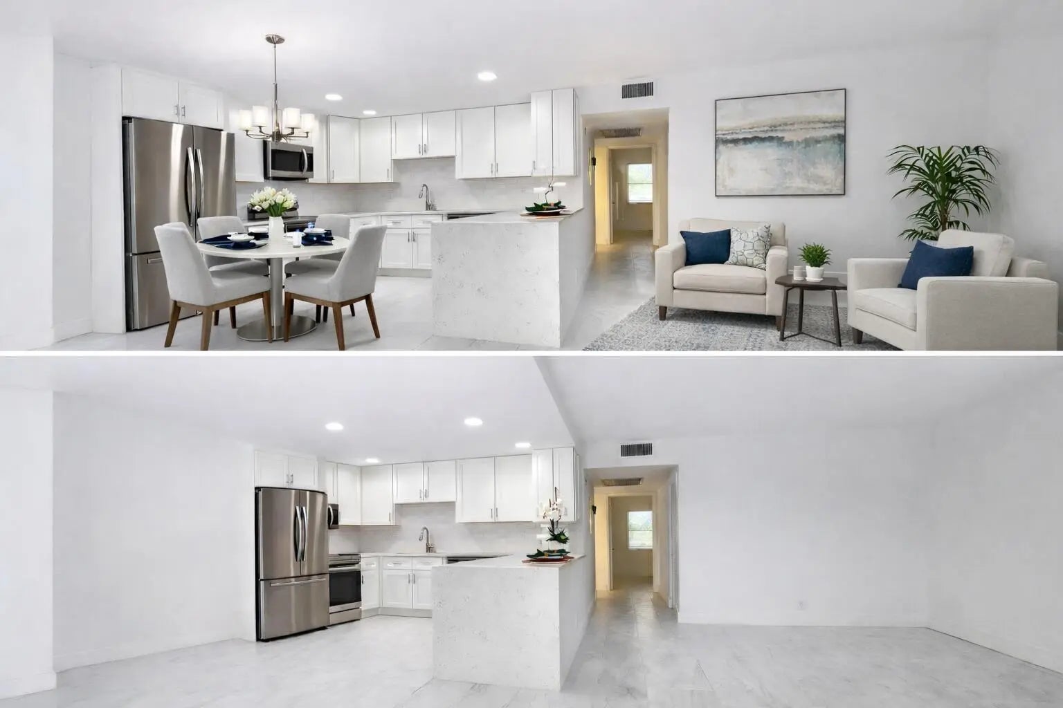 Magnificent renovated 2-bedroom, 2-bath apartment featuring an open-concept layout with quartz countertops, stainless steel appliances, and porcelain tile throughout the living areas. Both bathrooms have been beautifully updated. Enjoy a screened patio with an open view -- just bring your furniture and start enjoying the magnificent lifestyle at Century Village! Amenities include internet and WiFi, fitness center, live shows, movies, courtesy buses, classes, bingo, card rooms, trips, tennis courts, and more. Century Village offers true resort-style living, conveniently located near shopping and restaurants. Come see the unit -- then visit the clubhouse to experience everything this community has to offer! Per association: 55+ community.