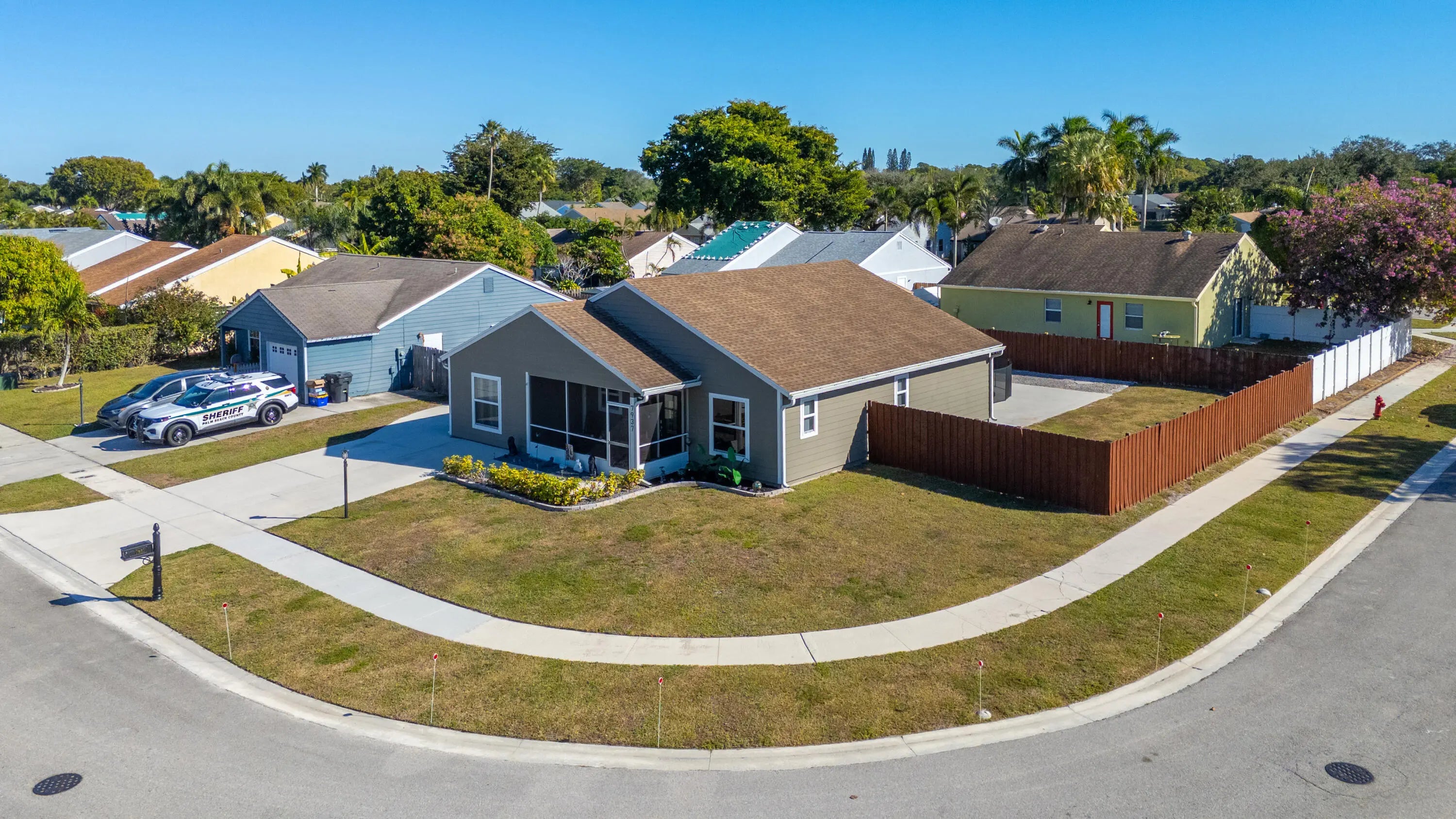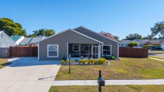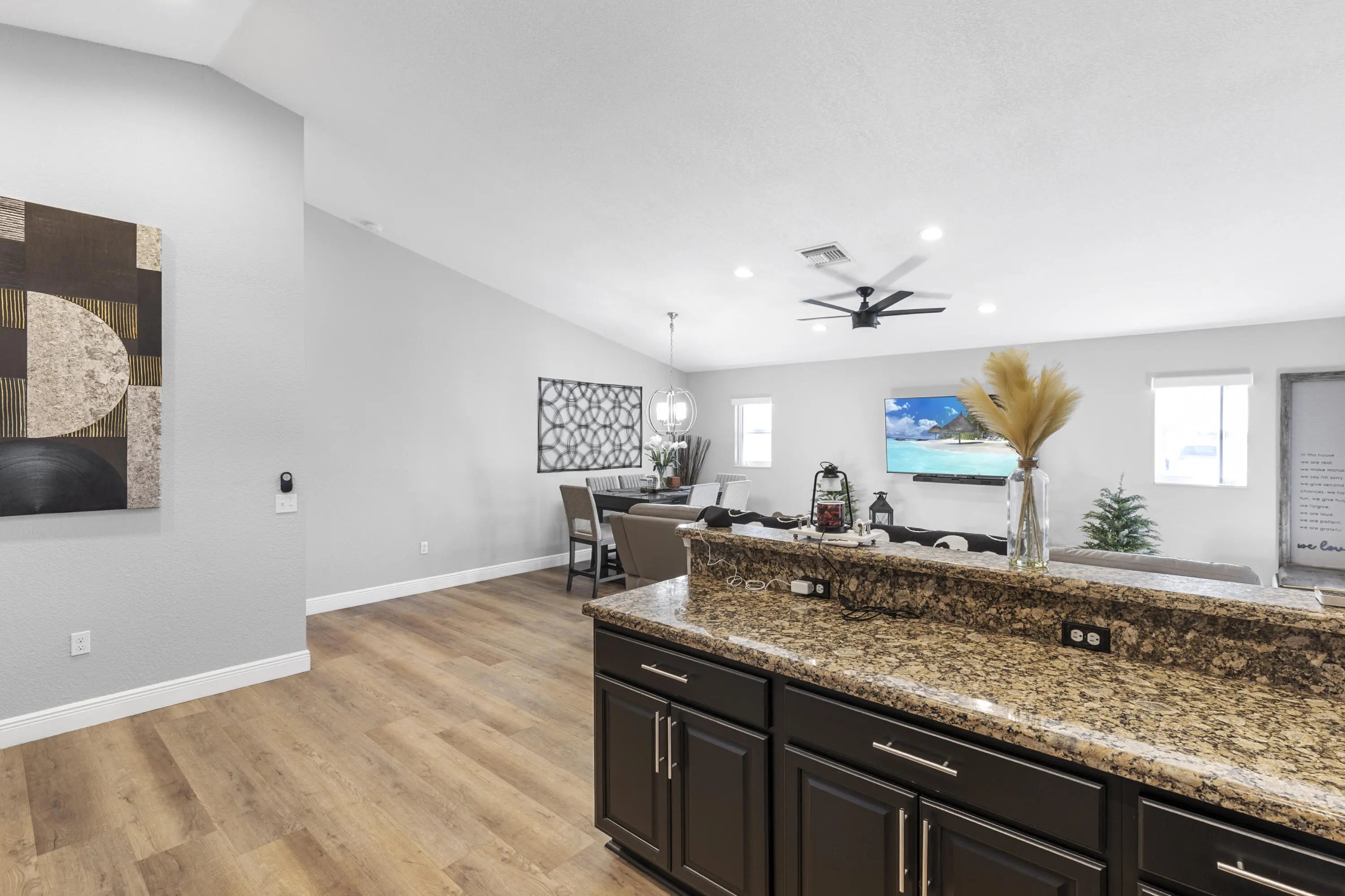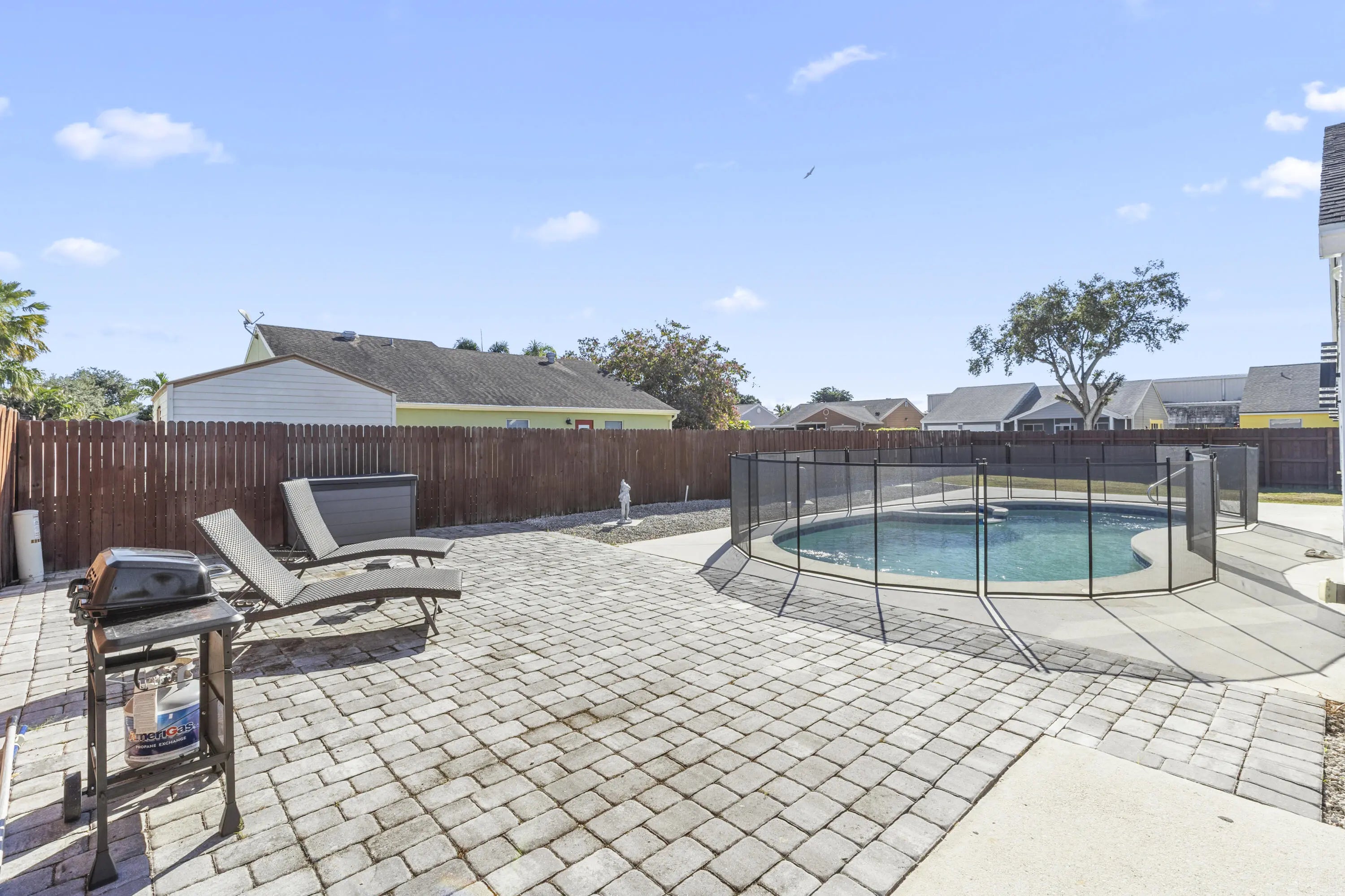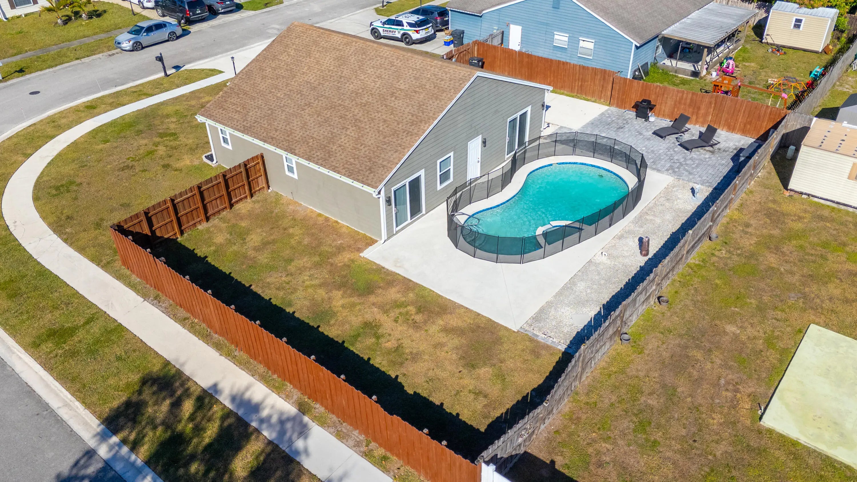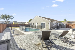 Rare oversized corner lot with pool in Country Lakes West! Upgraded contemporary home with 3 large bedrooms and 2 baths (3rd bedroom has no closet--easy to add).Open-concept layout with vaulted textured ceilings, high-hat lighting, textured walls, and brushed nickel finishes. Kitchen features granite counters and back splash, stainless steel appliances, and black cabinetry. LVP flooring throughout. Primary suite offers a custom closet by The Container Store. Backyard oasis with resurfaced pool (2023), mesh safety fence, white rock landscaping, and spacious brick paver patio. Extended driveway fits boat/RV plus 5-car parking. Screened front patio, impact windows/doors, 2015 roof & water heater, 2025 AC with 10year warranty,,new 2022 gutters.