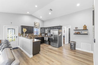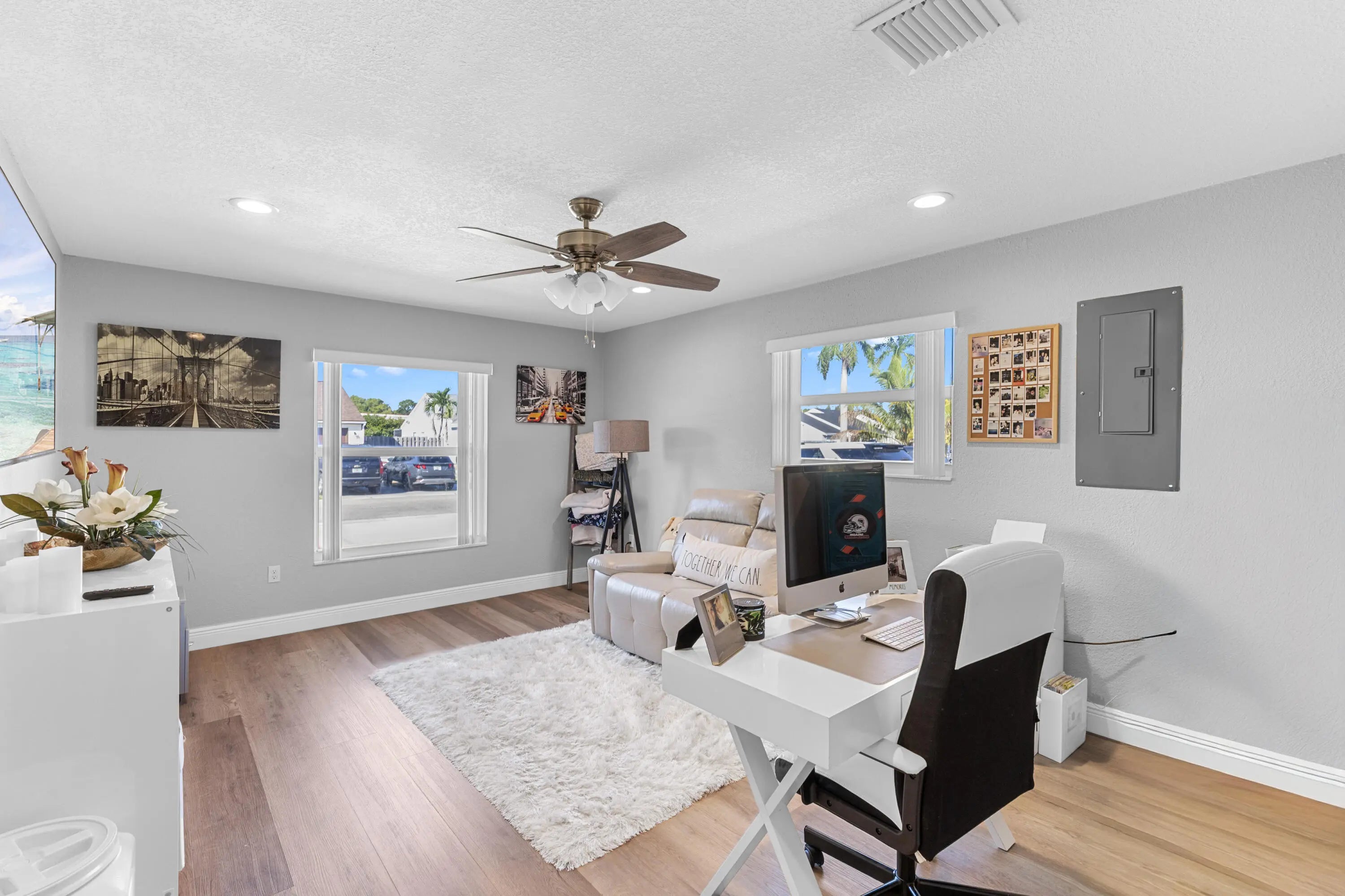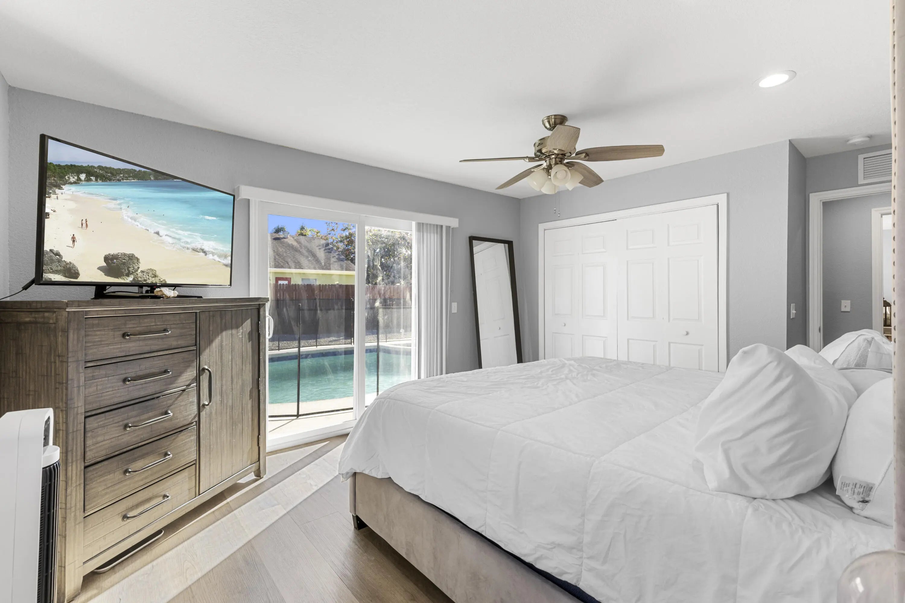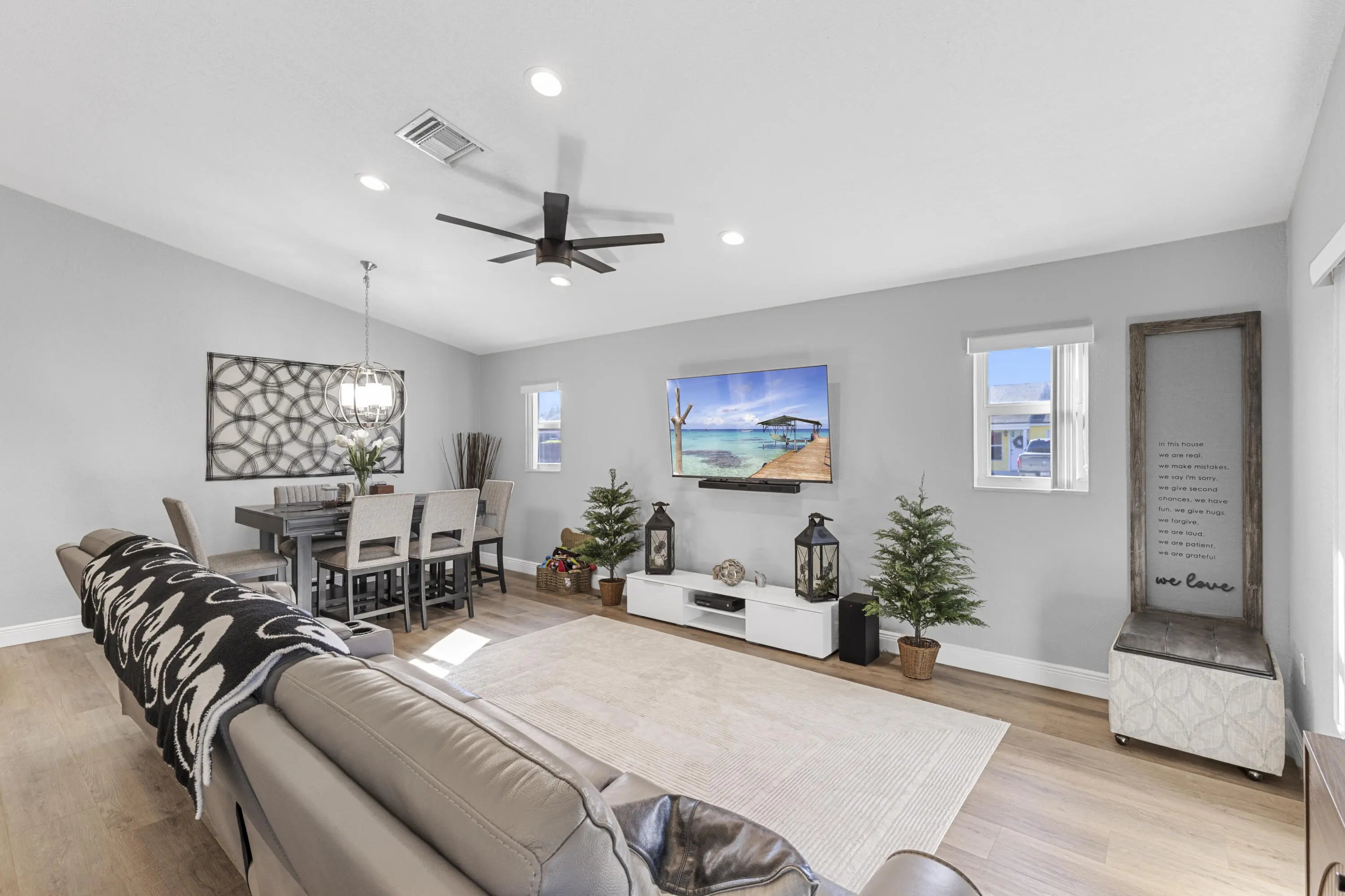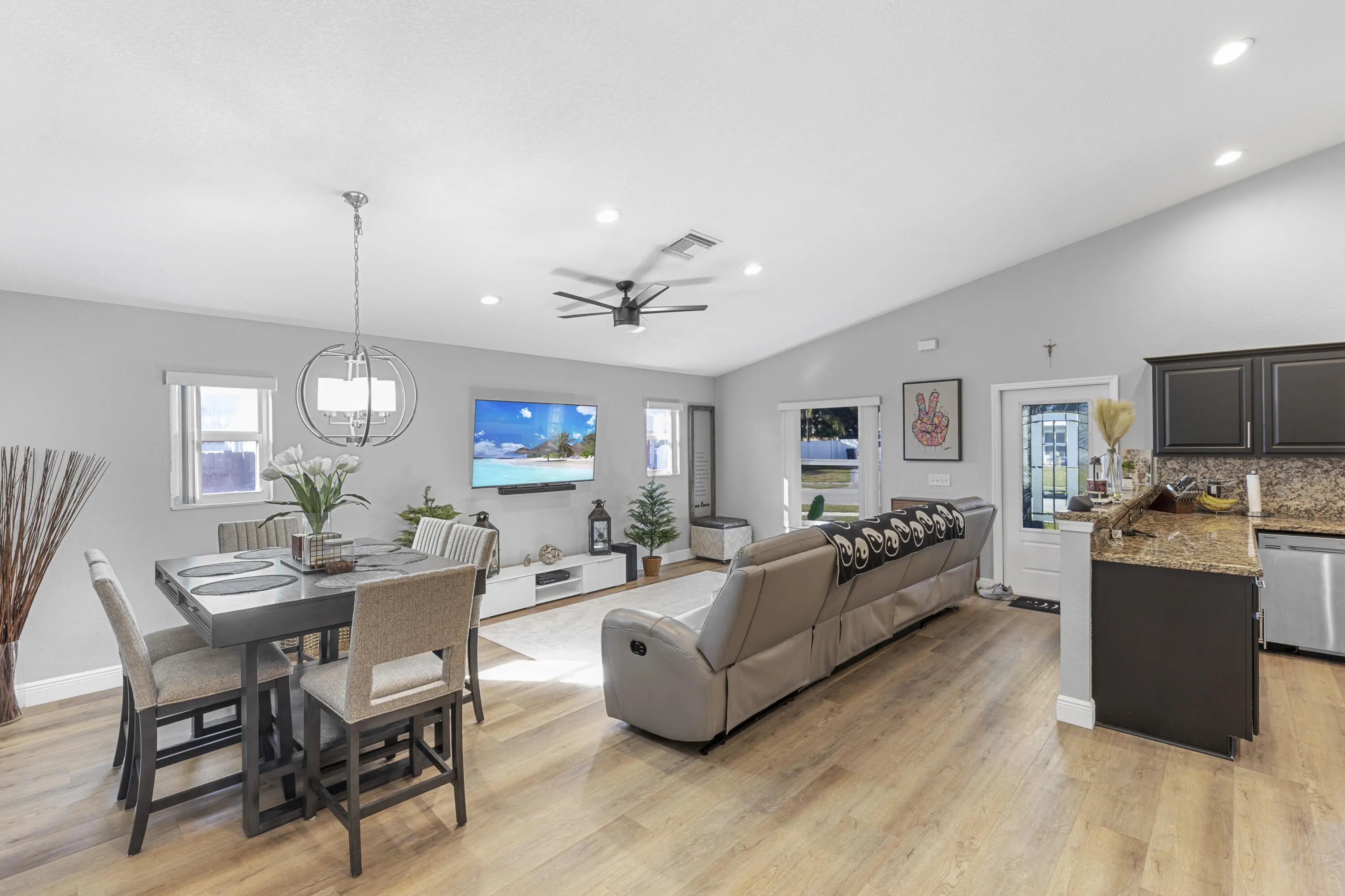 Rare oversized corner lot with pool in Country Lakes West! Upgraded contemporary home with 3 large bedrooms and 2 baths (3rd bedroom has no closet--easy to add).Open-concept layout with vaulted textured ceilings, high-hat lighting, textured walls, and brushed nickel finishes. Kitchen features granite counters and back splash, stainless steel appliances, and black cabinetry. LVP flooring throughout. Primary suite offers a custom closet by The Container Store. Backyard oasis with resurfaced pool (2023), mesh safety fence, white rock landscaping, and spacious brick paver patio. Extended driveway fits boat/RV plus 5-car parking. Screened front patio, impact windows/doors, 2015 roof & water heater, 2025 AC with 10year warranty,,new 2022 gutters.