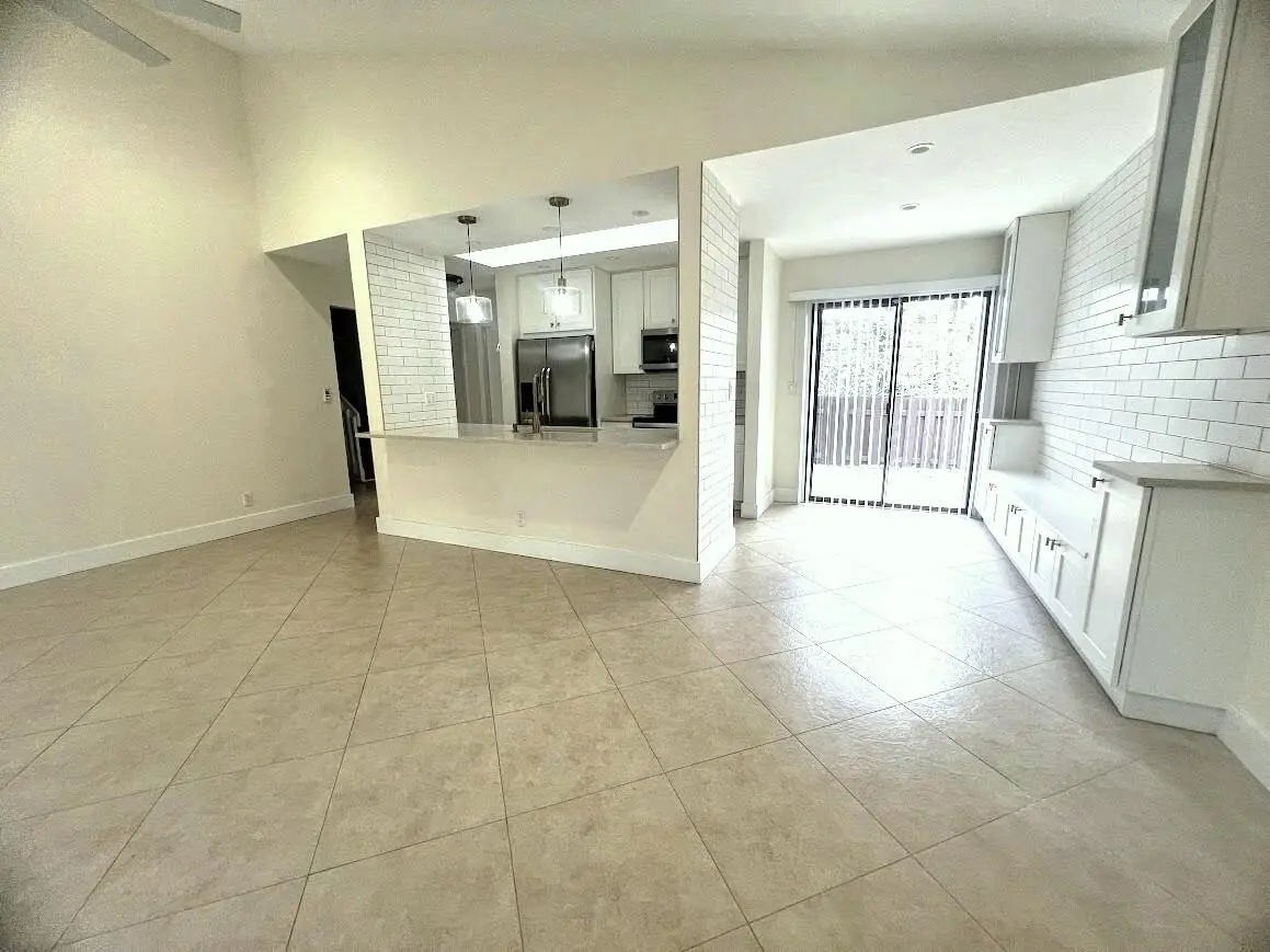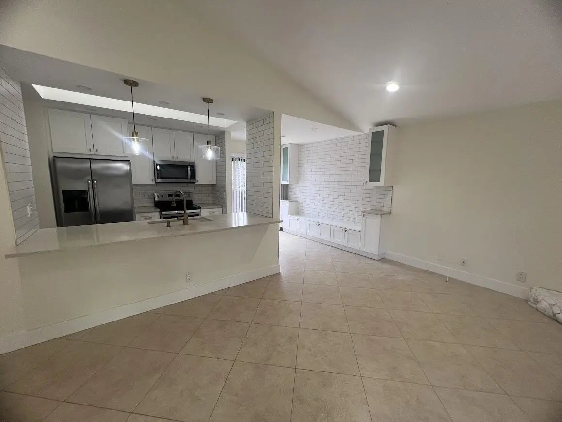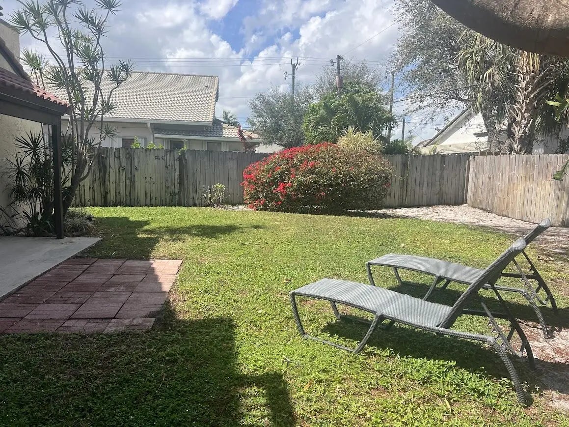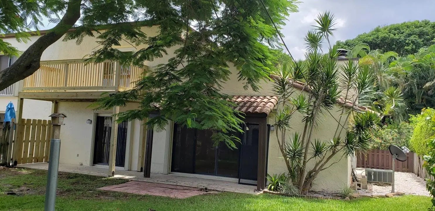 Stunning remodeled two-story townhome with a two-car garage in East Boca Raton. This home features a gourmet kitchen equipped with quartz countertops, custom cabinetry, stainless steel appliances, and an island. The spacious living room boasts vaulted ceilings, skylights, a stone fireplace, and tiled floors. Additional highlights include modern ceiling fans, glass pendant fixtures, LED lighting, and stylish bathroom vanities, mirrors, and showers. **There are two master suites: one upstairs with a sun deck and one downstairs with a patio, both featuring engineered hardwood floors..** Enjoy the sunshine and entertain guests in your super large fenced yard, complete with tropical trees and two patios. Dogs are allowed (no aggressive breeds or cats), and lawn care service is included. No HOA