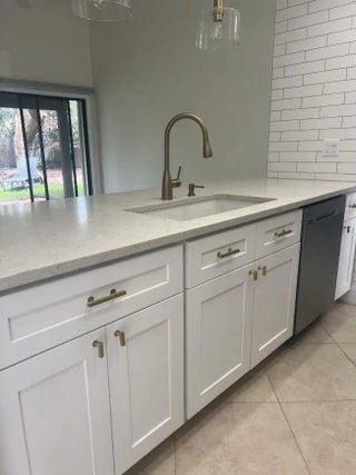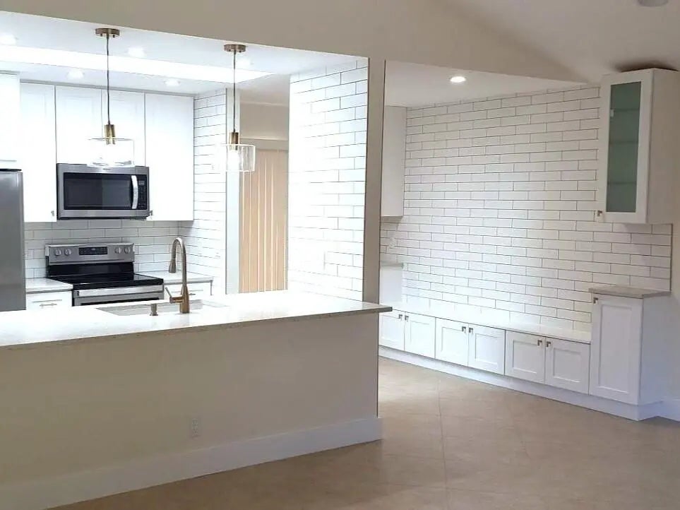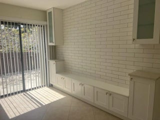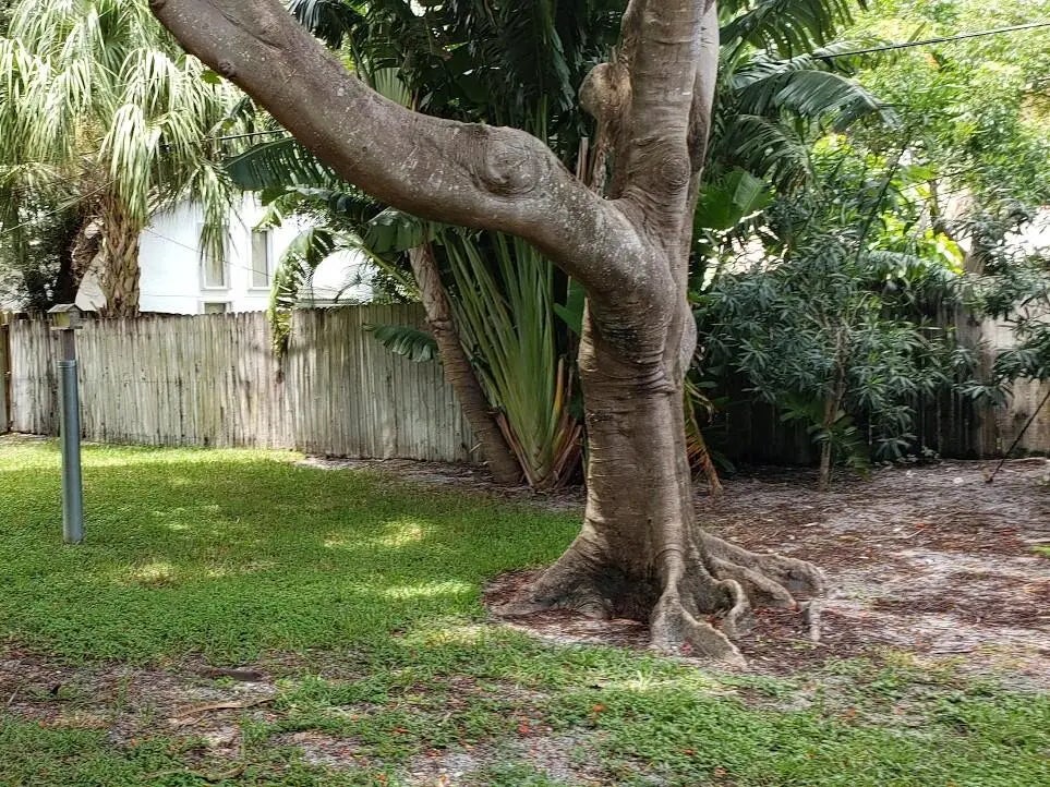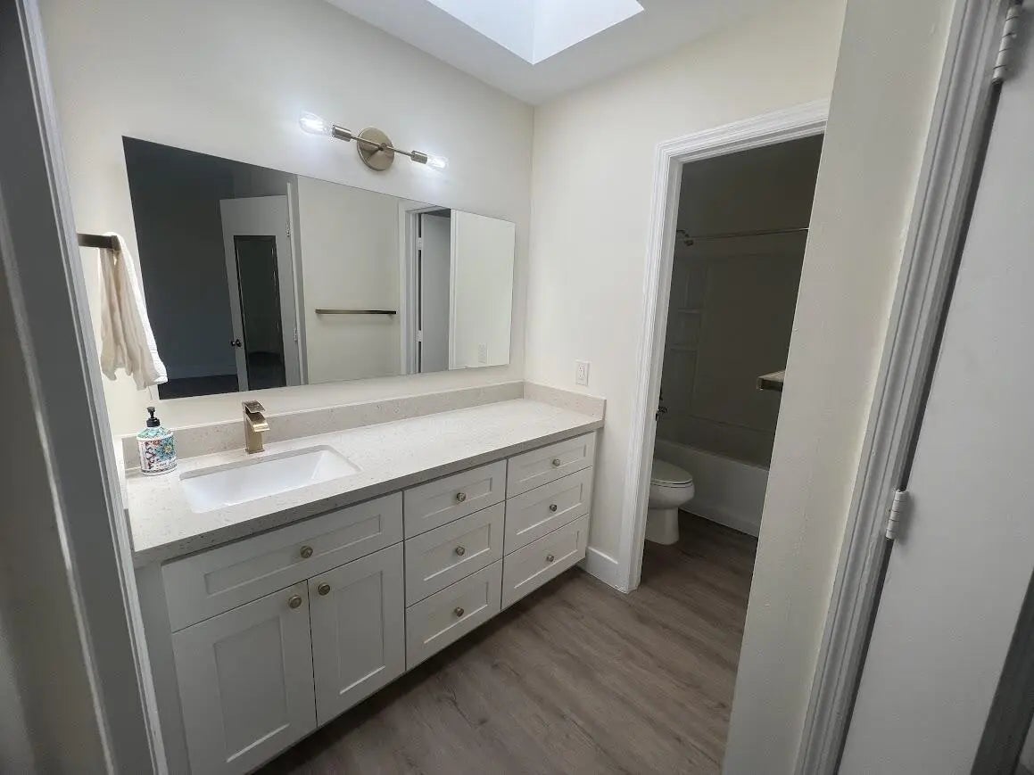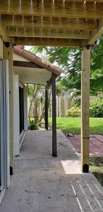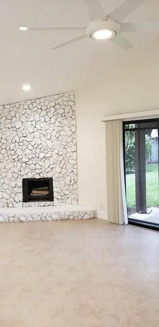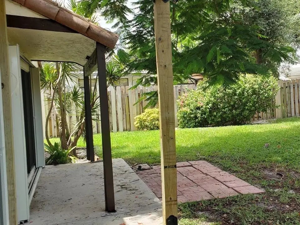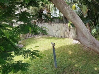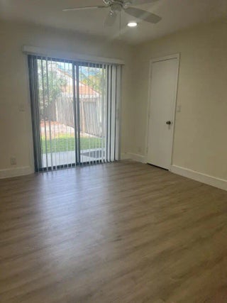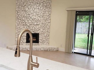 Stunning remodeled two-story townhome with a two-car garage in East Boca Raton. This home features a gourmet kitchen equipped with quartz countertops, custom cabinetry, stainless steel appliances, and an island. The spacious living room boasts vaulted ceilings, skylights, a stone fireplace, and tiled floors. Additional highlights include modern ceiling fans, glass pendant fixtures, LED lighting, and stylish bathroom vanities, mirrors, and showers. **There are two master suites: one upstairs with a sun deck and one downstairs with a patio, both featuring engineered hardwood floors..** Enjoy the sunshine and entertain guests in your super large fenced yard, complete with tropical trees and two patios. Dogs are allowed (no aggressive breeds or cats), and lawn care service is included. No HOA