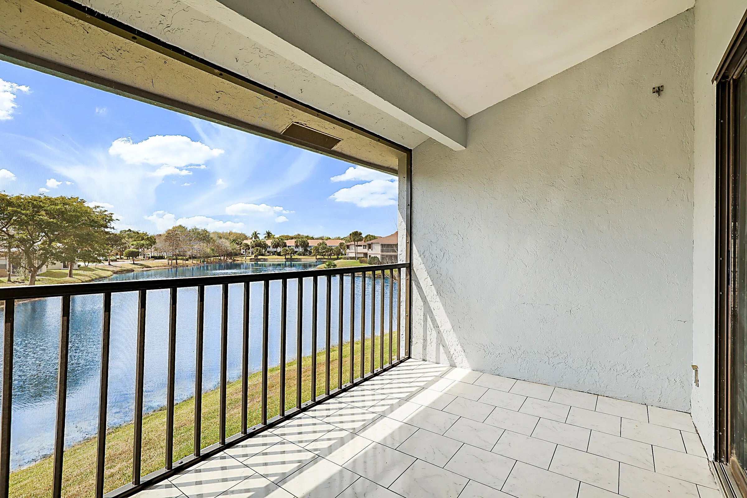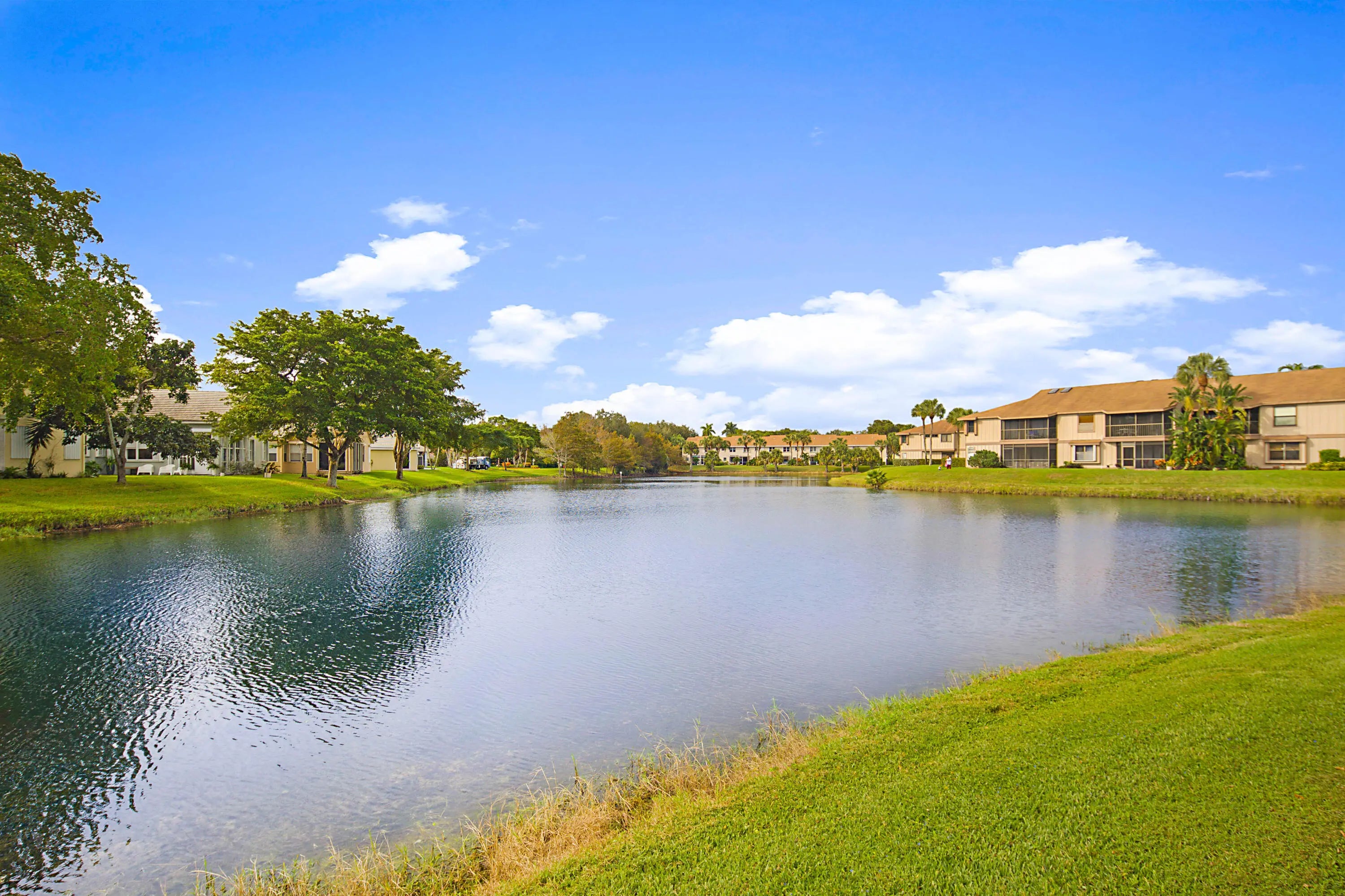 Welcome to this beautiful second-floor 2-bedroom, 2-bathroom condo featuring serene lake views. The light-filled, South-facing living area is bright and inviting, offering one of the finest lake views in the community. New laminate floors and fresh paint throughout. Located in River Bridge, a man-gated community with resort-style living. Enjoy 2 heated pools, a kiddie pool, playground, gym, hot tub, card room, 6 tennis courts, 2 shuffleboard courts, & a bocce ball court, a Performance center & Activities Center! Located conviently nears shopping, parks, beaches and the airport.