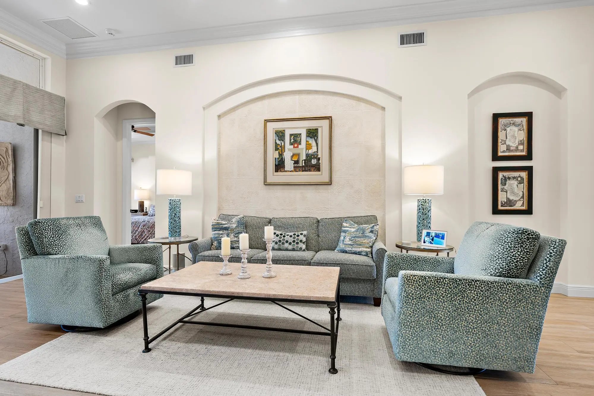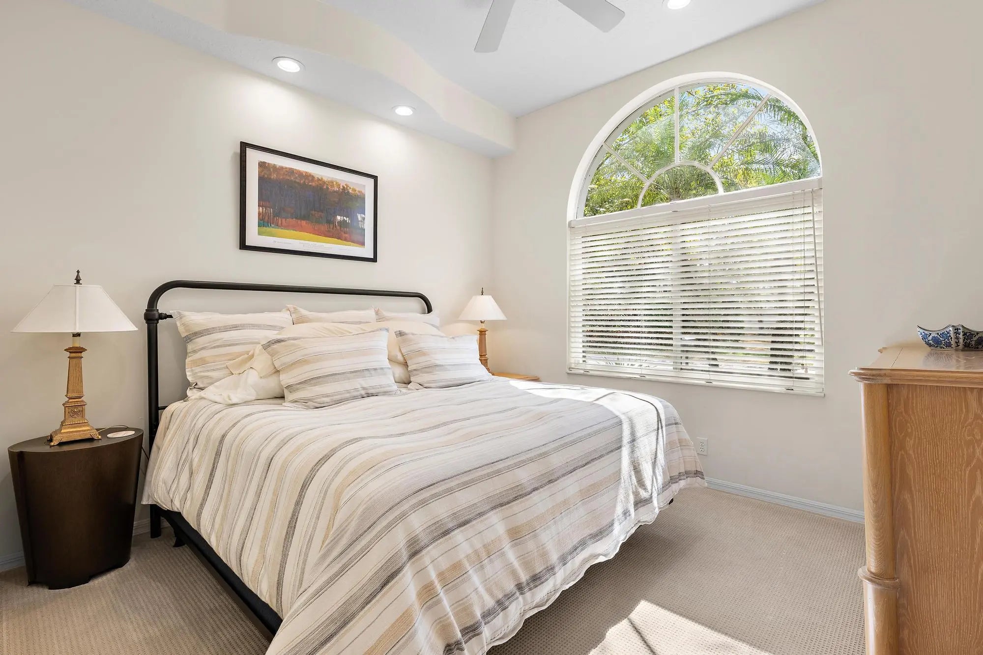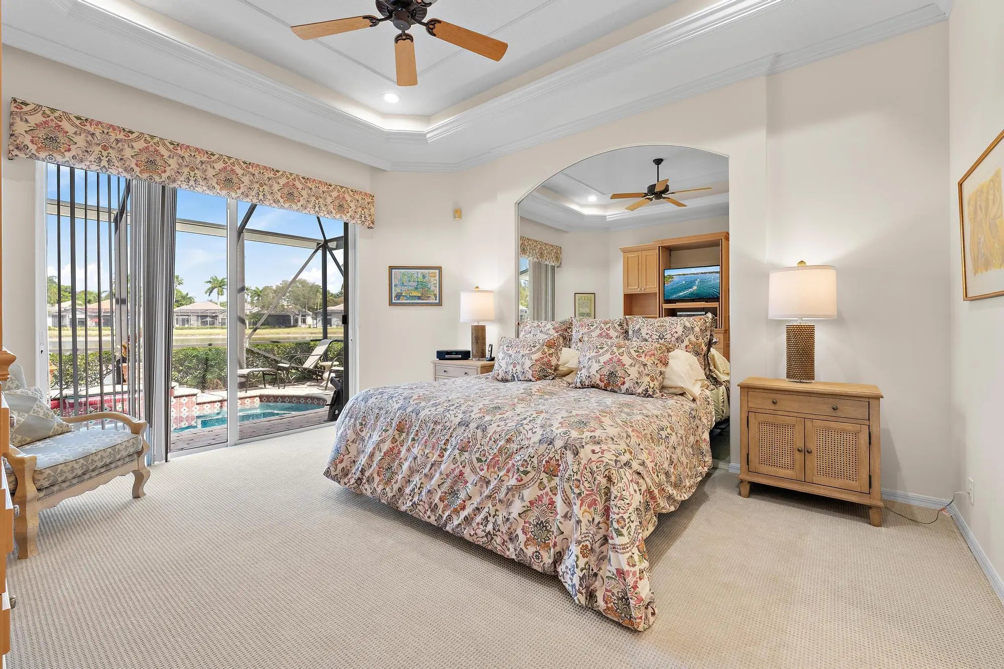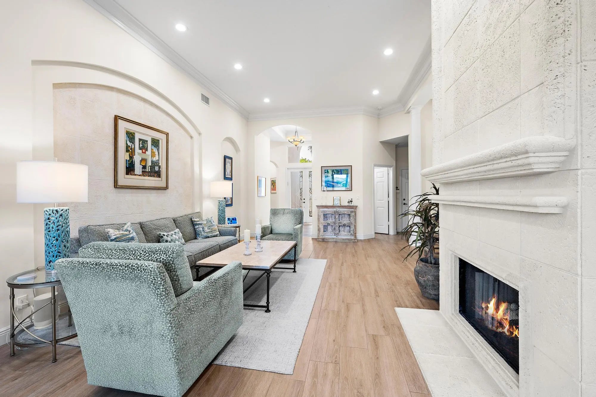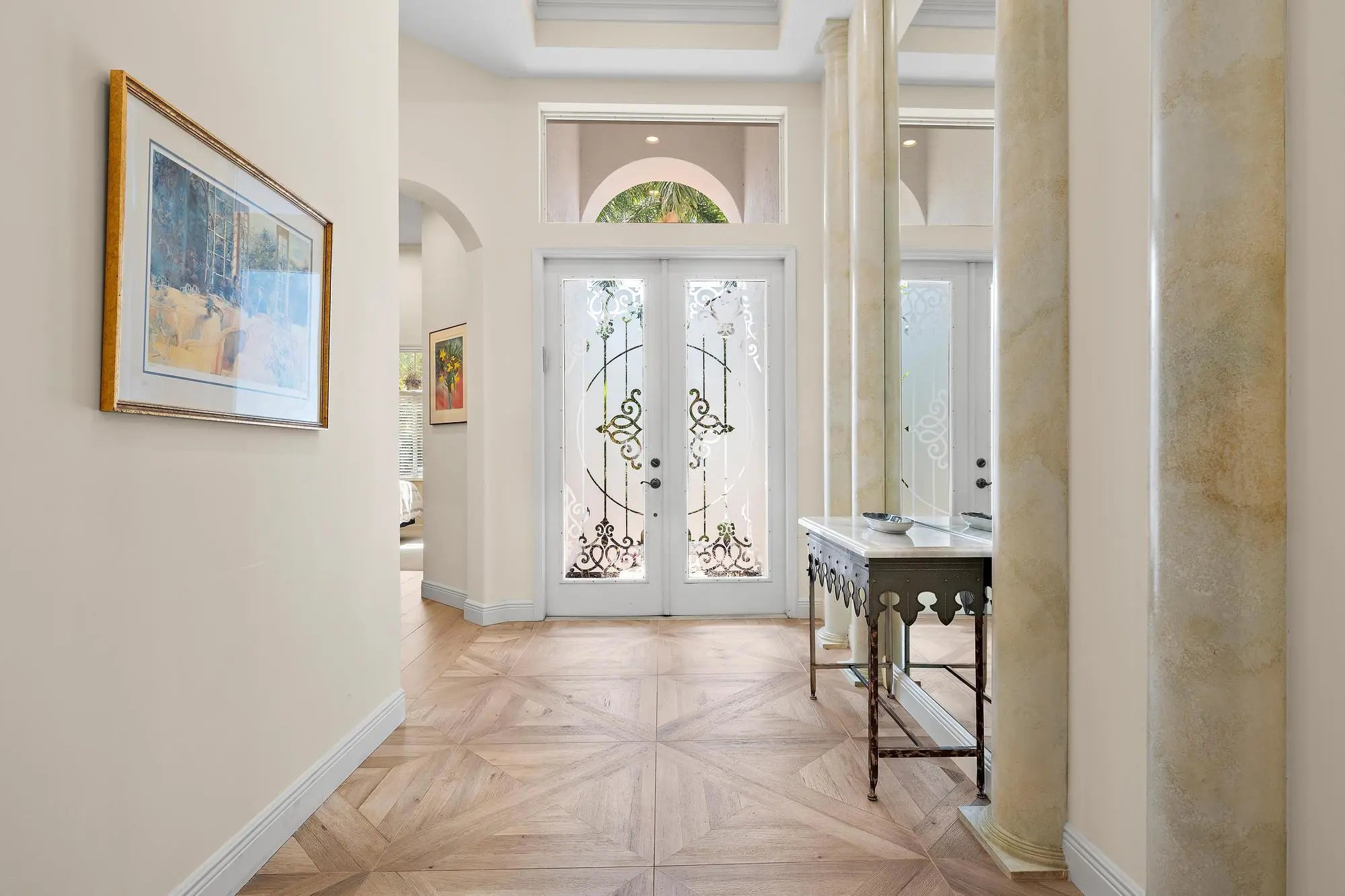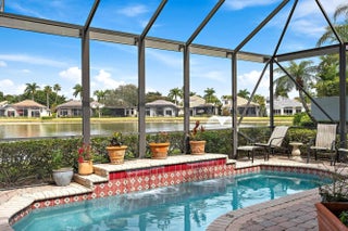 This stunning and elegant former builder's model, one-story lakefront residence has been extensively upgraded and thoughtfully enhanced, offering timeless architectural detail paired with meaningful, high-value improvements. Major infrastructure updates include a 2018 roof with transferable warranty, a 2022 AC system with 10-year warranty, and a comprehensive 2024 HVAC redesign creating a true two-zone system with dedicated climate control and private thermostat for the primary suite. Soaring ceilings layered with crown molding, stately columns, built-in mirrors, box-beam detailing, and custom millwork reflect the elevated craftsmanship of a former model home. Wood-look porcelain tile flooring installed in 2017 enhances the main living areas, while 2024-2025 interior improvements include new kitchen and bathroom countertops, new sinks and faucets throughout, factory-refinished kitchen cabinetry, new LED ceiling lighting, a new powder room vanity with updated fixtures and designer wallpaper, and a new over-the-range oven/microwave/air fryer combination creating a true two-oven kitchen. Three bedrooms received new carpeting in 2023, and much of the interior was repainted in 2023, followed by a full exterior repaint in 2024. The cast stone gas fireplace anchors the living room, and expansive sliders open to the screened lanai where a heated pool with waterfall overlooks wide lake views and a beautifully illuminated fountain. In 2025, a new compressor and fan were installed for the primary bedroom AC. Additional significant upgrades include a 2023 pool heater, 2025 gas fireplace insert with remote control, 2025 outdoor gas grill, and ongoing mechanical refinements that ensure comfort and reliability. Sliding doors, screens, and lanai components were serviced in 2024. Located in The Grande, the only single-family enclave in Ibis offering residents exclusive use of its own private community pool, this residence also provides access to the Club's 90,000-square-foot clubhouse, three Nicklaus-family championship golf courses, dining, fitness, spa, and premier racquet facilities. IBIS MEMBERSHIP FEES ARE INCREASING. BUYERS WHO GO UNDER CONTRACT BY APRIL 1, 2026 AND CLOSE BY JUNE 12, 2026 CAN SAVE A MINIMUM OF $30,000.