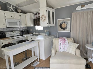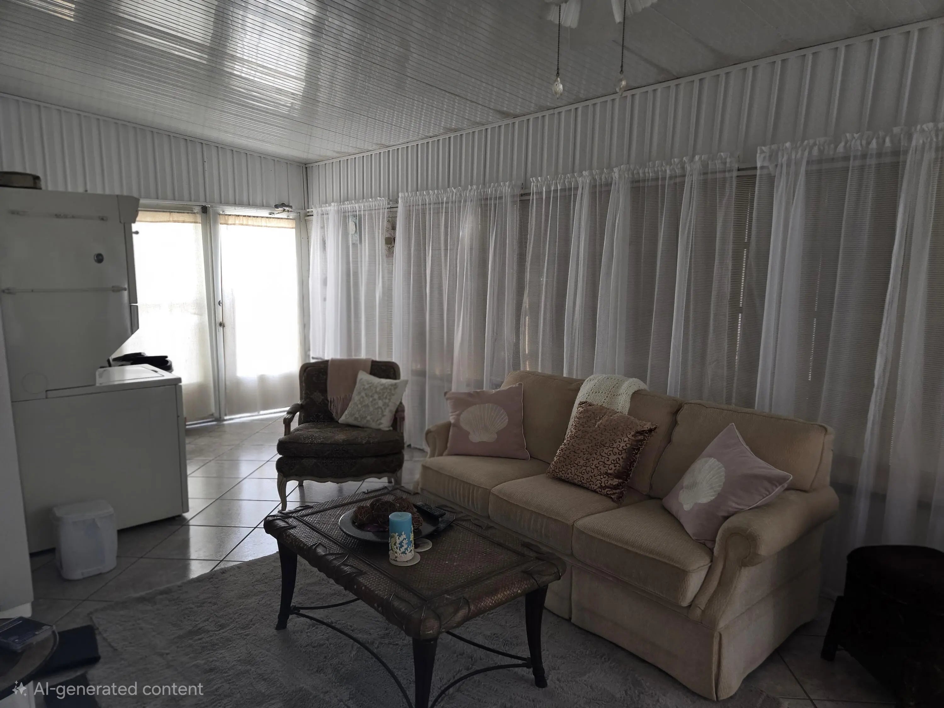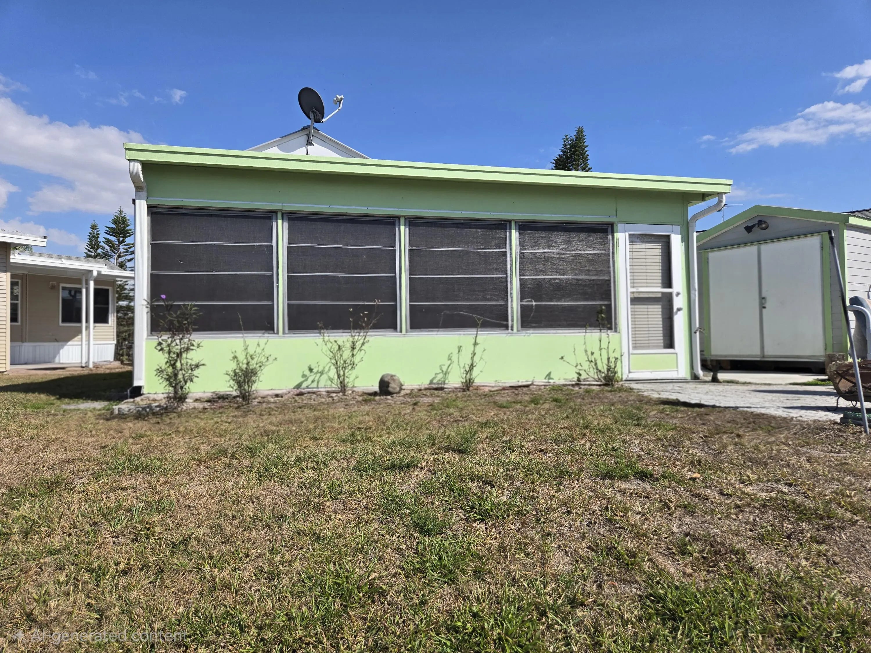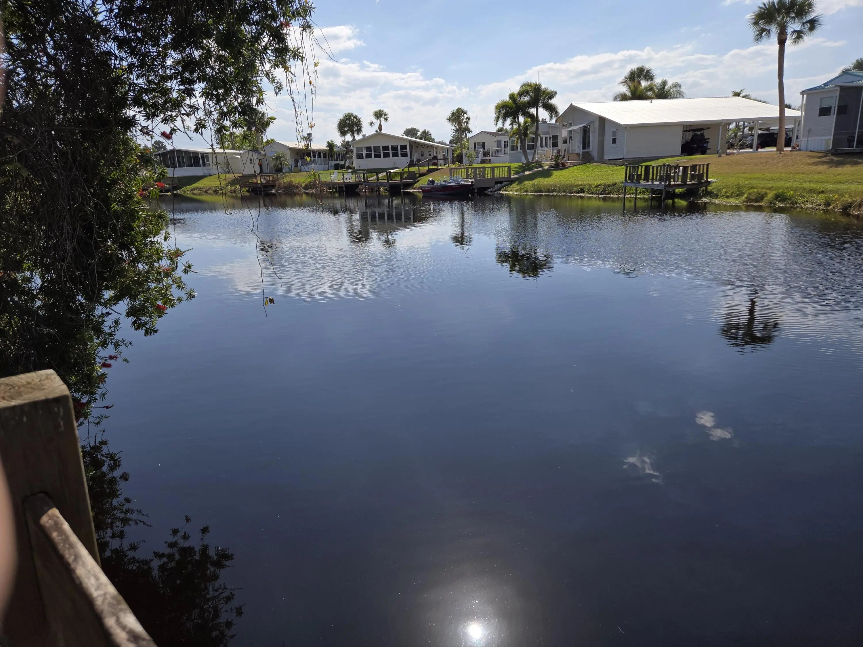 BLUE CYPRESS - Waterfront 2 bdrm/1 ba home with spacious 13' x 9'7'' Florida Room that adds versatility of guest suite, 2nd bdrm, or additional living space. Possibilities are endless. Home is partially furnished. Main living area is open to kitchen with wood floors. Kitchen features pantry for additional storage. Home has a reverse osmosis system. Step out onto the deck for beautiful sunrise/sunset views. Lake provides access to Lake Okeechobee. Storage shed provides perfect space for storage and workshop. This one is priced to sell! Perfect location for golfers and boating enthusiasts. Dock space & boat ramp available. Community offers newer pickleball court, clubhouse, shuffleboard and pool. Measure for room size accuracy