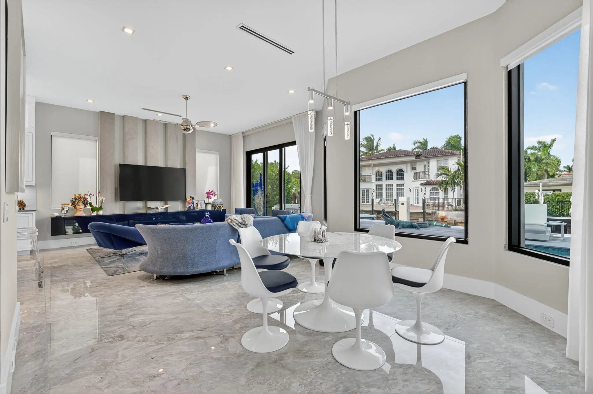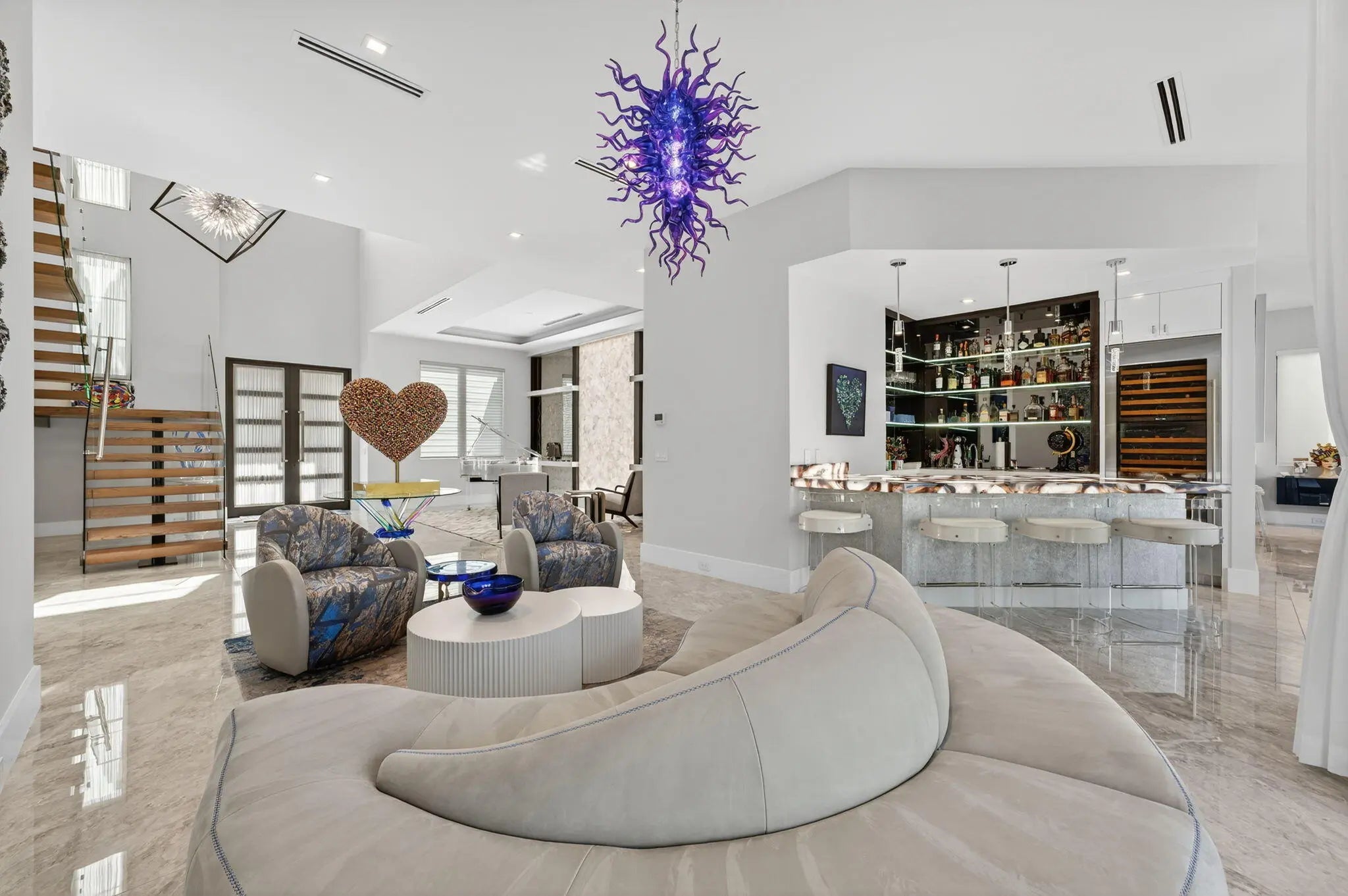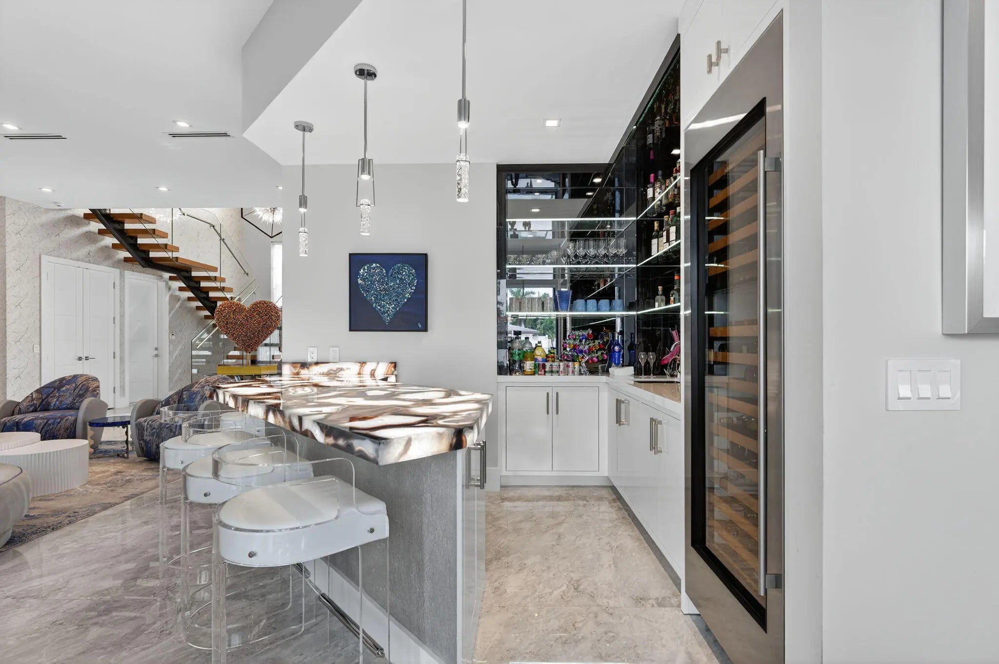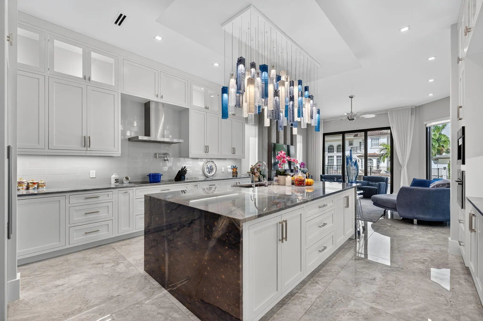 Exquisite Waterfront Estate with Unrivaled Luxury Finishes. Experience modern waterfront living in this magnificent newer-construction residence, showcasing a brand-new seawall and extraordinary high- end craftsmanship. Upon entry, you're greeted by a dramatic illuminated marble feature wall and custom floating staircase--a stunning architectural centerpiece. The open-concept living spaces are highlighted by designer fixtures, impact-resistant windows, doors, and garage doors. 3 Carrier Infinity A/C systems for ultimate climate control. The chef's dream kitchen is a masterpiece featuring all Miele appliances, including oversized refrigerator units, two dishwashers, double ovens, speed oven, built-in coffee maker, pot filler, and induction all surrounded by exquisite custom cabinetry. Adjacent, a built-in beverage station with four Sub-Zero fridge drawers and a custom light-up marble bar with Sub-Zero wine storage make entertaining effortless. Enjoy cinematic experiences in the custom media room/theater, complete with a 7" marble fireplace, cabana bath, and designer lighting. Each en-suite bedroom offers a custom walk-in closet, with finishes such as Italian 48x48 porcelain flooring and 9.5" wide French oak engineered wood floors. The primary suite is an elegant retreat, featuring a private office, built-in dressers with artistic marble tops, additional custom closets, dual Toto toilets, a double shower, freestanding soaking tub, and a pink quartz light-up vanity. Outdoor living is equally spectacular: an outdoor kitchen, turf yard, and resort-style pool (40x14) with Champagne Spa surrounded by marble pavers and lush new palm landscaping. Additional features include an elevator, whole-house generator, and extensive custom built-ins throughout. This home redefines waterfront luxury, a must-see masterpiece for the discerning buyer.