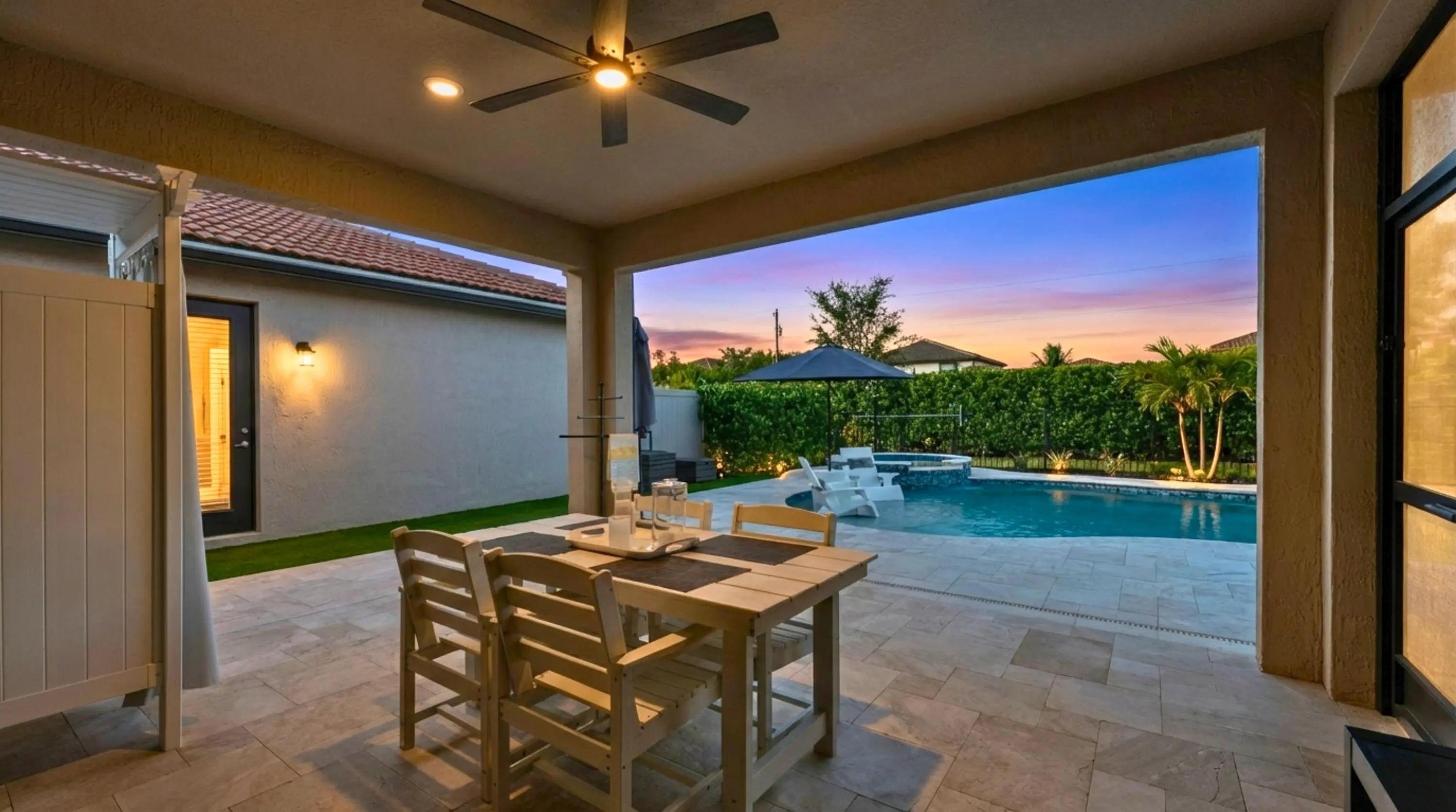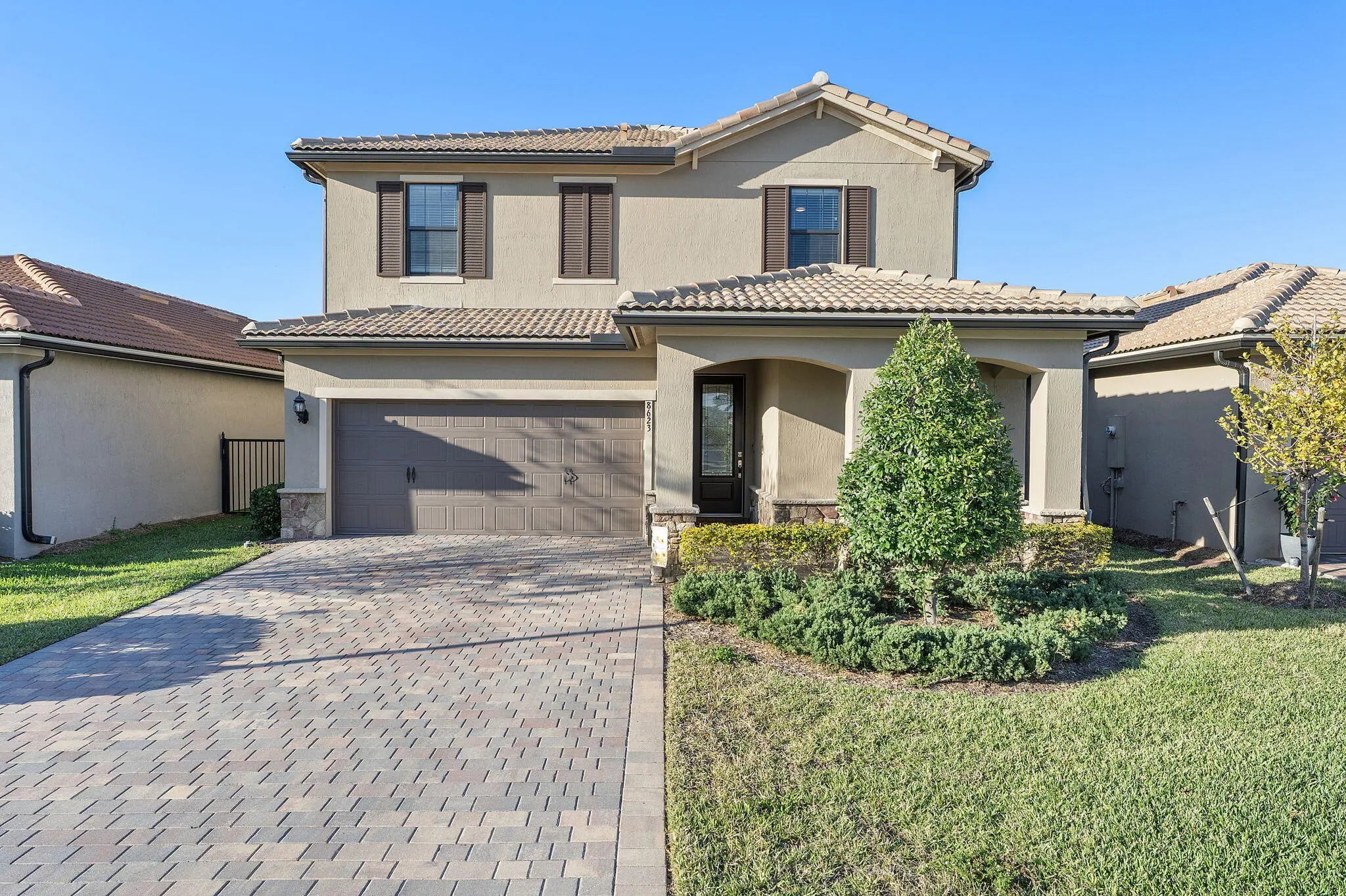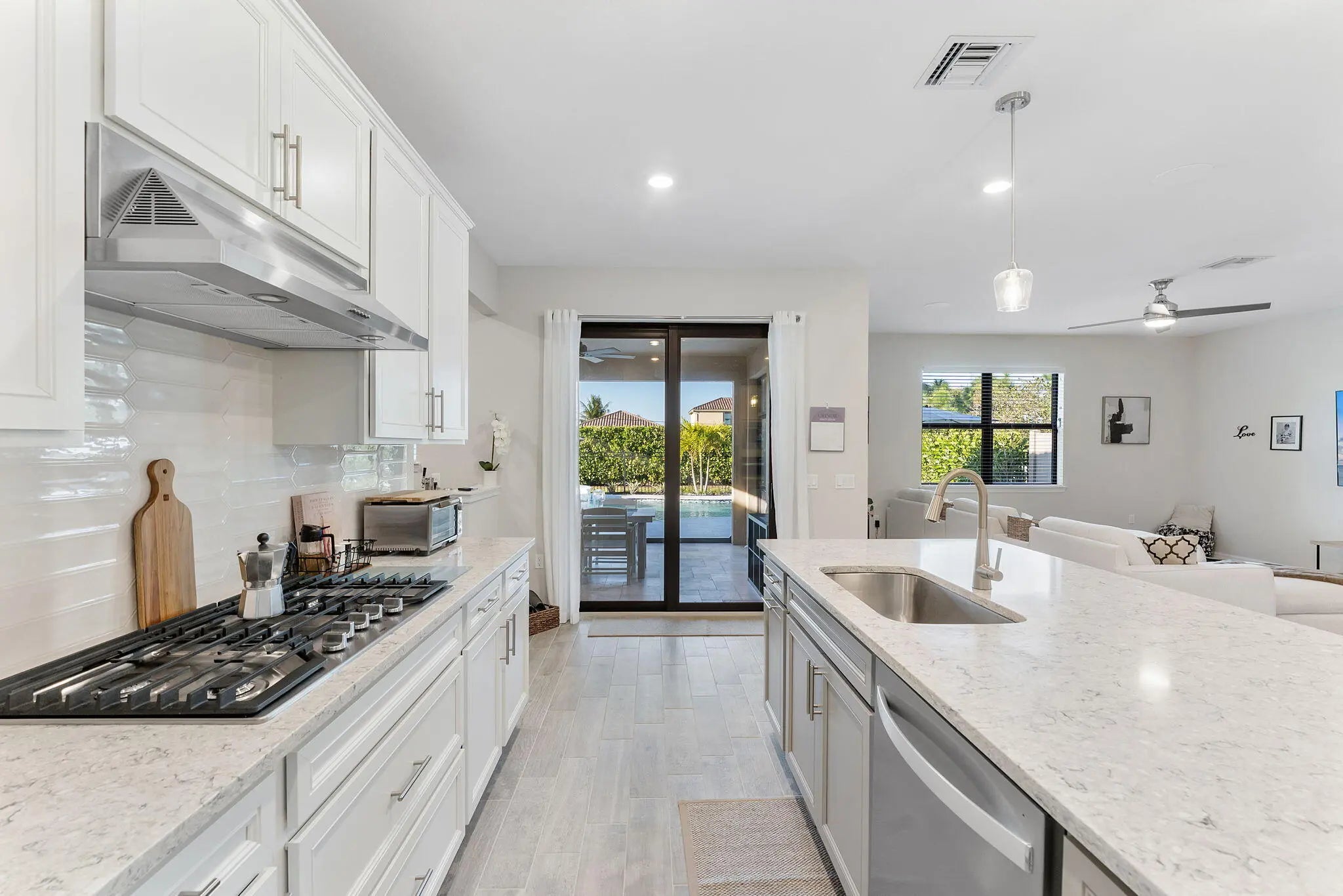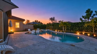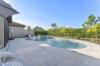 Introducing a stunning residence in the gated community of The Fields. This sought-after Fifth Avenue model by DiVosta features 3 bedrooms plus a den and loft, 2.5 baths, and a two-car garage, with an option to convert to a 4-bedroom home. Enjoy a beautifully landscaped exterior and a welcoming entry. Inside, the light-filled space showcases wood-look tile flooring and premium finishes. The outdoor area boasts a covered lanai with an electric screened enclosure, a heated saltwater pool and spa, and custom landscaping. The open-concept living area includes built-in Sonos speakers, while the stylish kitchen features a large quartz island and stainless steel appliances. The primary suite offers a luxurious spa-like bathroom. Upstairs are two additional bedrooms, a dual-sink bath, and a spacious loft. The home is fully wired for high-speed internet and includes advanced tech features. Residents enjoy two clubhouses with pools, fitness centers, and tennis courts, conveniently located near the Turnpike, airport, dining, and shopping, combining luxury and convenience.